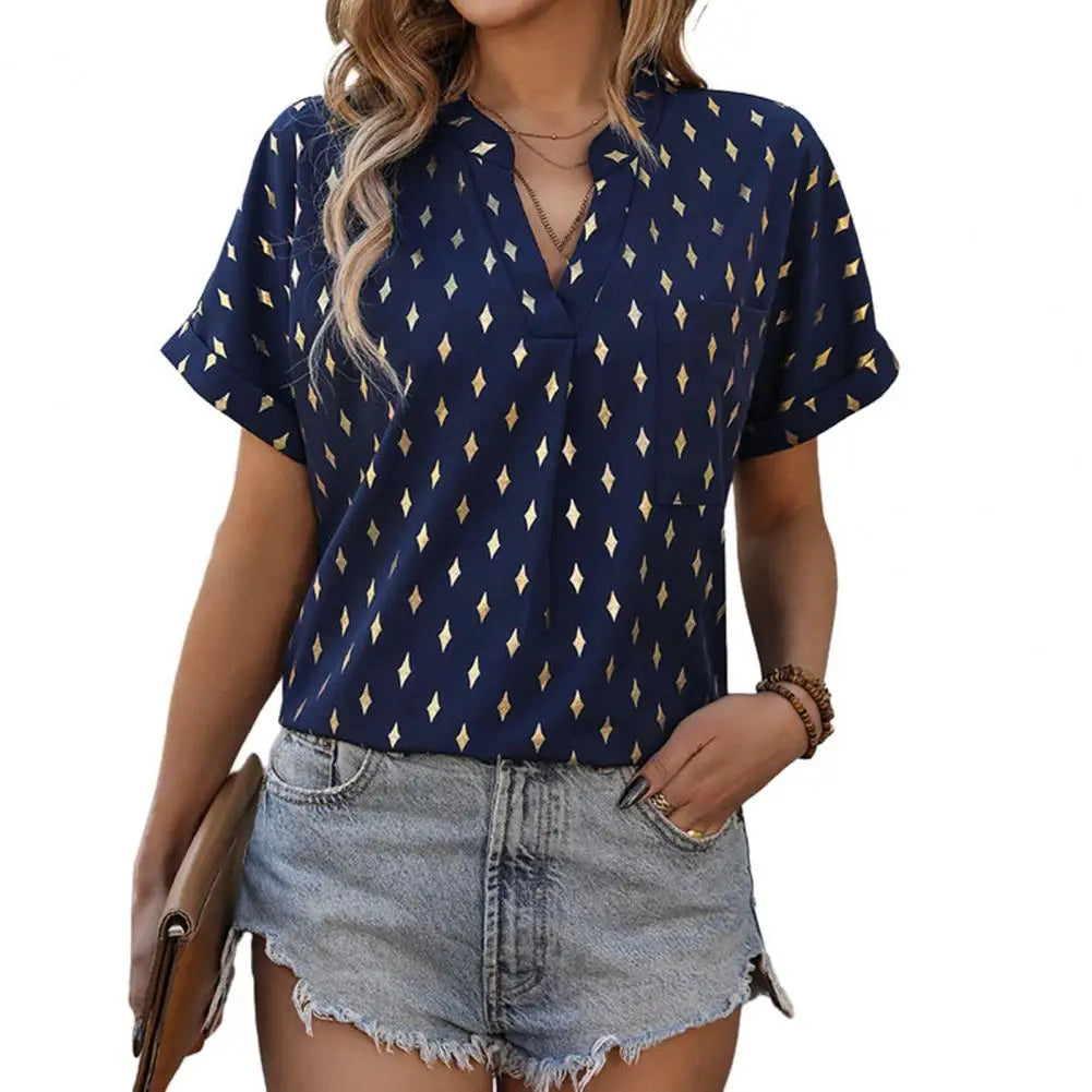 Women Shirt V-Neck Short Sleeve Tunic Loose Fit Breathable Blouse