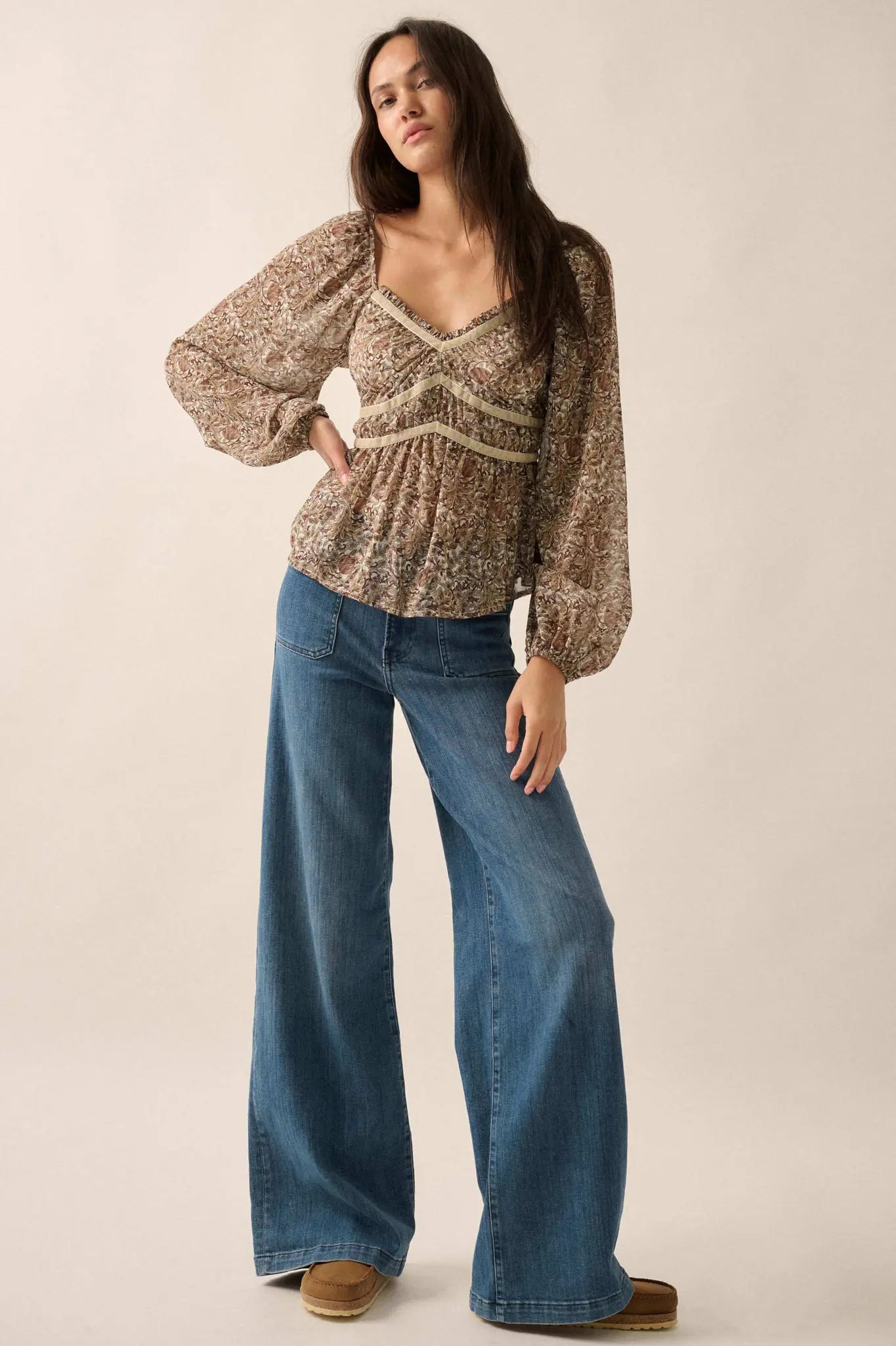 • Floral-print chiffon peasant blouse.