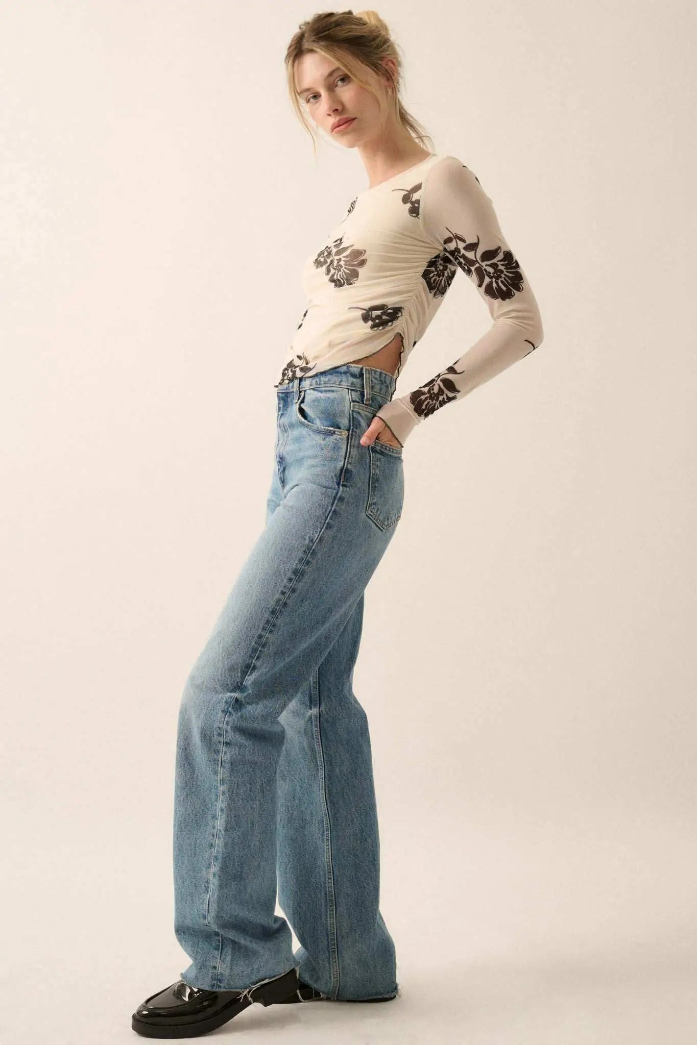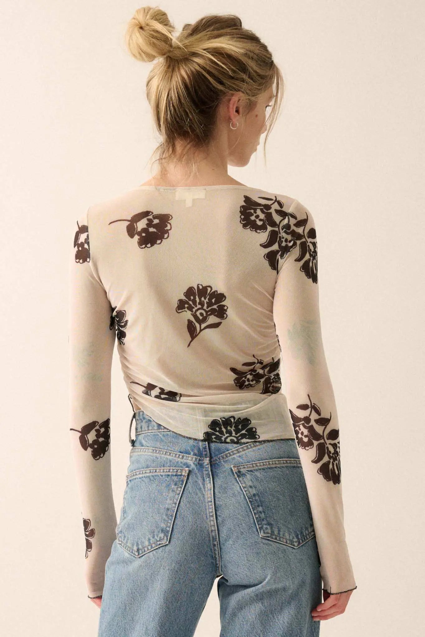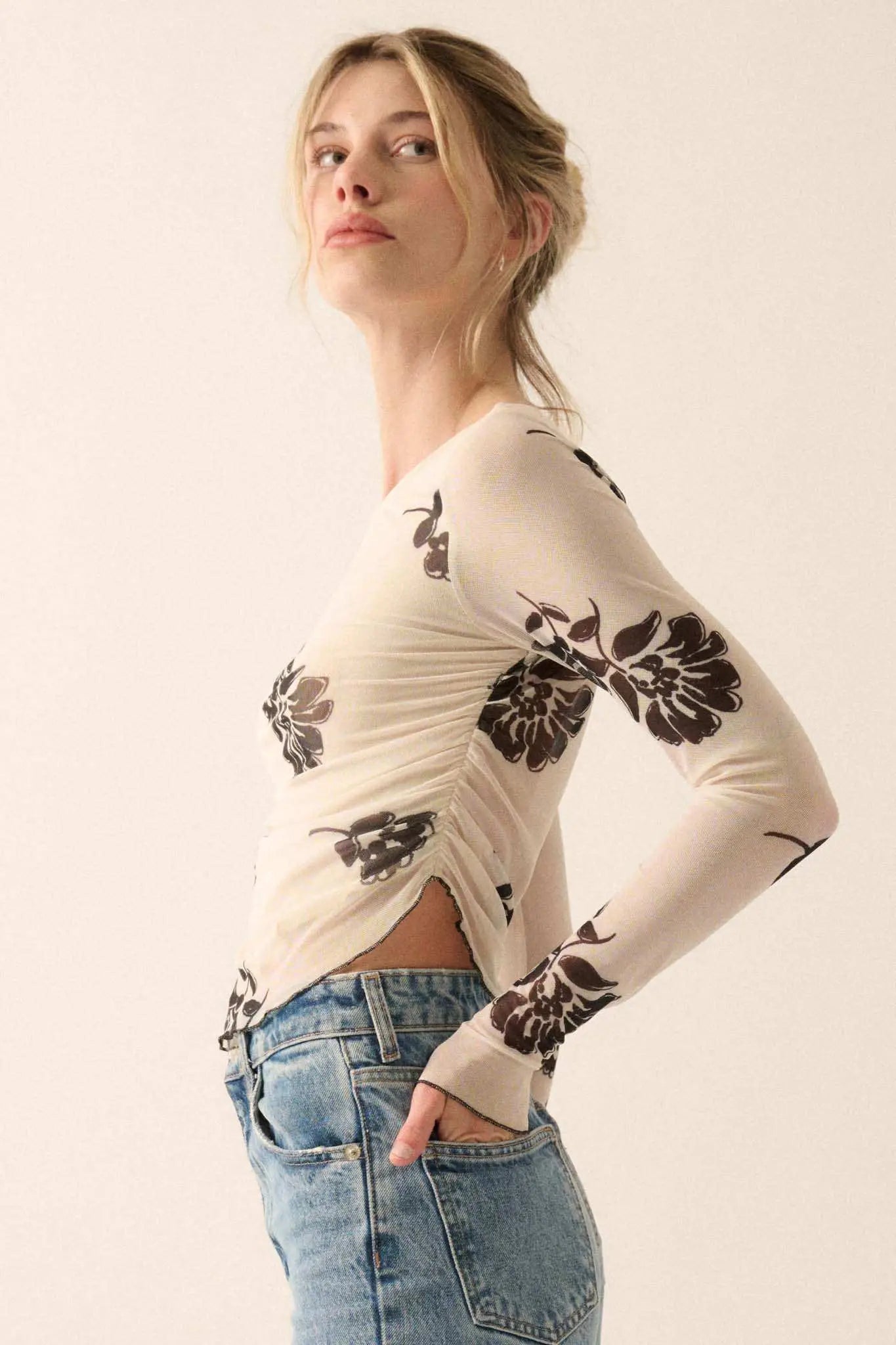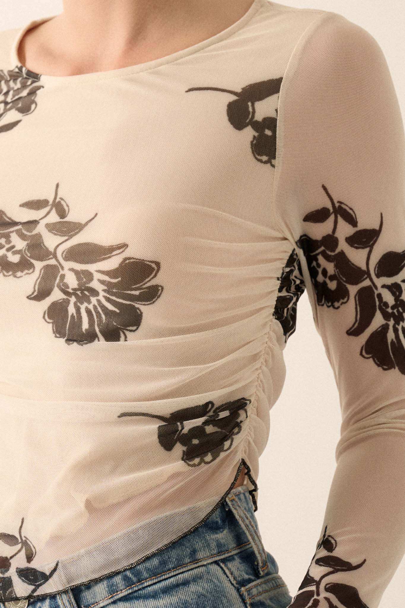 Deco Garden Floral Mesh Ruched Asymmetrical Top