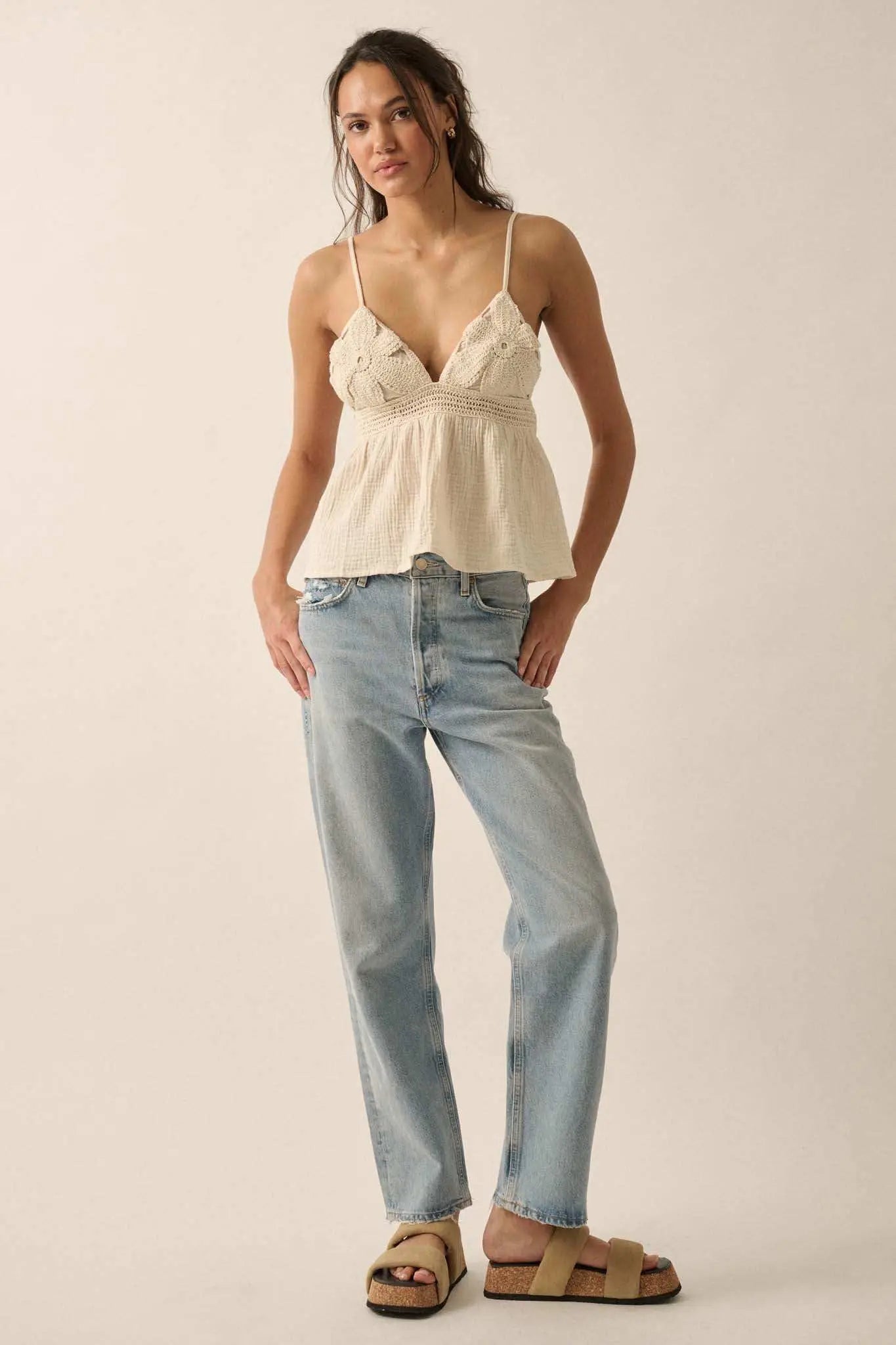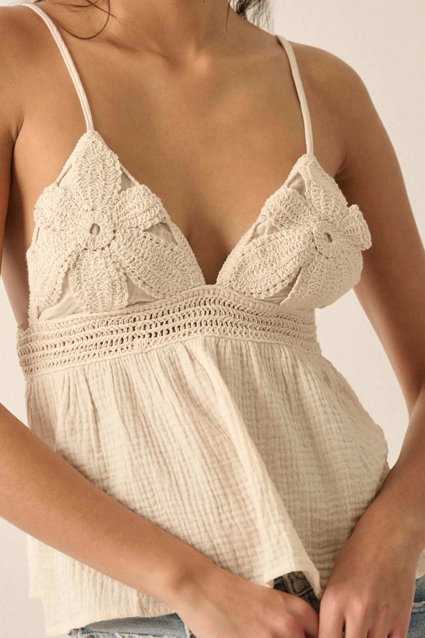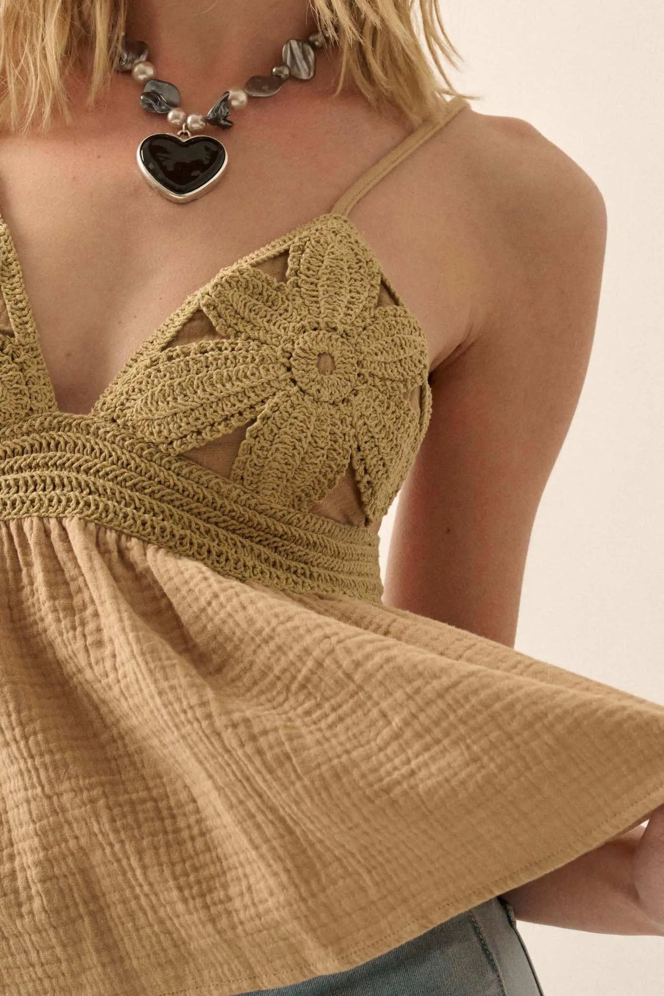 Lacy Days Crochet-Trim Crinkle Cotton Babydoll Top