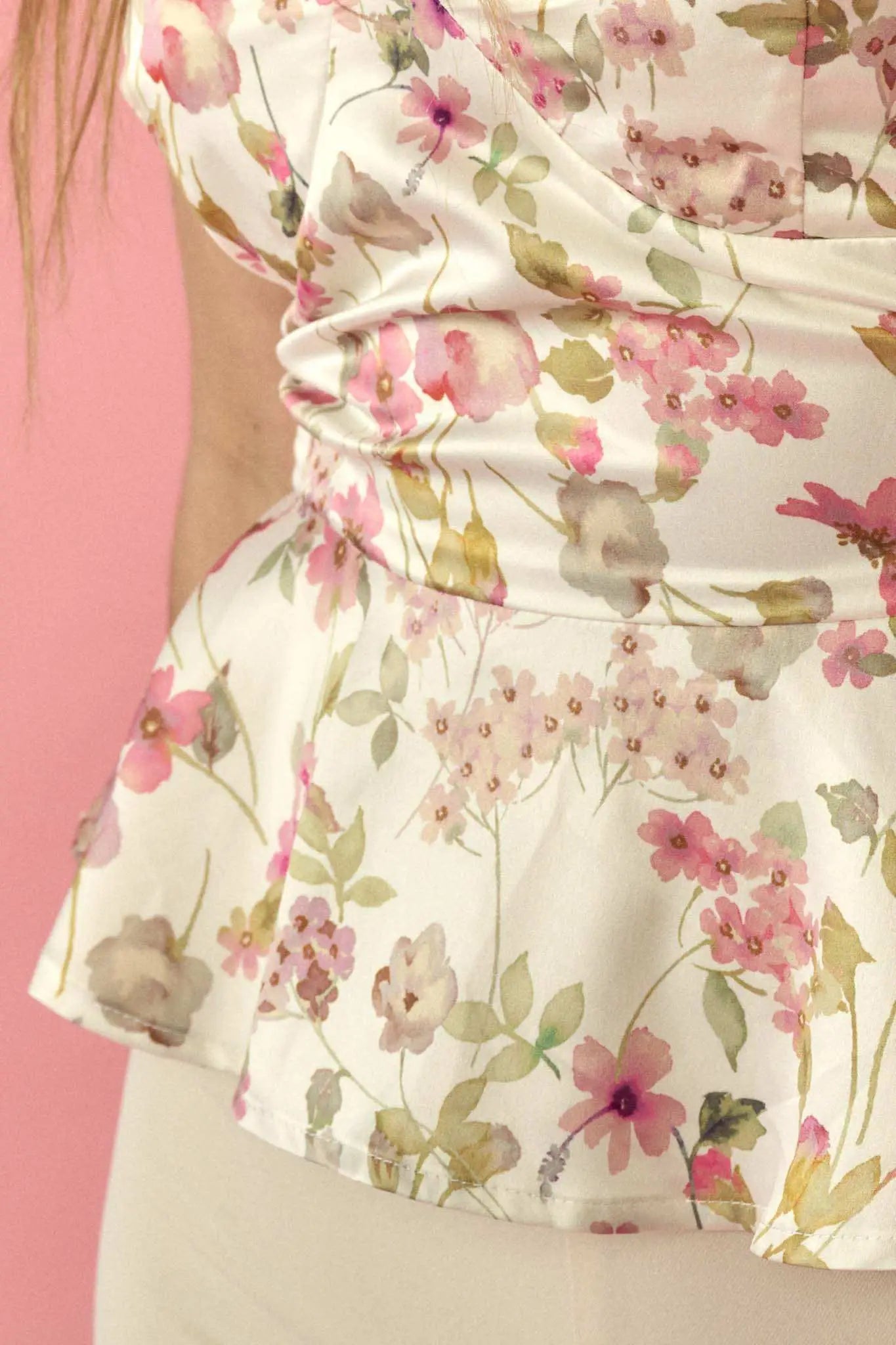Satin Blooms Floral Satin Peplum Halter Cami Top