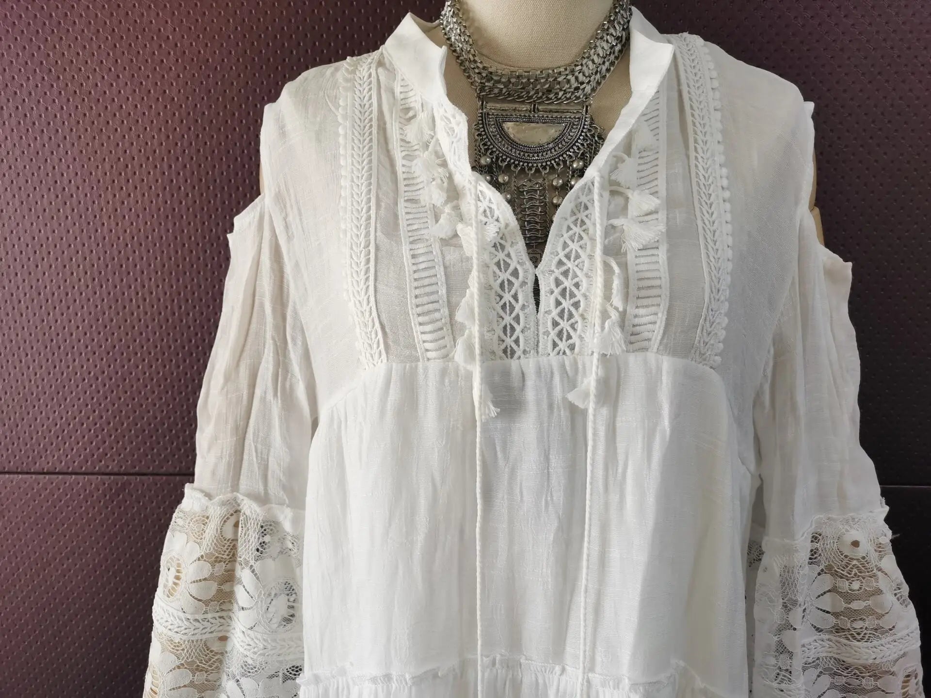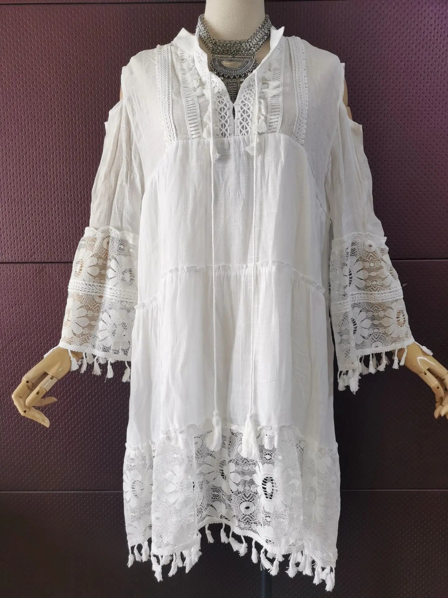 FashionSierra-Vintage Long Sleeve Mini Women Beach Wear Deep V Tassel Summer 2025 Floral Embroidery Lace Vestidos Boho Dress