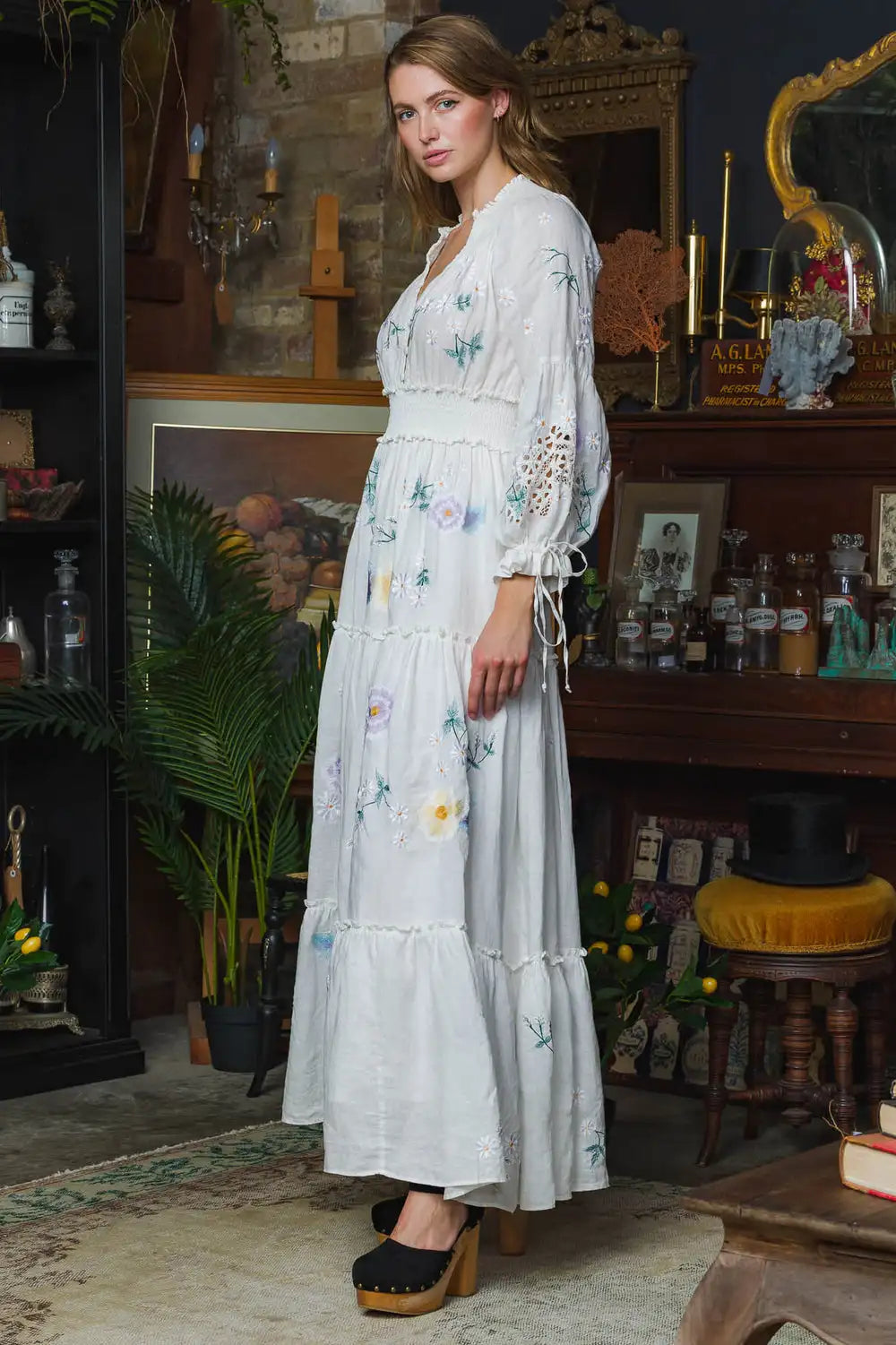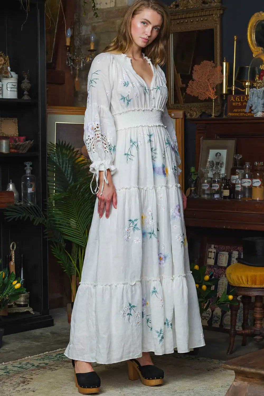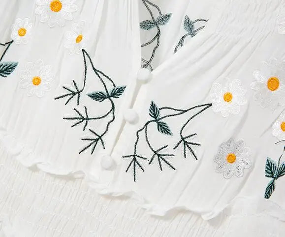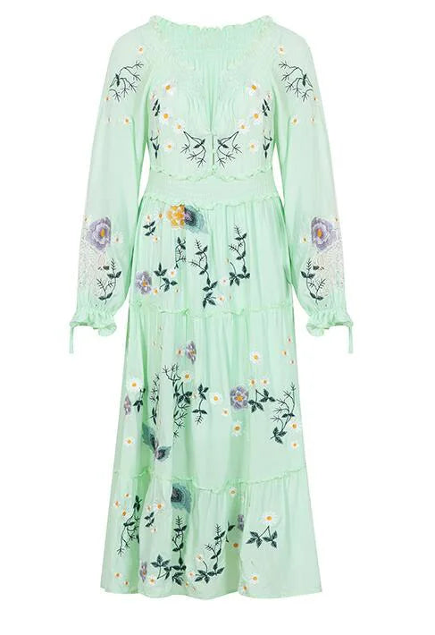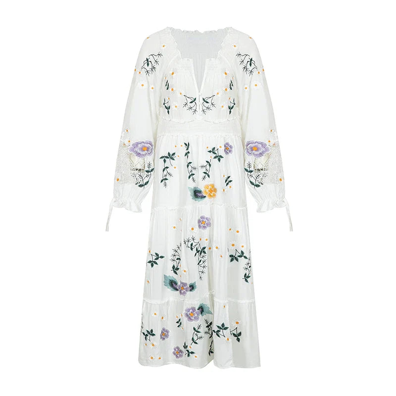 FashionSierra-Long Sleeve Vintage Floral Embroidery Spring Autumn Casual Deep V Neck Cotton Boho Dress