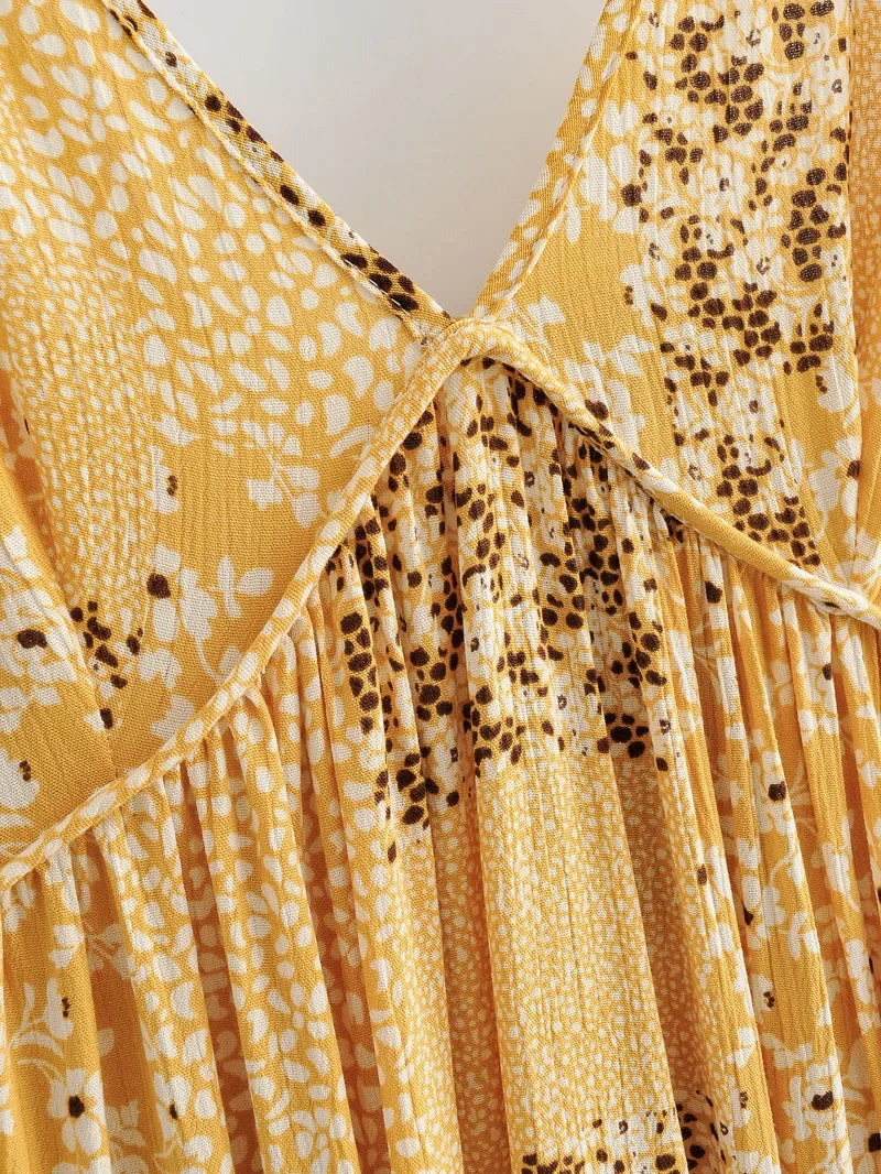 FashionSierra-Sexy Deep V Neck Sleeveless Mini Beach Yellow Cotton Floral Print Summer Backless Play Boho Dress