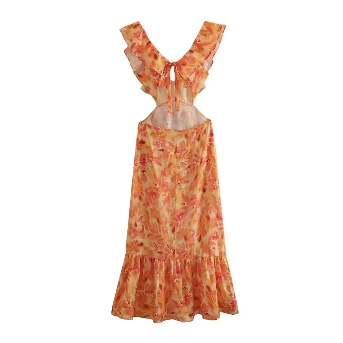FashionSierra-Orange Floral Printed Maxi Women Sexy Backless Deep V Neck Waistless Long Summer Ruffles Beach Boho Dress
