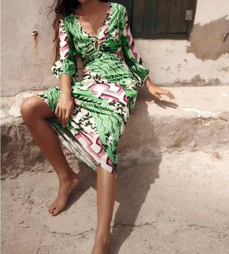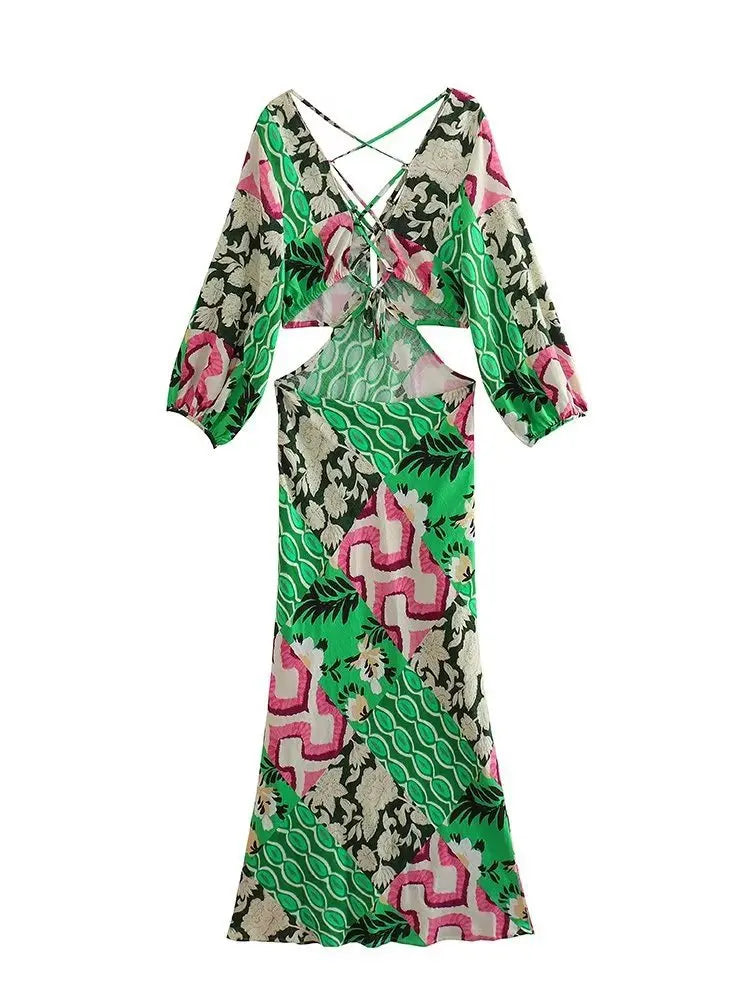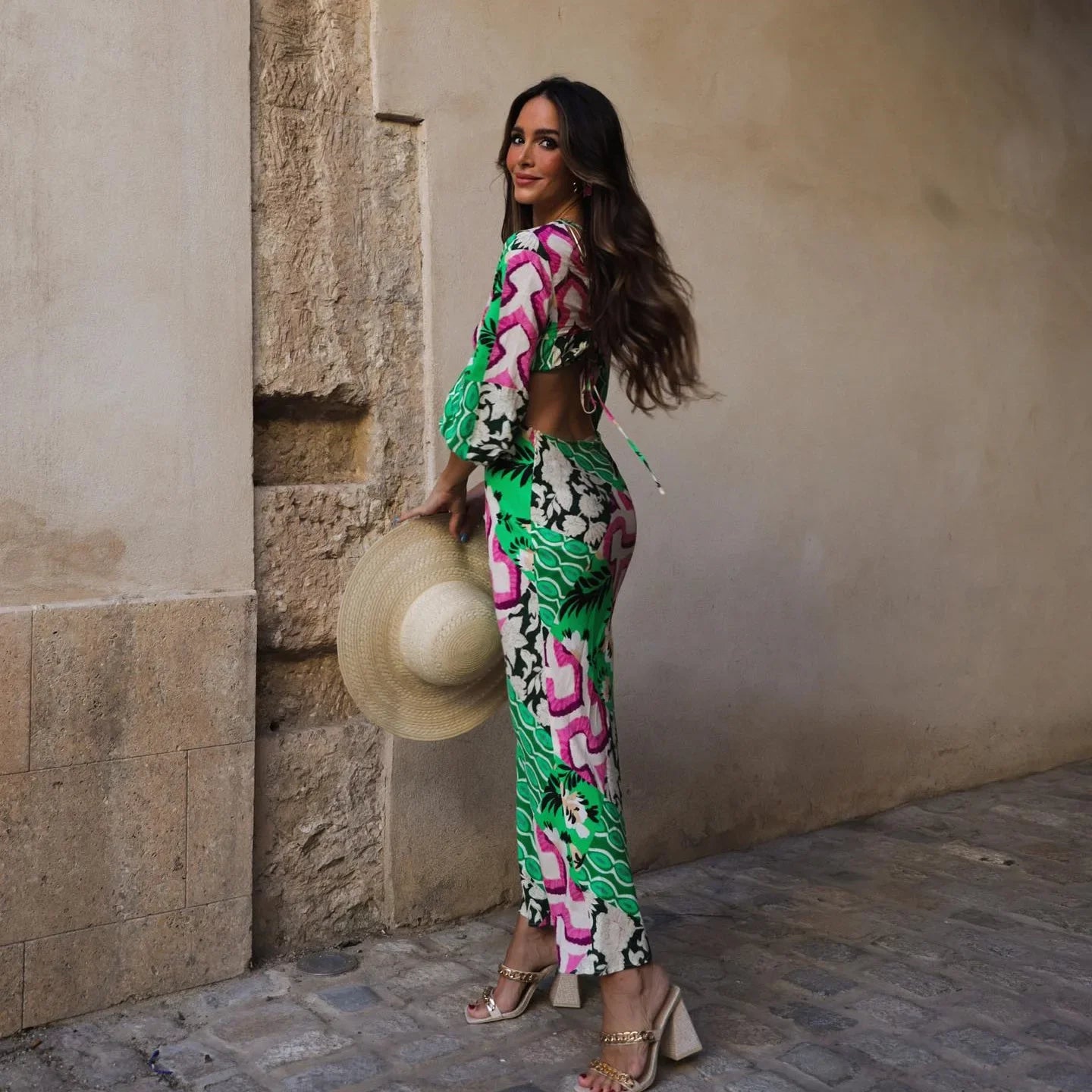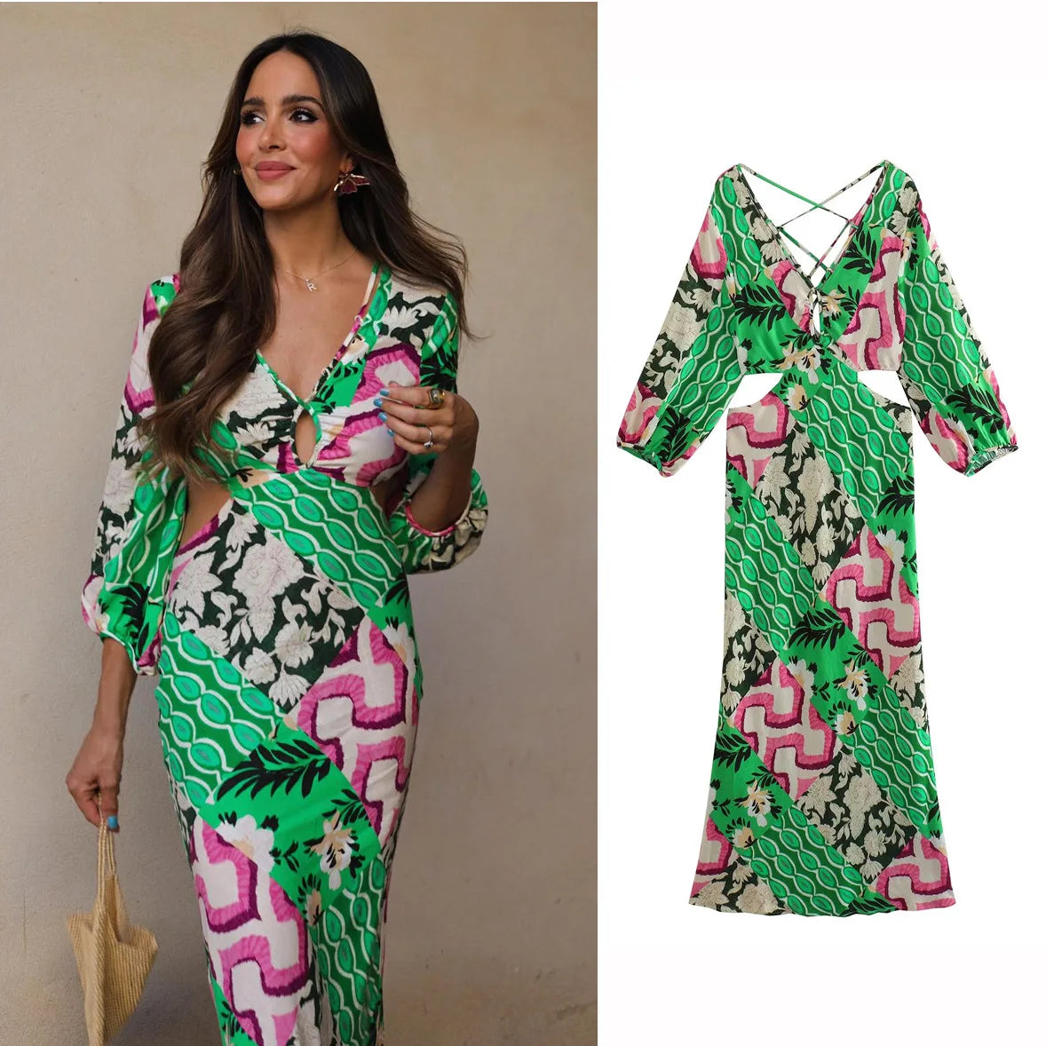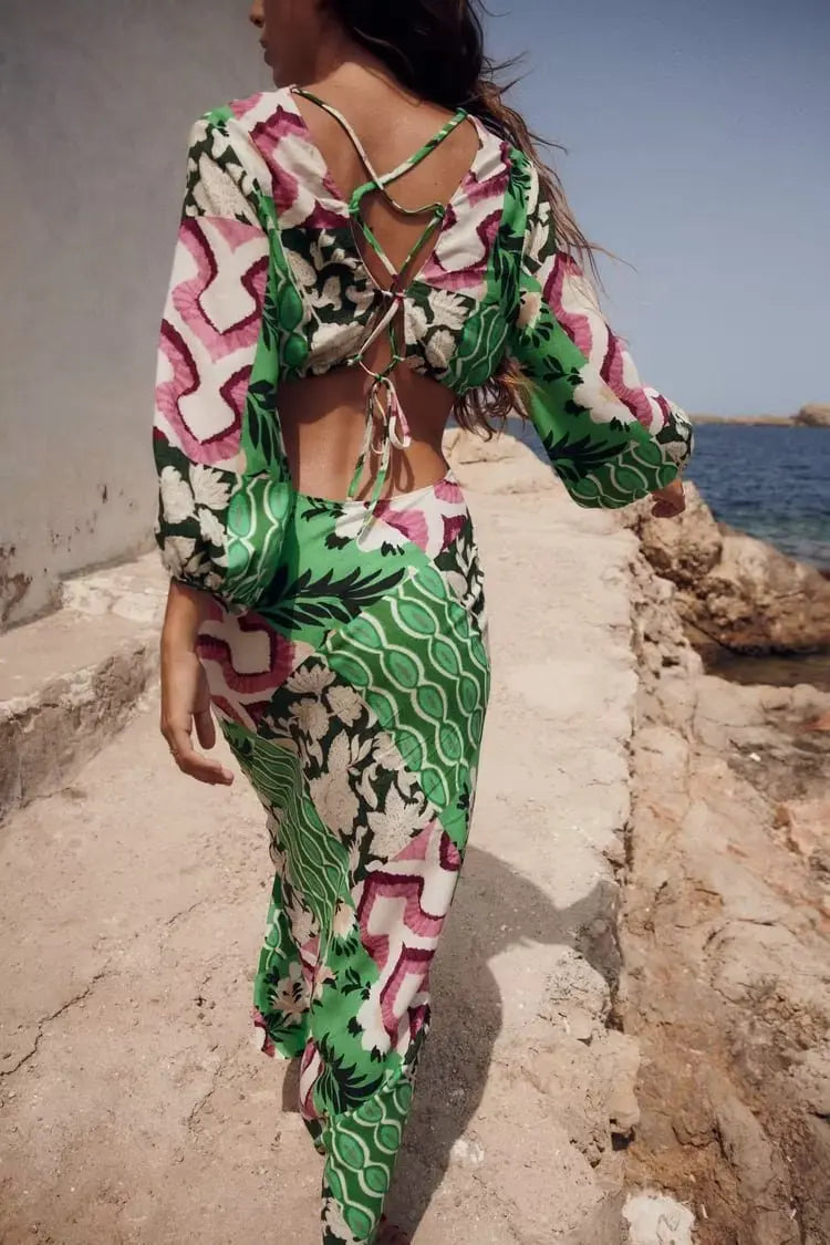 FashionSierra-Sexy Deep V Neck Backless Maxi Women Beach Cotton Linen Print Long Sleeve Autumn Party Vestidos Boho Dress