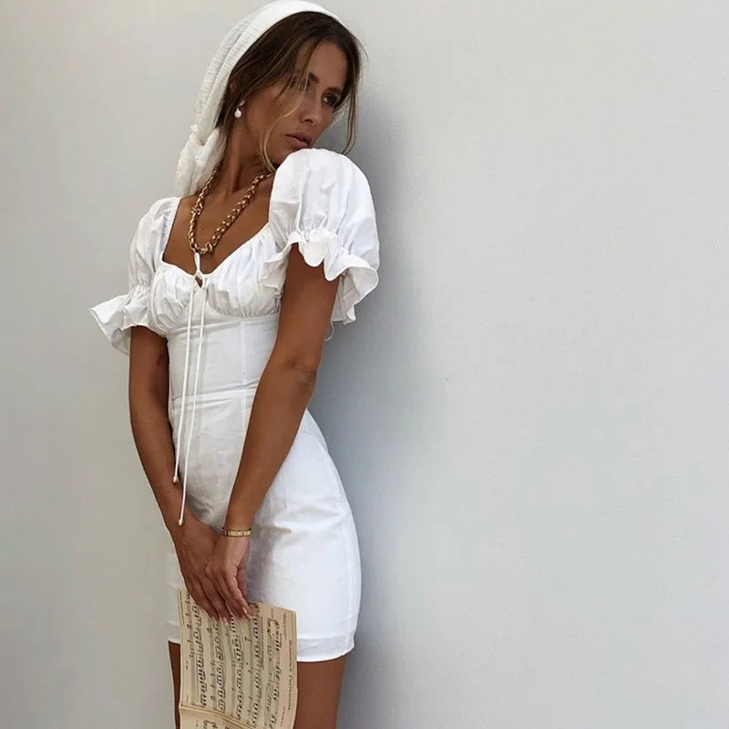 FashionSierra-Sheath  Mini  Women  White Cotton  Elegant  Puff Sleeve  Summer  Square Collar  Bohemian  Short Dress  Vestidos Boho Dress