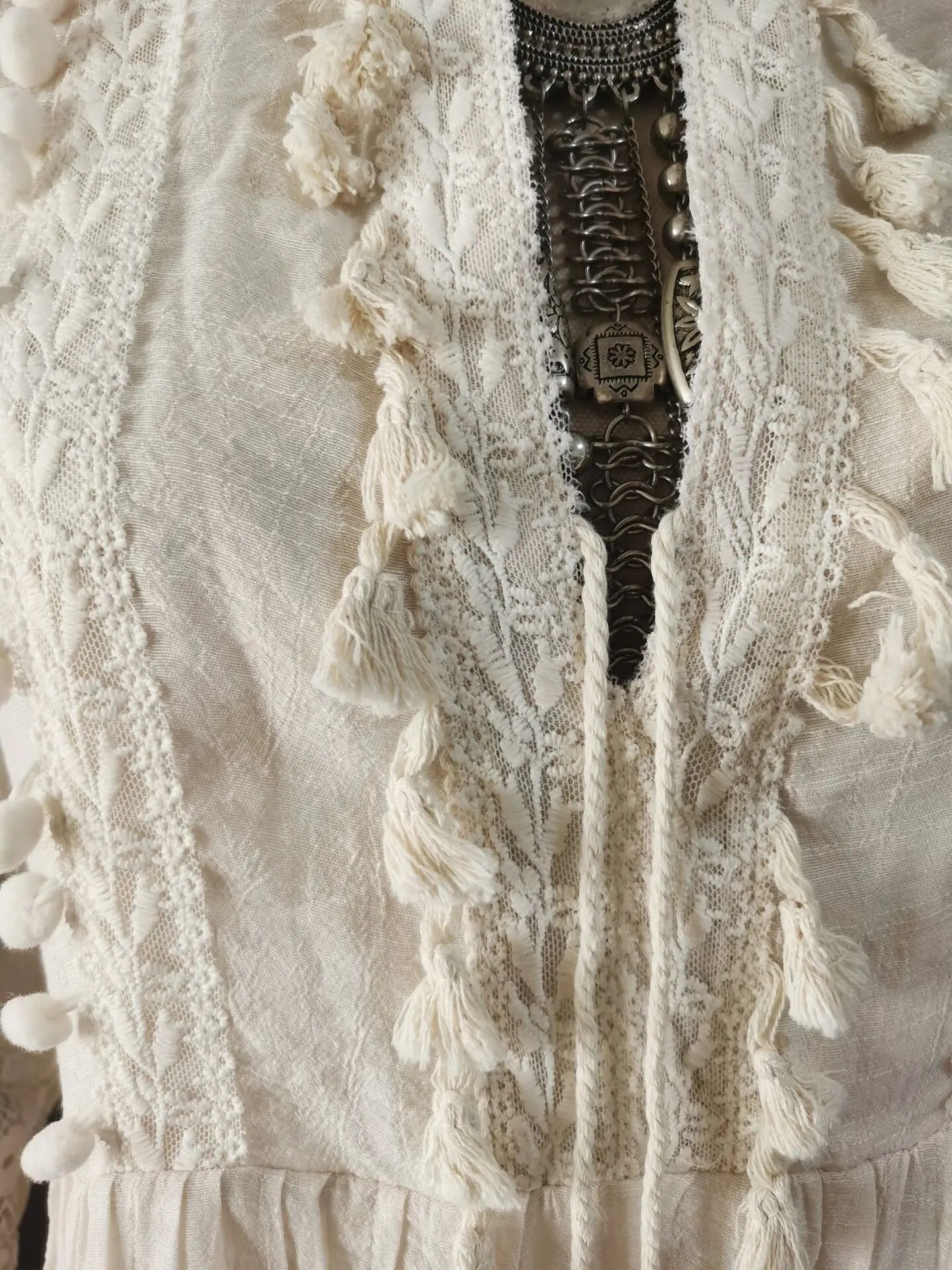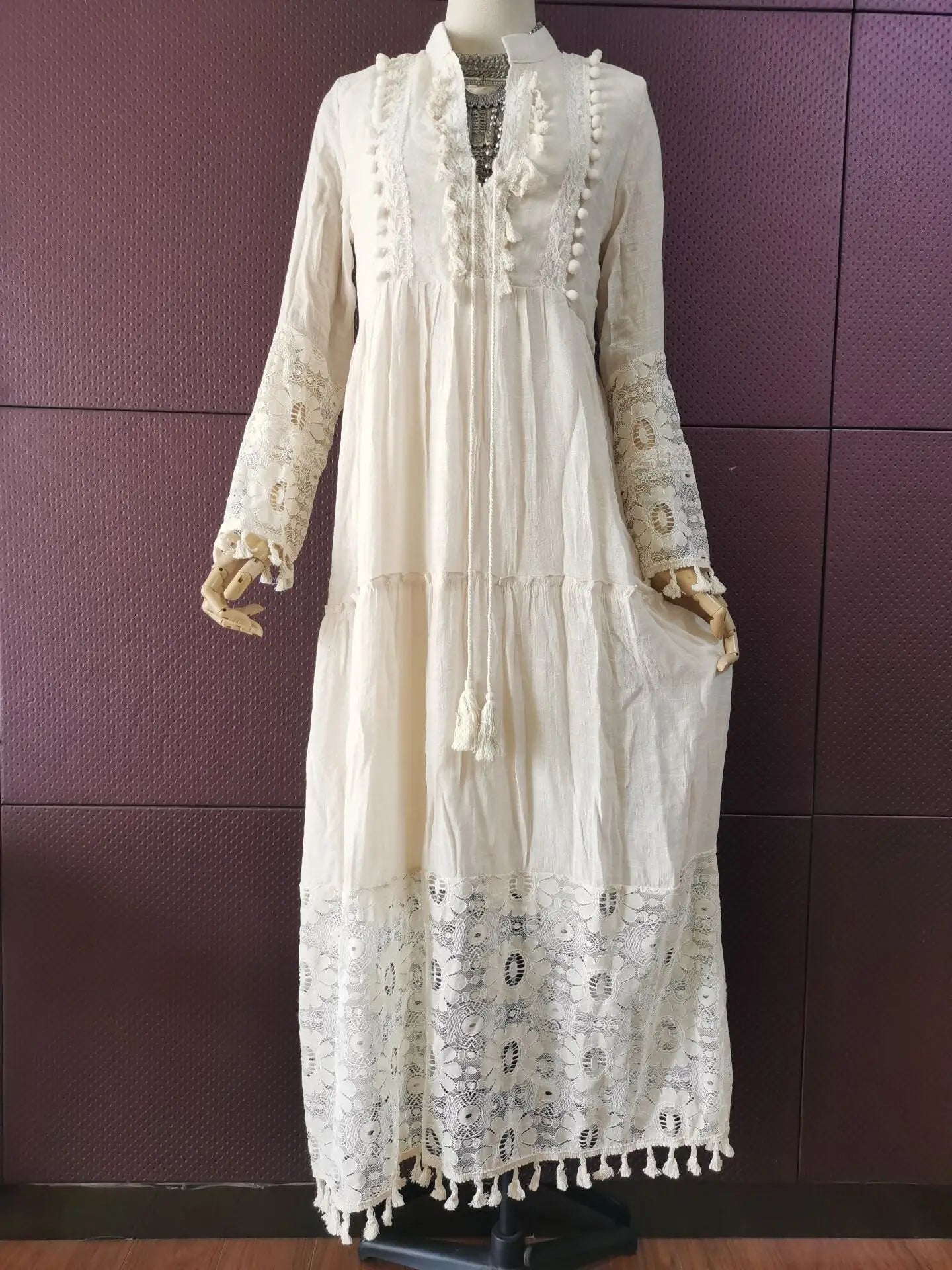 FashionSierra-Long Sleeve Tassel Women Vintage Floral Embroidery Beach Wear Summer 2025 Casual Lace Vestidos Boho Dress
