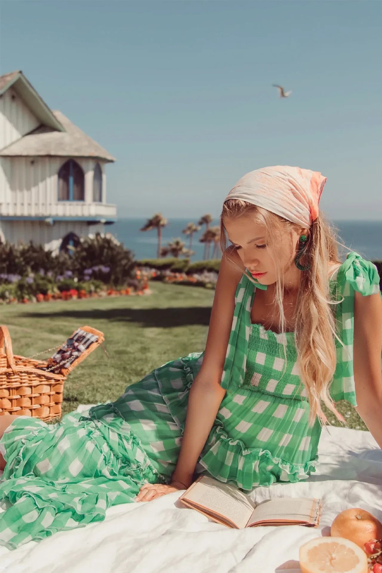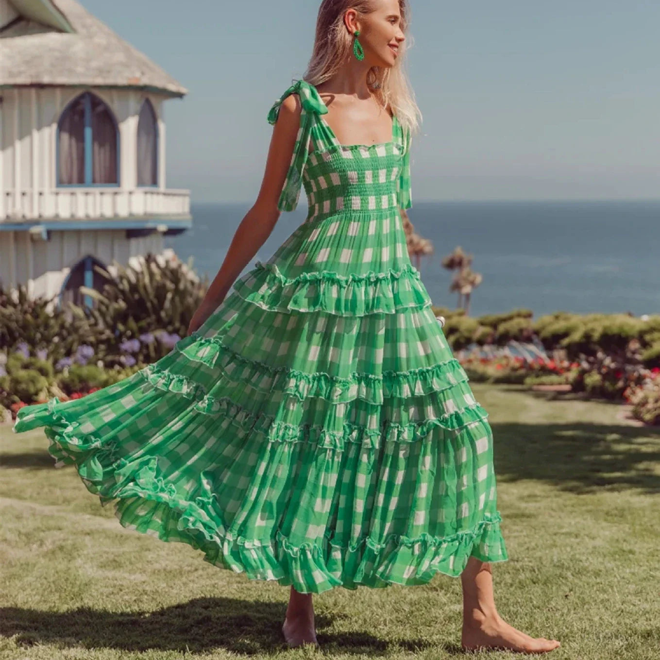 FashionSierra-Casual Square Collar Plaid for Women Vintage High Waist Ruffles Summer 2025 Sleeveless Long Vestidos Boho Dress
