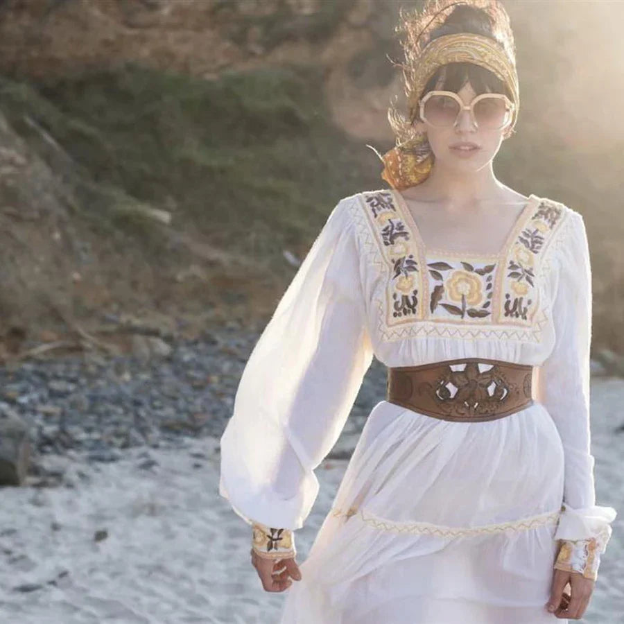 FashionSierra-Tunic White Floral Embroidery Long Sleeve Beach Summer Loose Gypsy Boho Dress
