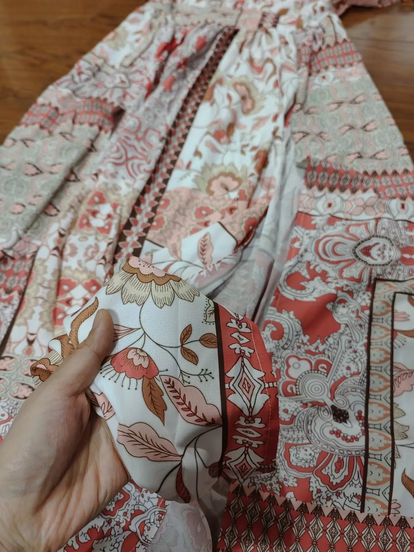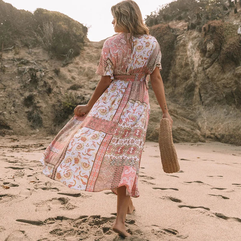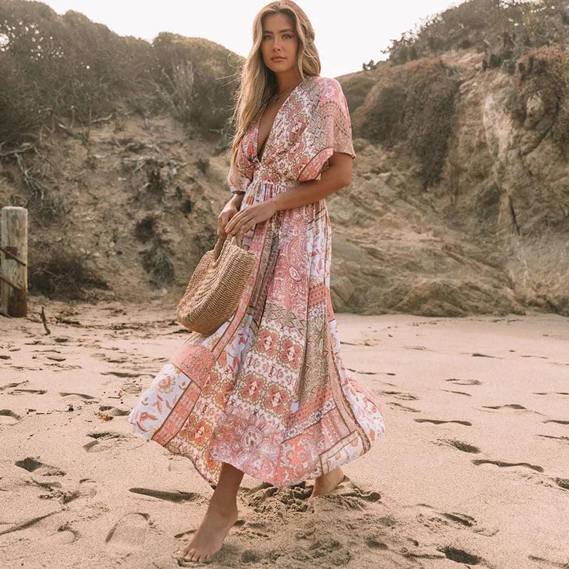FashionSierra-Floral Printed  Cover-Ups  Women  Casual  Deep V Neck  Elastic Waist  Short Sleeve  Summer  Long  Beach Boho Dress