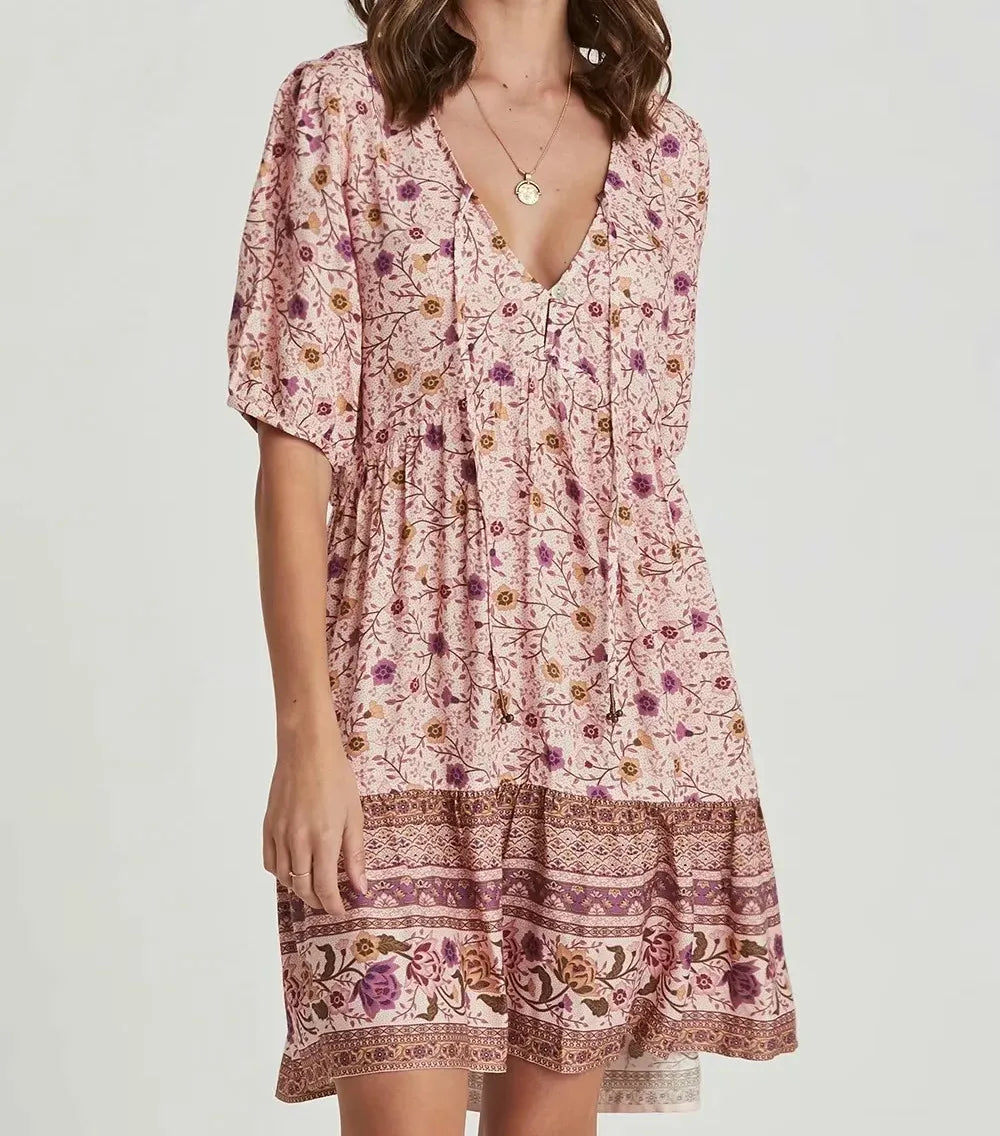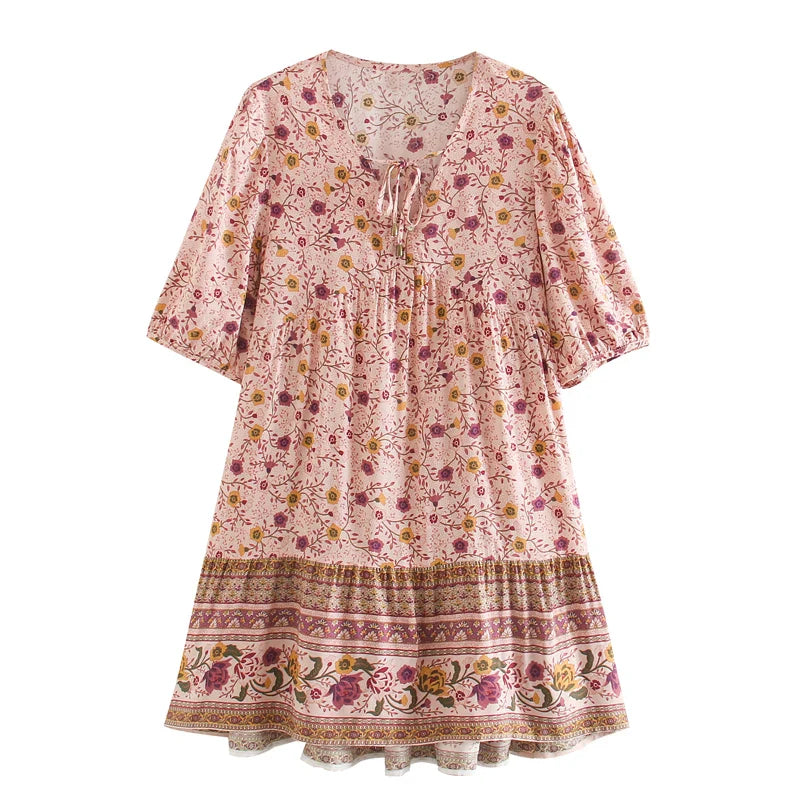 FashionSierra-Pink  Floral Print  Robe  A-line  Mini  Women 2025  Beach  V Neck  Short  Summer  Vintage  Loose  Casual Boho Dress