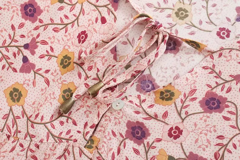 FashionSierra-Pink Floral Print Robe A-line Mini Women 2025 Beach V Neck Short Summer Vintage Loose Casual Boho Dress