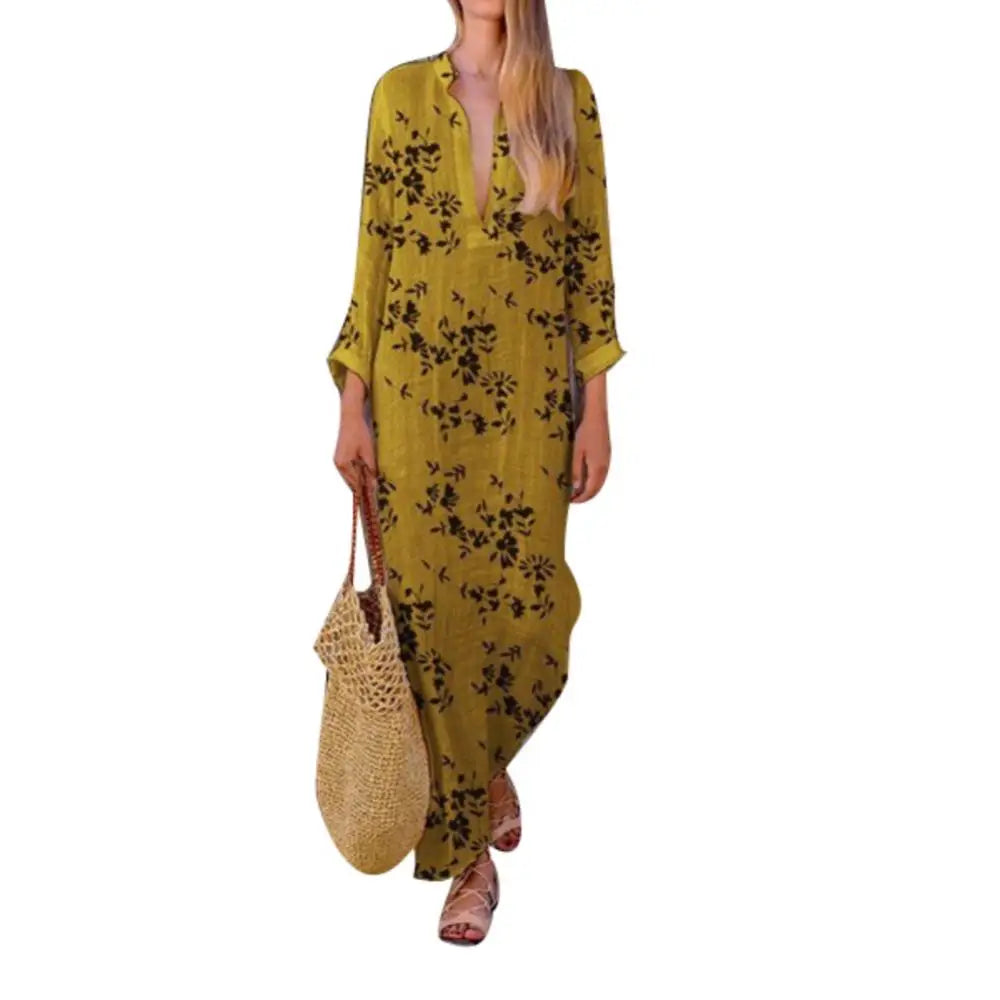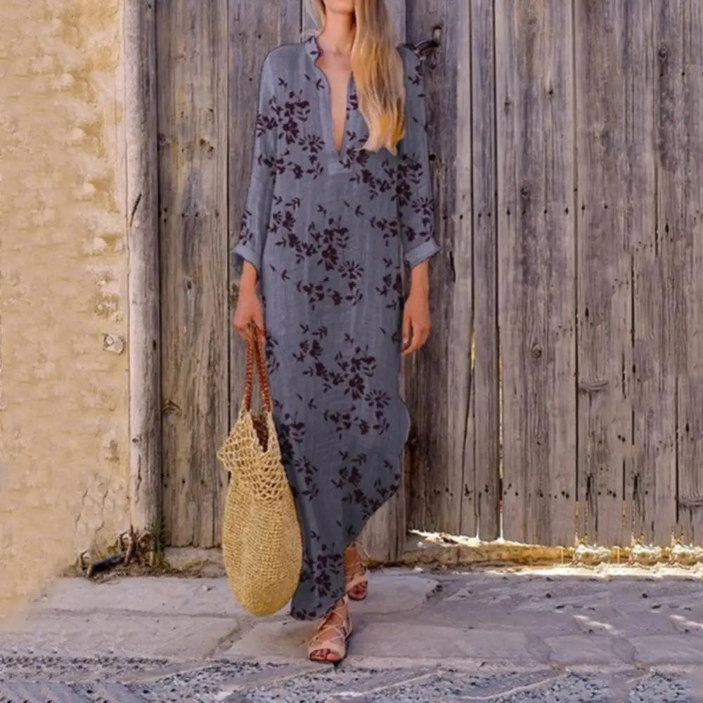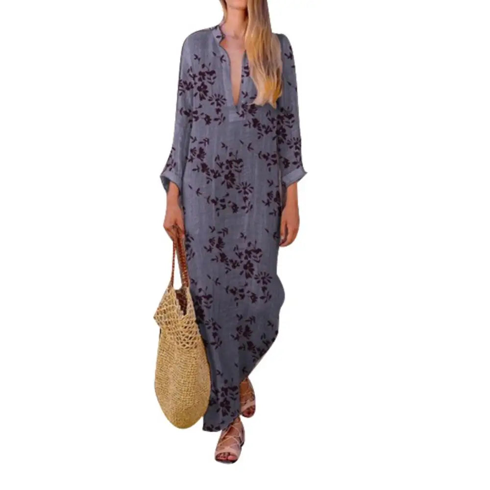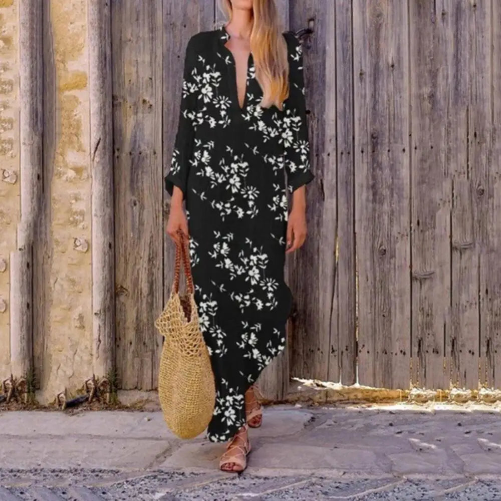 FashionSierra - 2025 Spring Casual V-Neck Slit Maxi Tunic Boho Dress