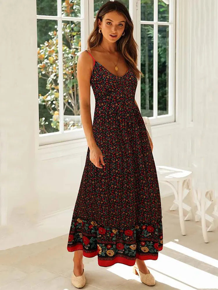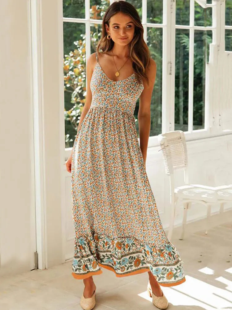 FashionSierra - 2025 Floral Maxi Women Elegant Spaghetti Strap Boho Dress