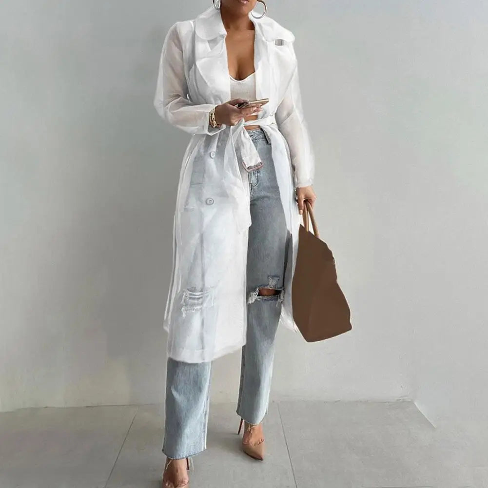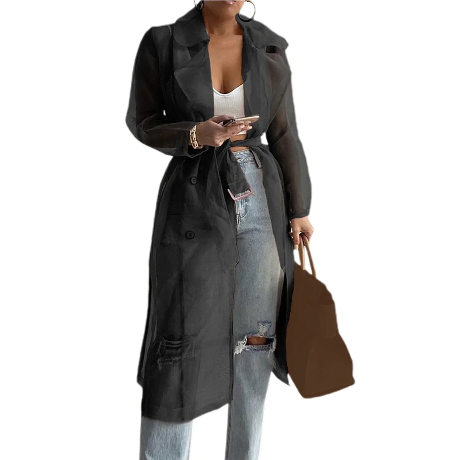 Season : Summer Age : 25-34 Pattern Type : Solid Type : Slim Closure Type : Open Stitch Collar : Turn-down Collar Clothing Length : Long Sleeve Length(cm) : Full Style : Casual Material : Polyester Gender : Women Outerwear Type : Trench