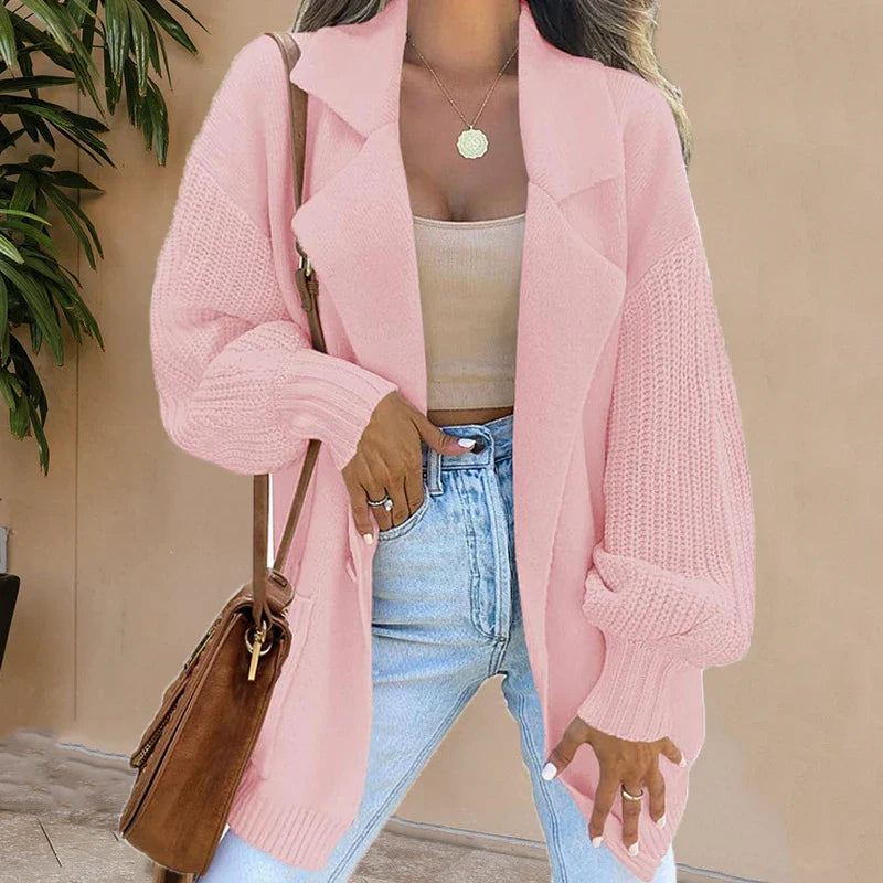 Women Turn-down Collar Sweater Cardigan Autumn Solid Ribbed Tops Jacket Winter Lantern Long Sleeve Thick Coat
