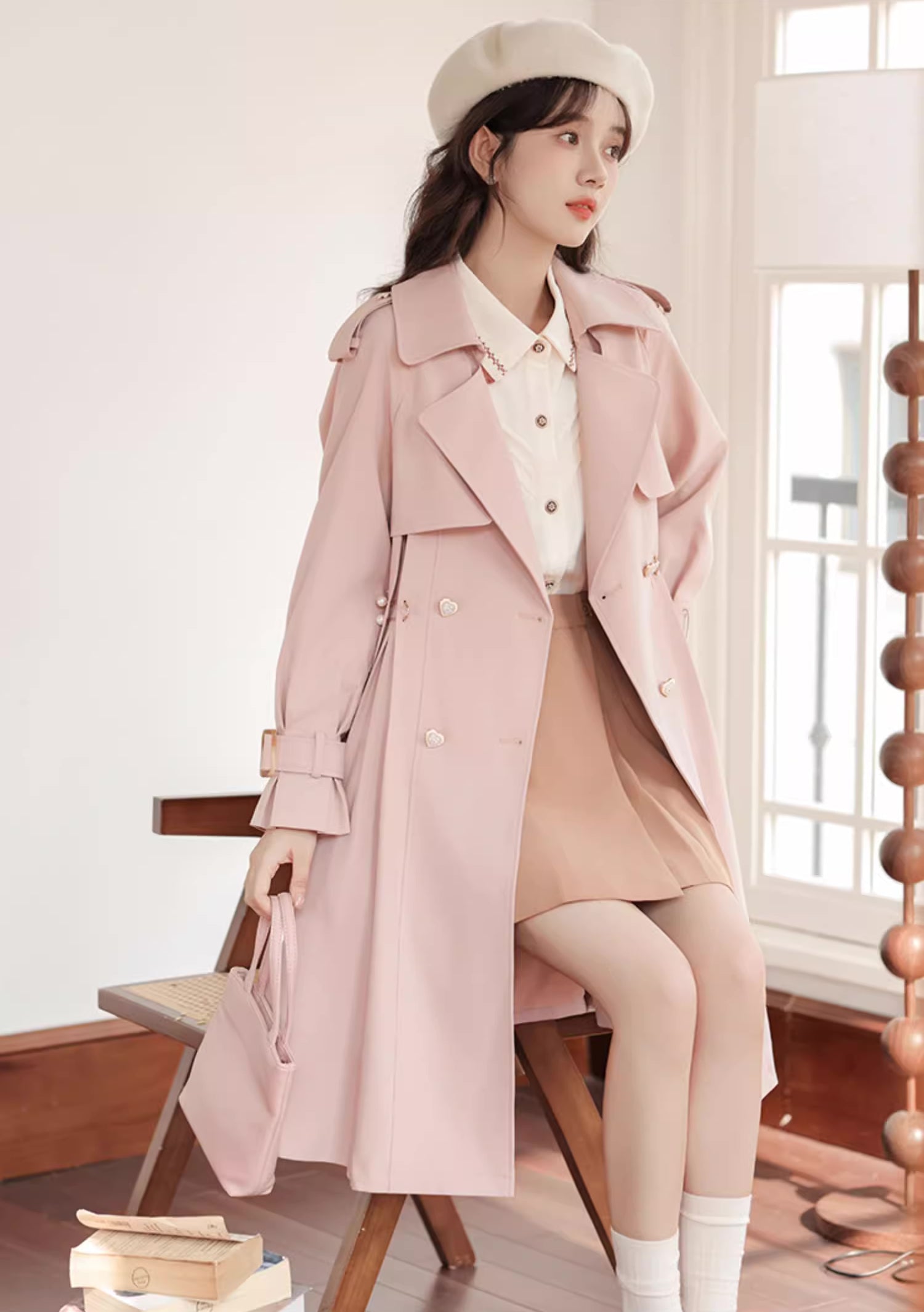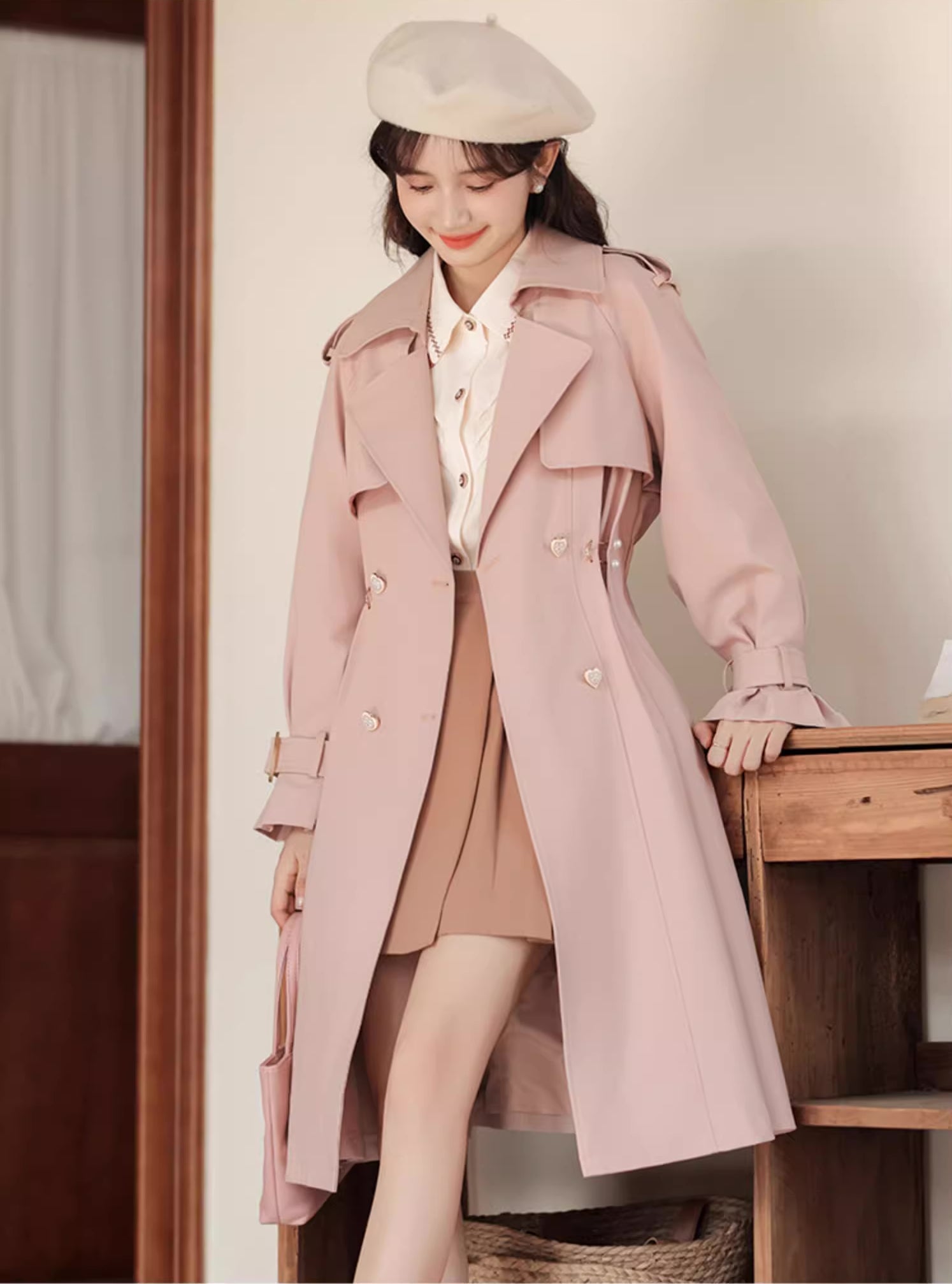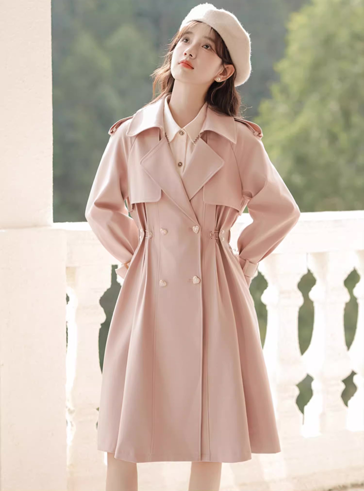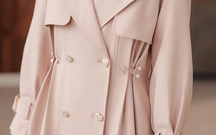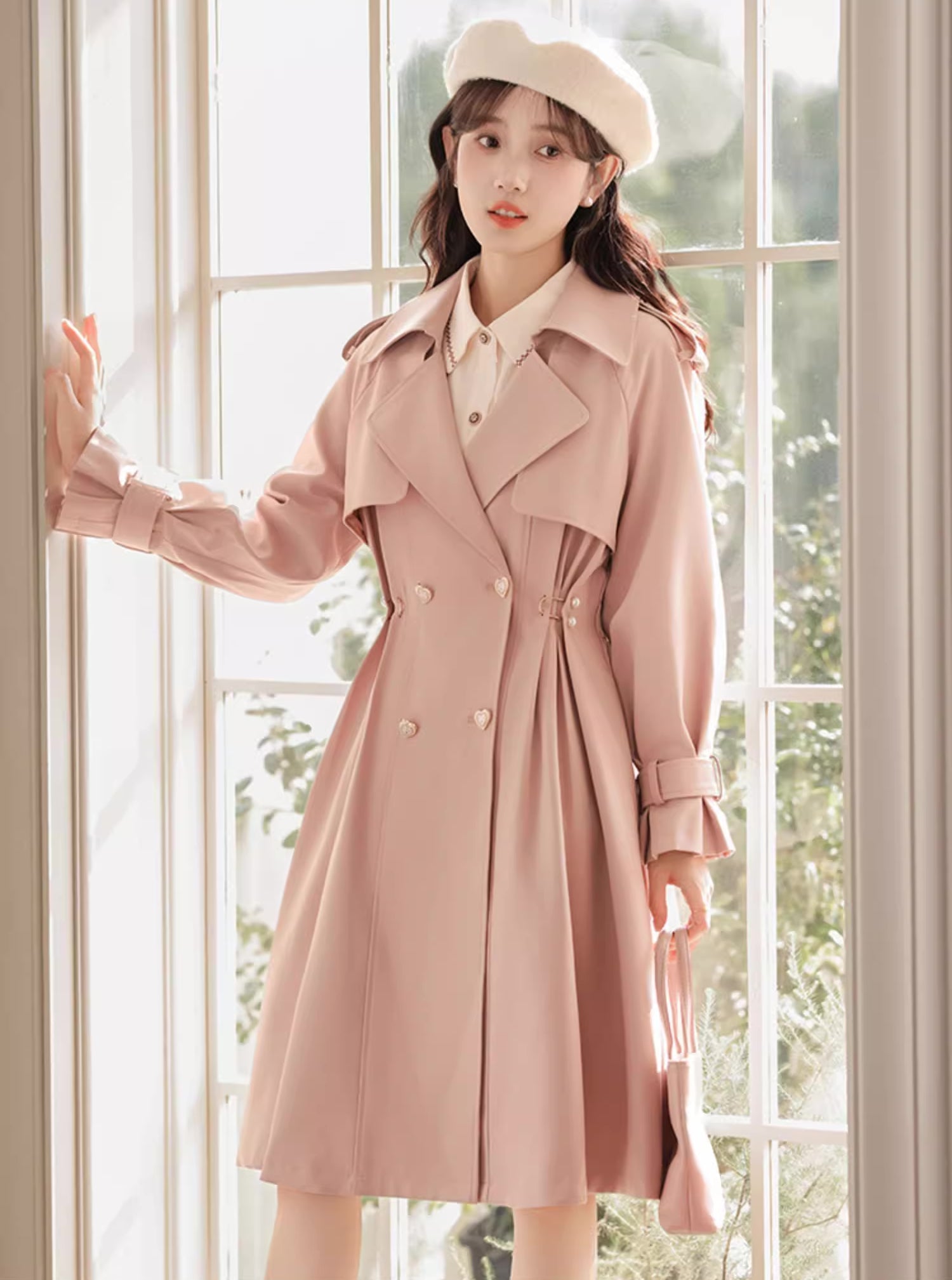 The pink trench coat of dreams! With classic notched lapels, shoulder straps, chest flaps, adjustable flared cuffs and side pockets, this coat retains the classic details of a trench coat. The added elastic cinched waist and heart buttons give a touch of extra sweetness and femininity. Plus, the swing hem adds more of a coat dress silhouette for fun twirls.聽