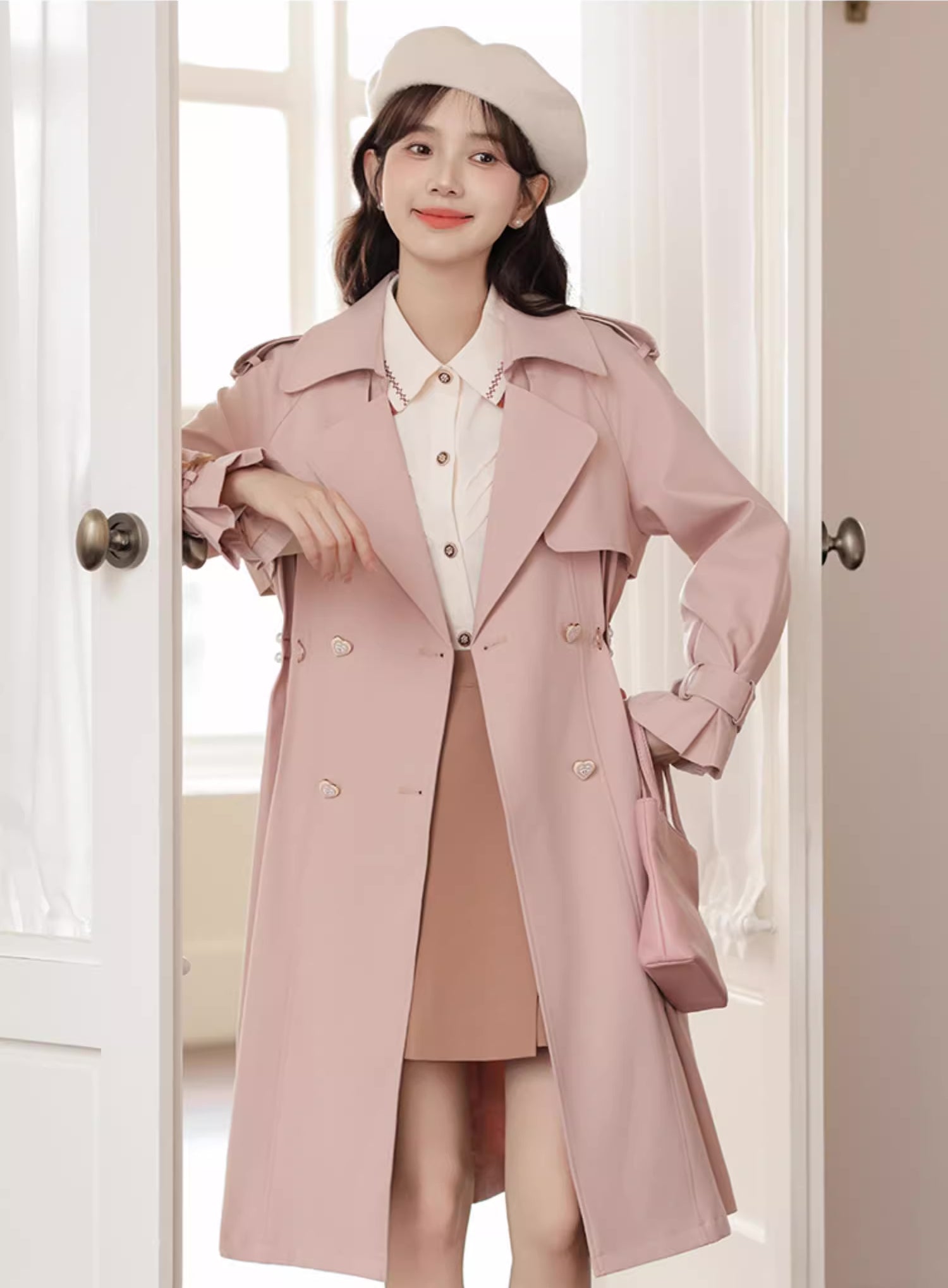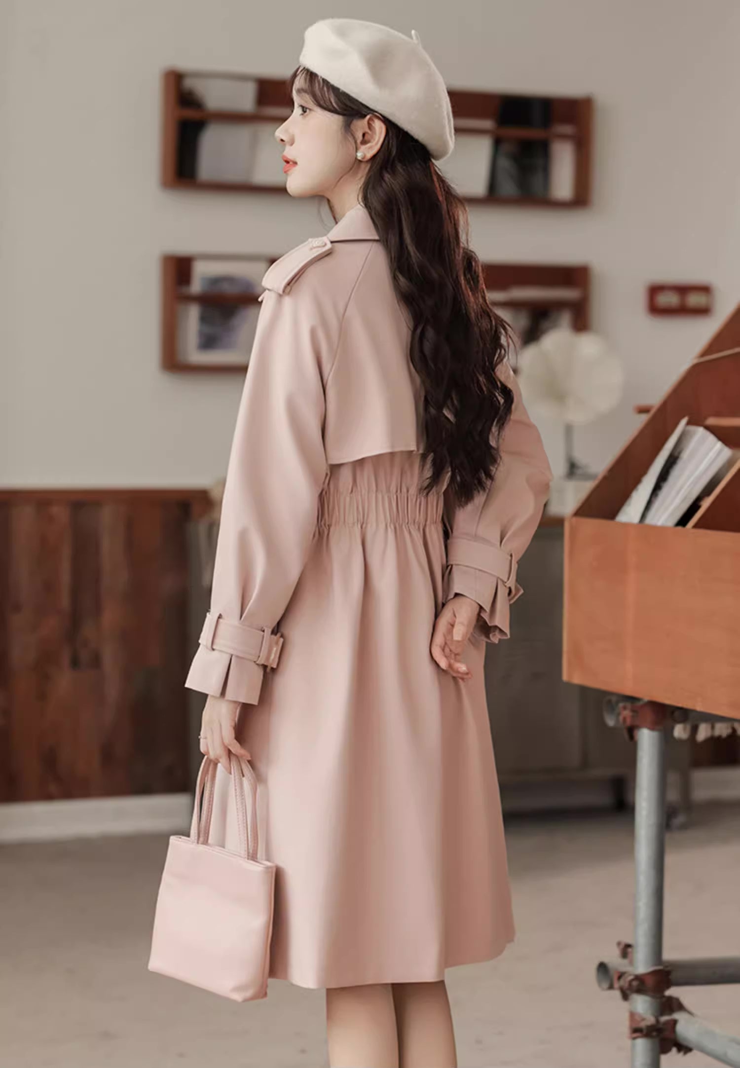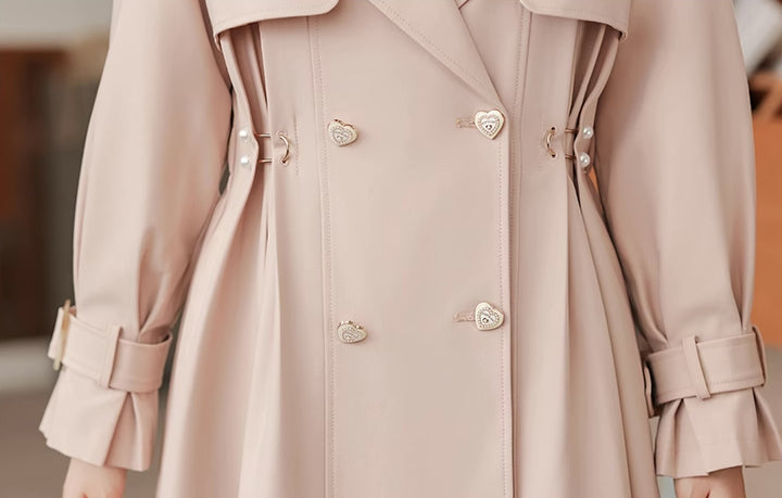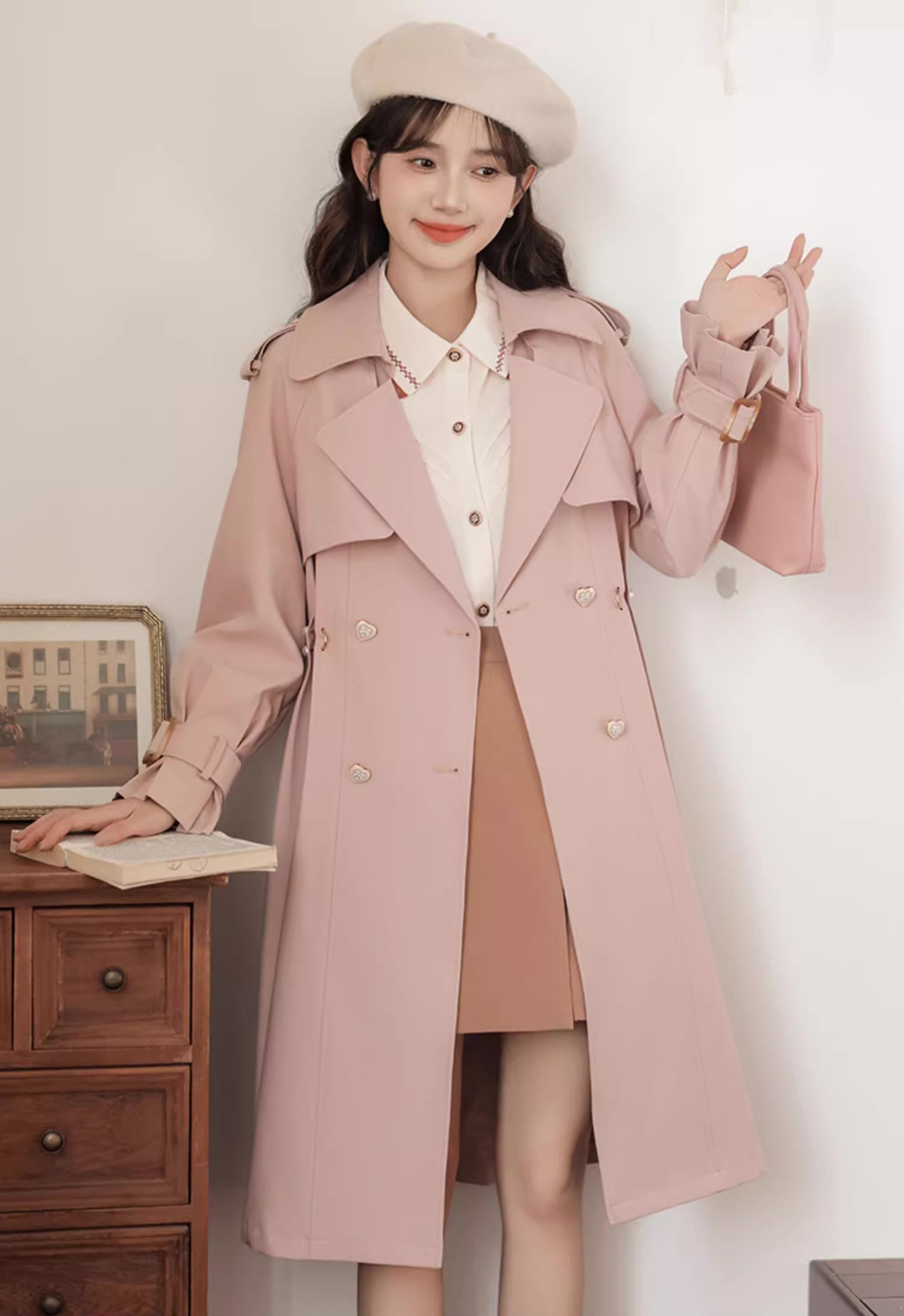 The pink trench coat of dreams! With classic notched lapels, shoulder straps, chest flaps, adjustable flared cuffs and side pockets, this coat retains the classic details of a trench coat. The added elastic cinched waist and heart buttons give a touch of extra sweetness and femininity. Plus, the swing hem adds more of a coat dress silhouette for fun twirls.聽