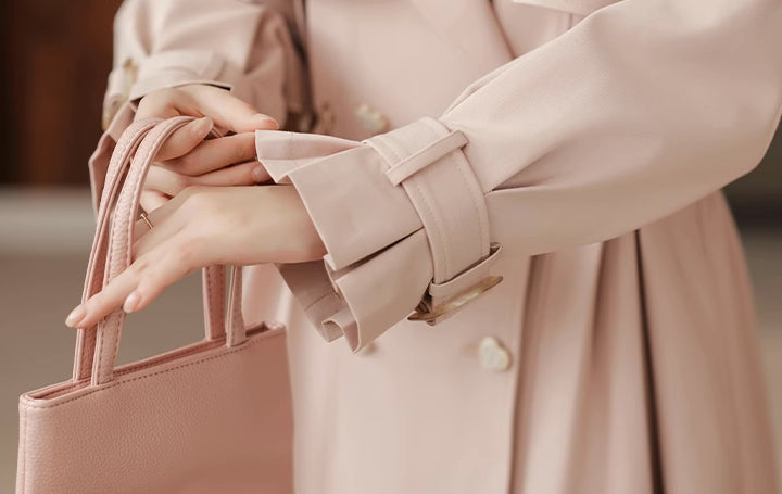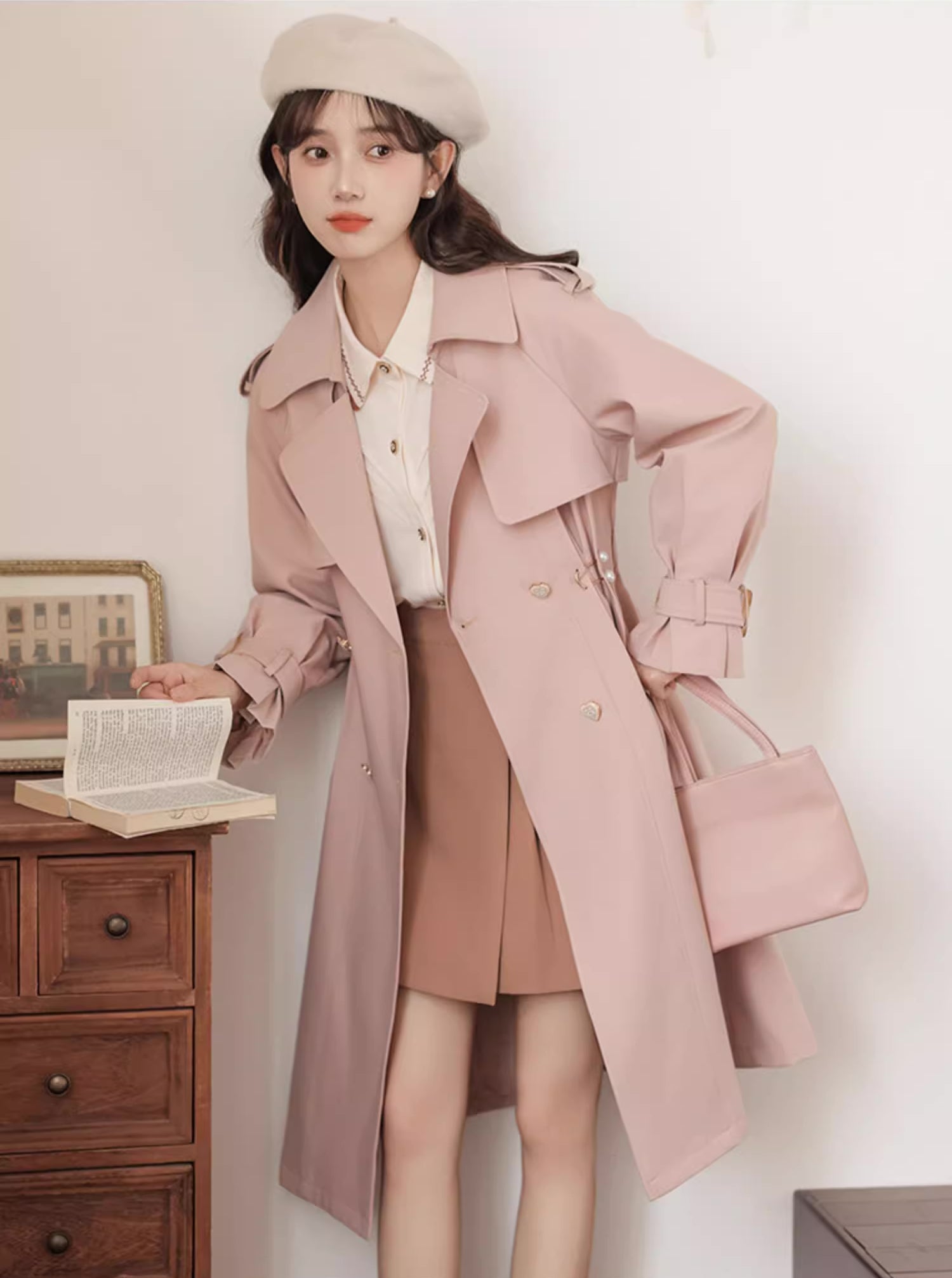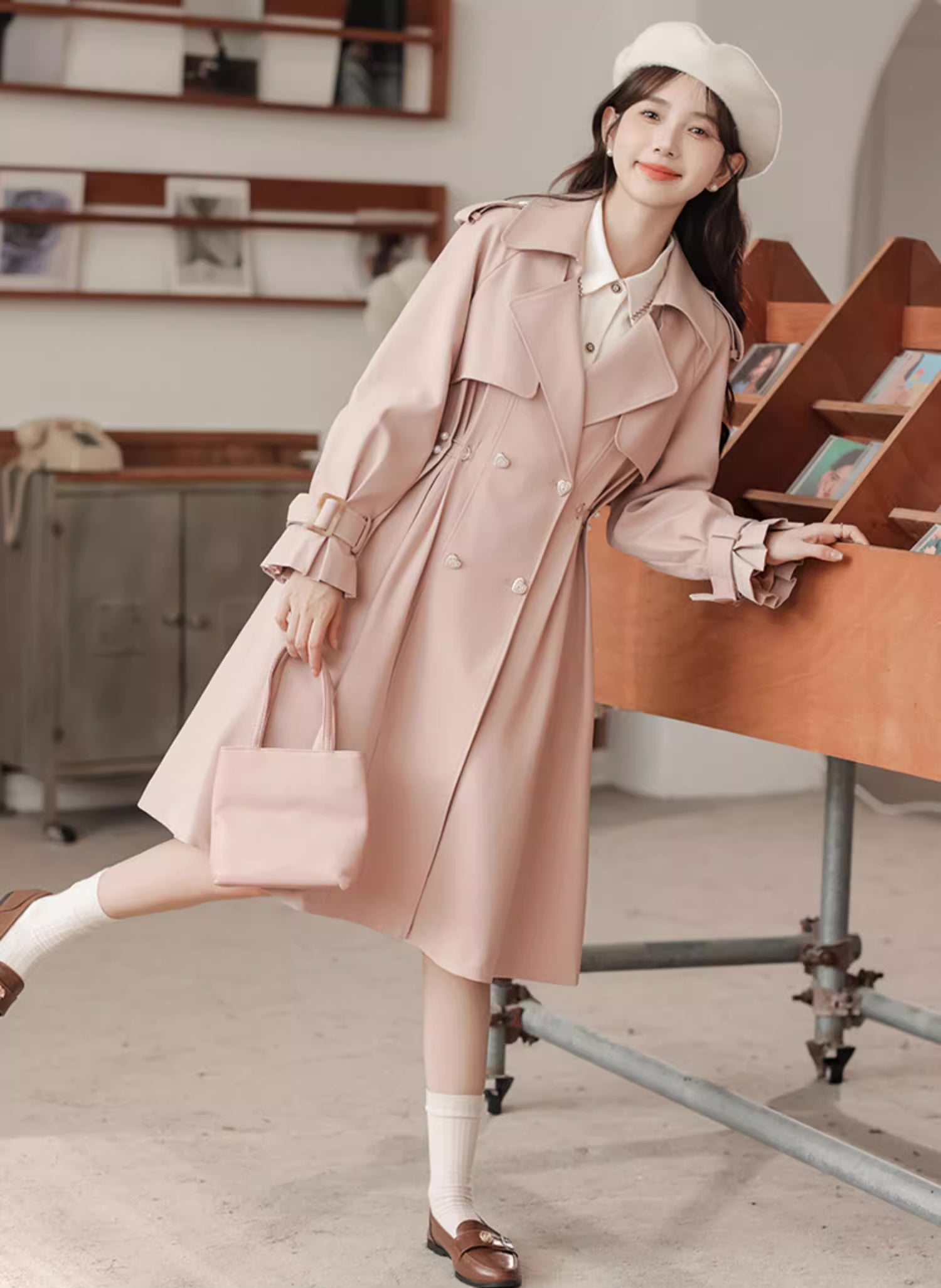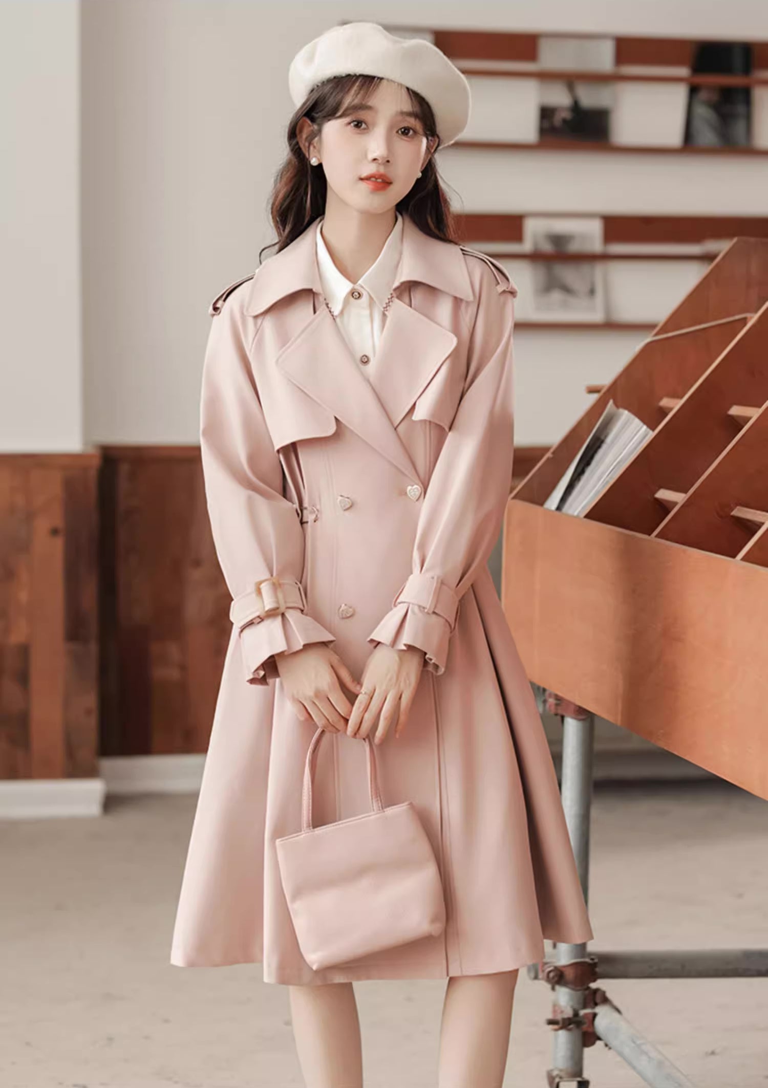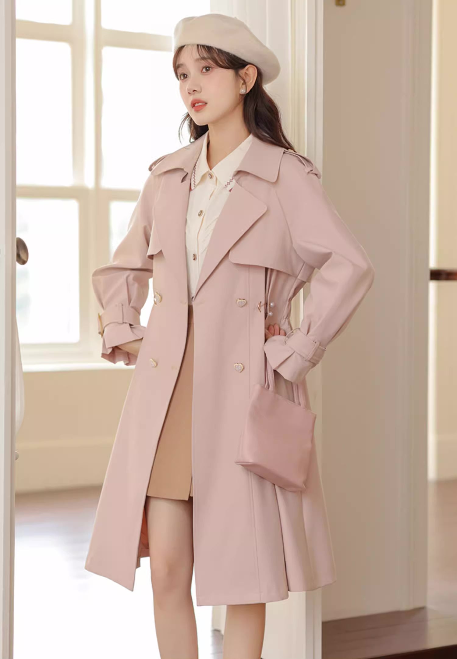 The pink trench coat of dreams! With classic notched lapels, shoulder straps, chest flaps, adjustable flared cuffs and side pockets, this coat retains the classic details of a trench coat. The added elastic cinched waist and heart buttons give a touch of extra sweetness and femininity. Plus, the swing hem adds more of a coat dress silhouette for fun twirls.聽
