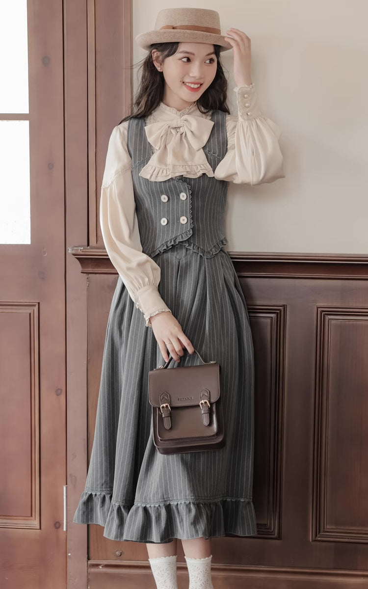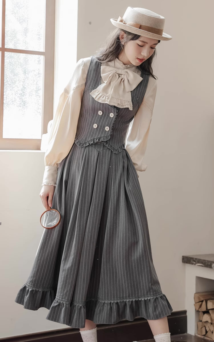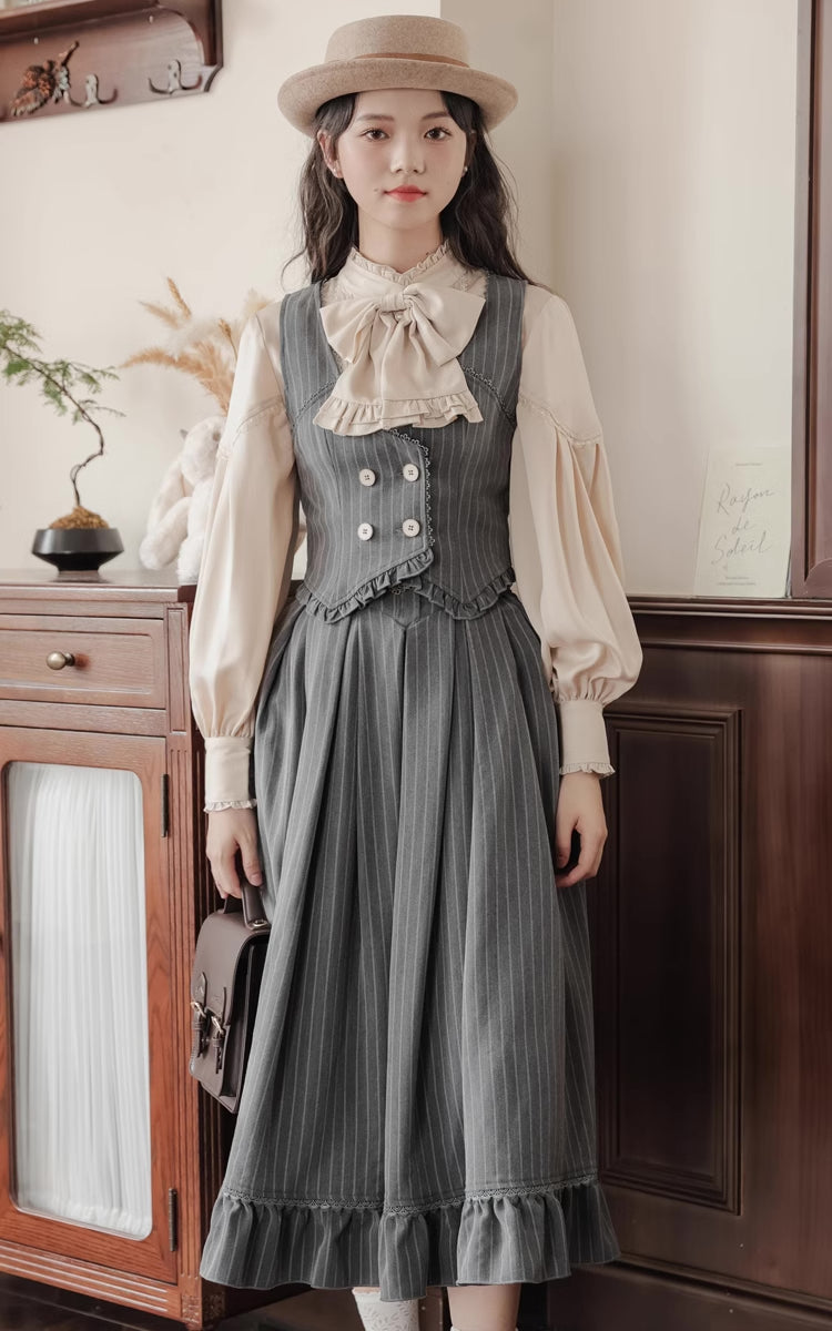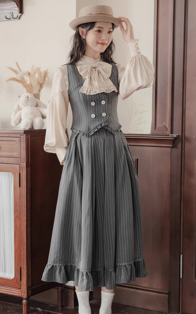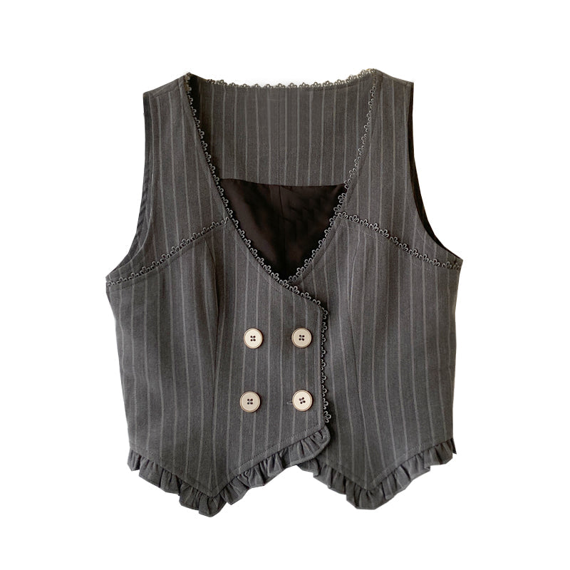 Cropped vest with lace and ruffle trims in a subtle stripe fabric. Double breasted button closure with a v-neckline and bow detail at the back.
