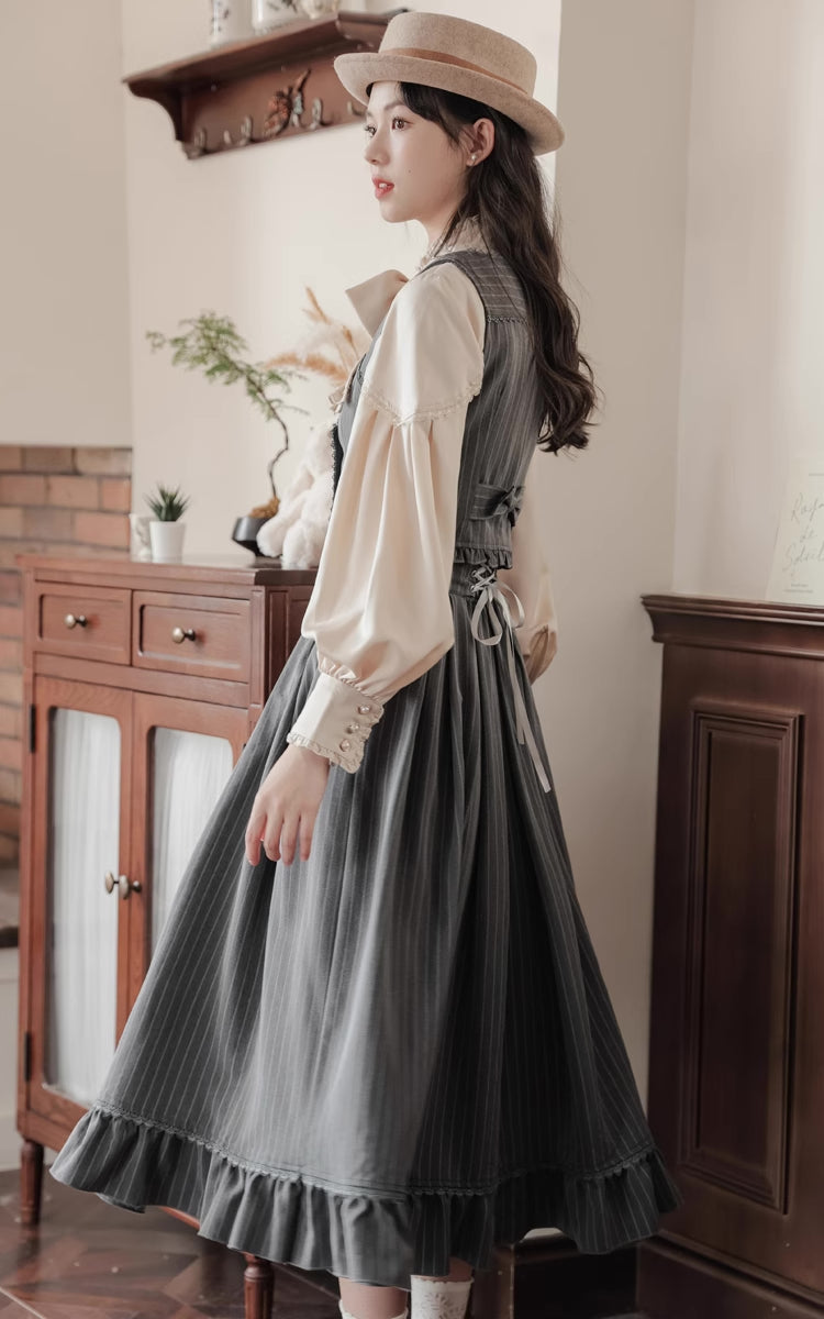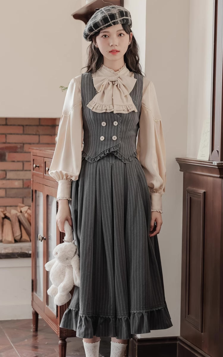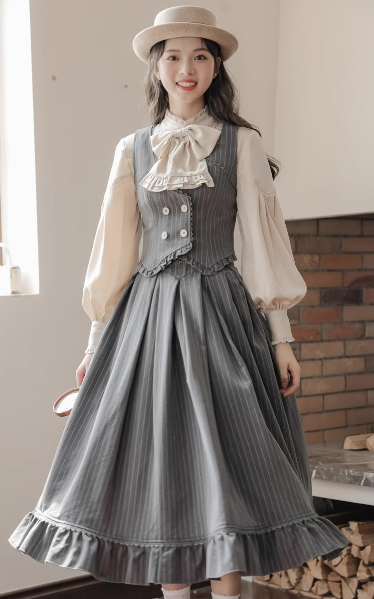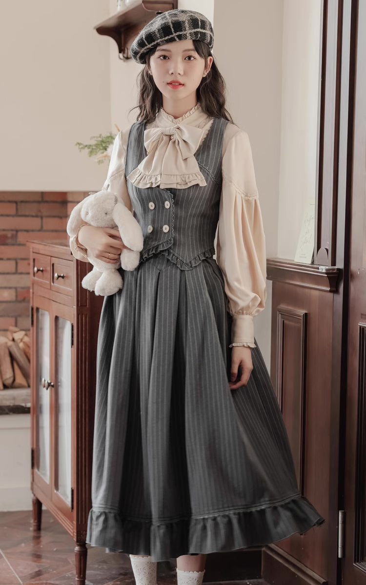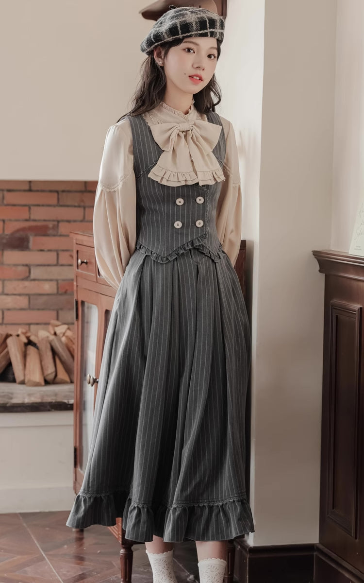 Cropped vest with lace and ruffle trims in a subtle stripe fabric. Double breasted button closure with a v-neckline and bow detail at the back.