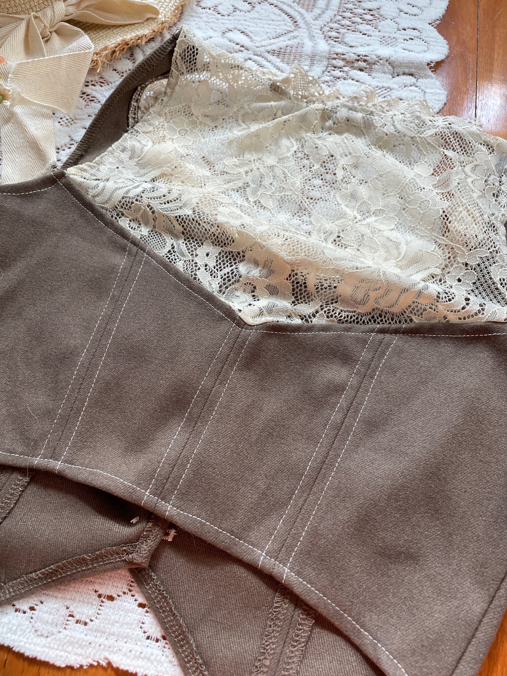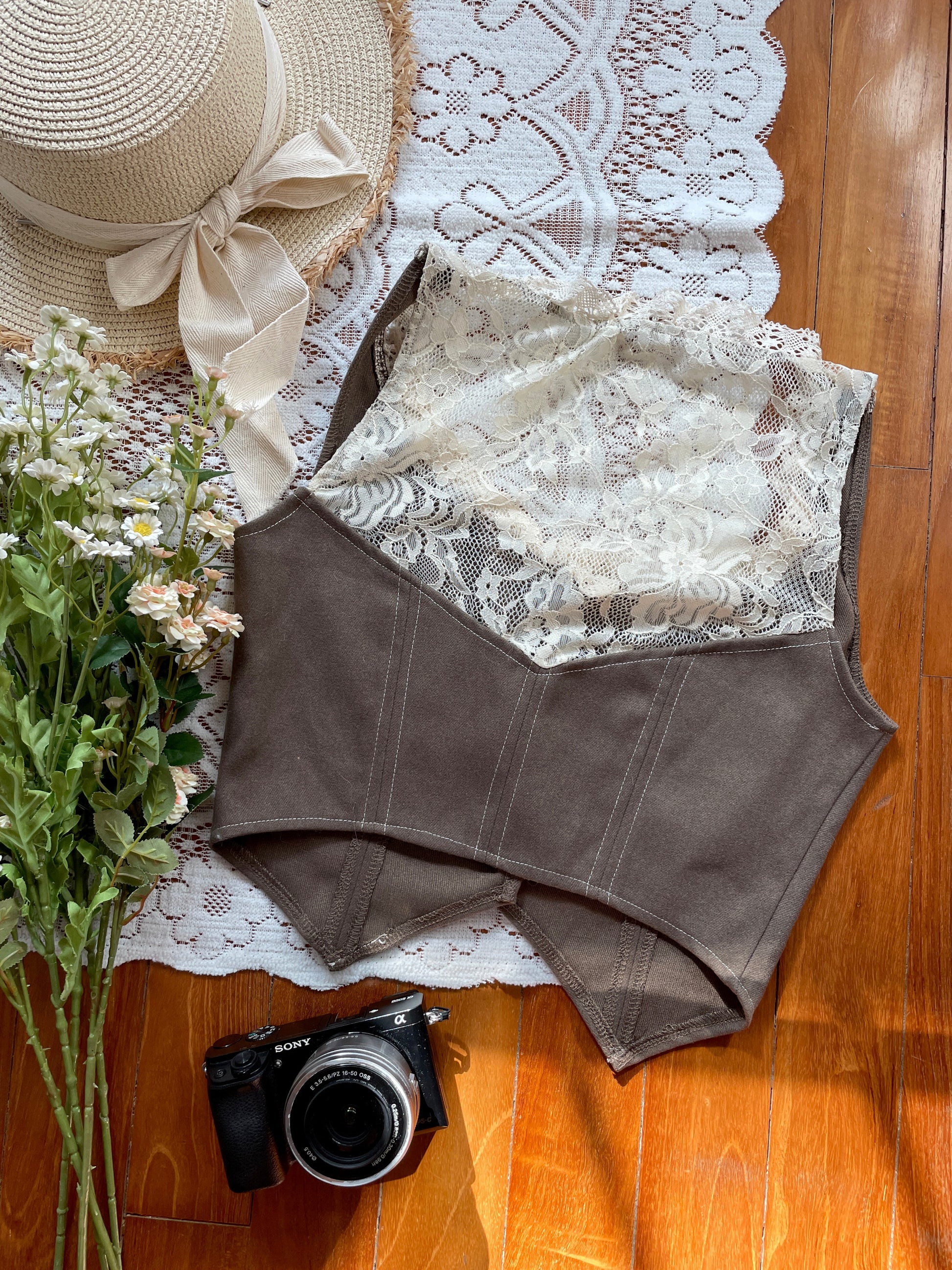 Tailored vest with a scoop neckline, button front, lace trims and backing, and pointed ends.聽