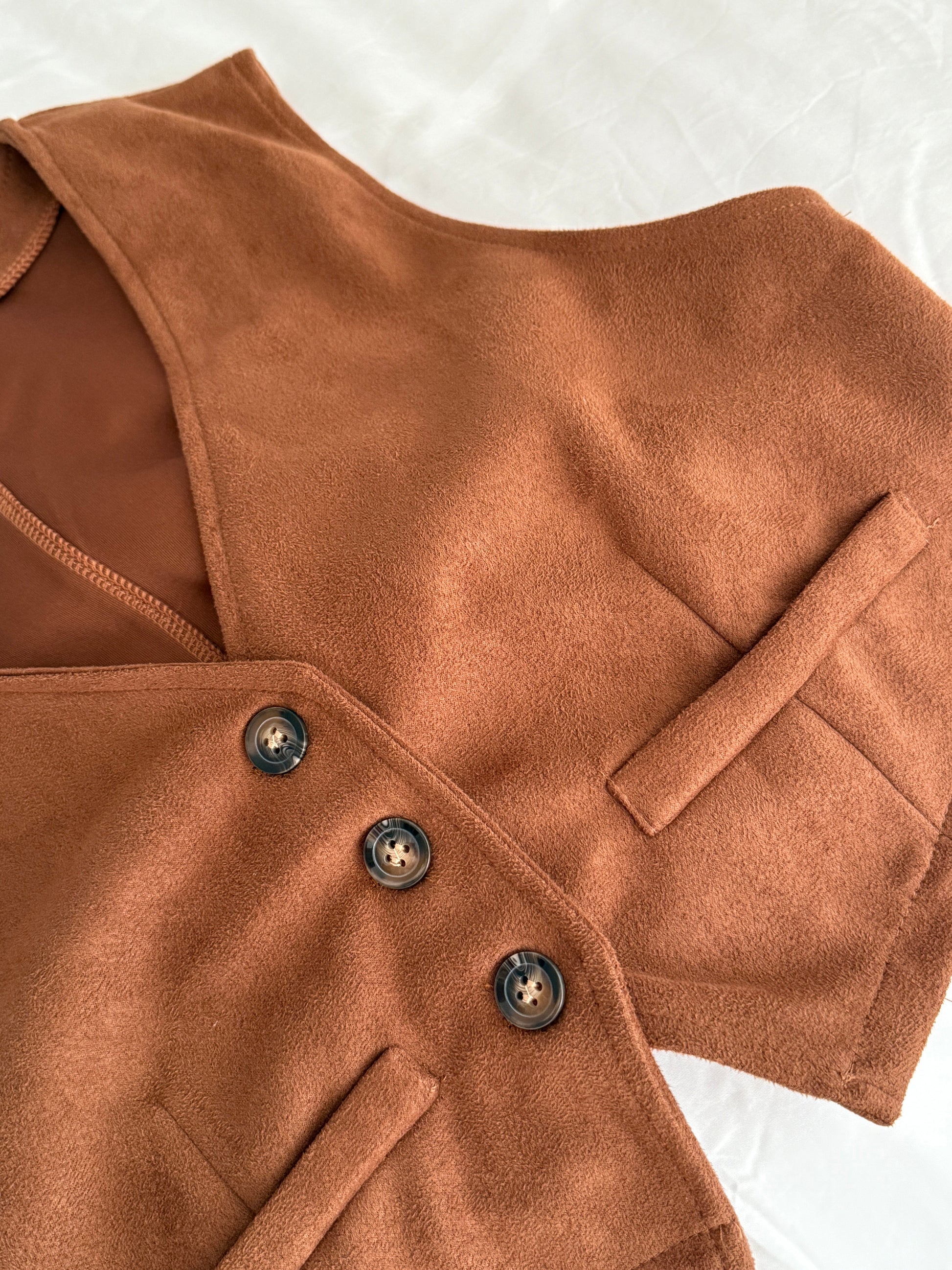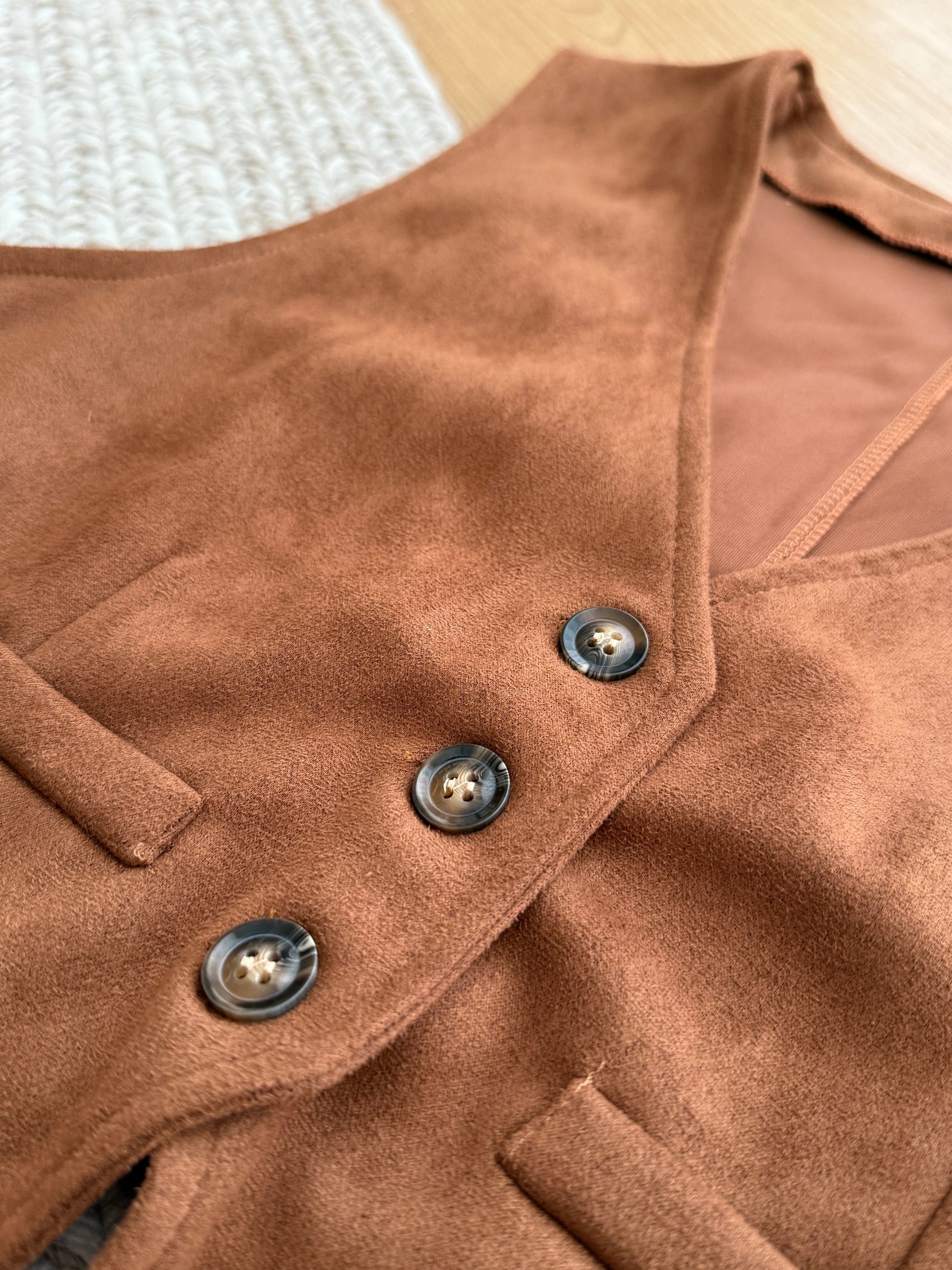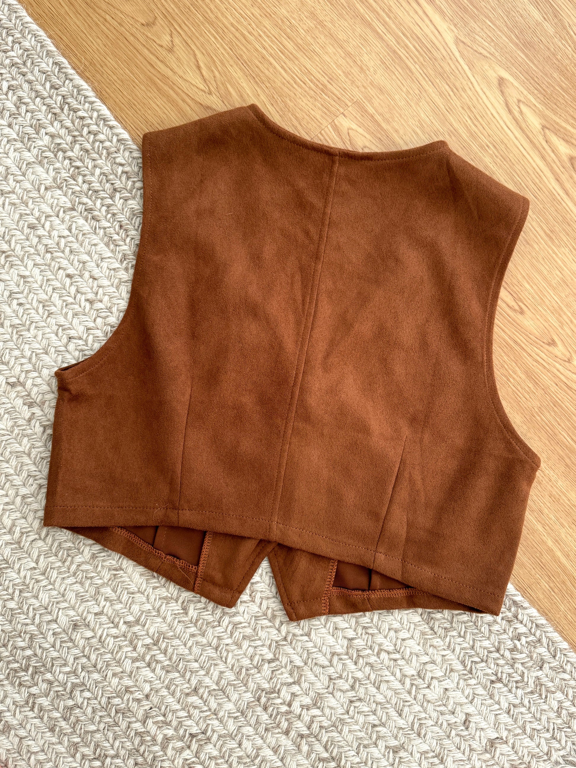 Vintage 70s inspired faux suede vest with a v-neckline, button up front and faux pockets in a cropped construction.聽