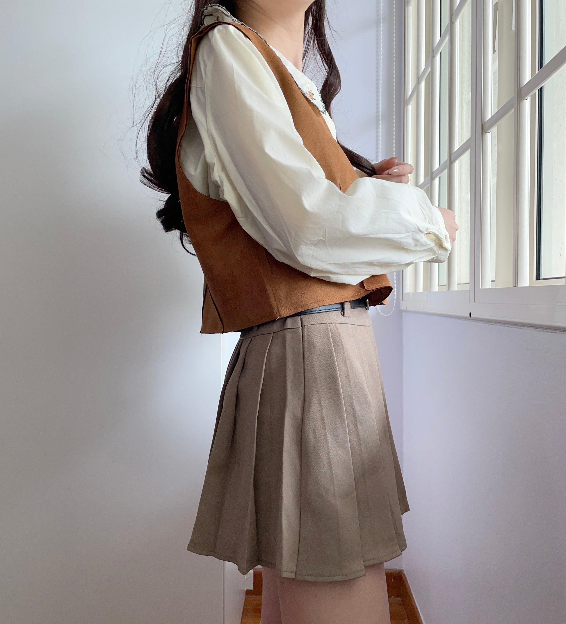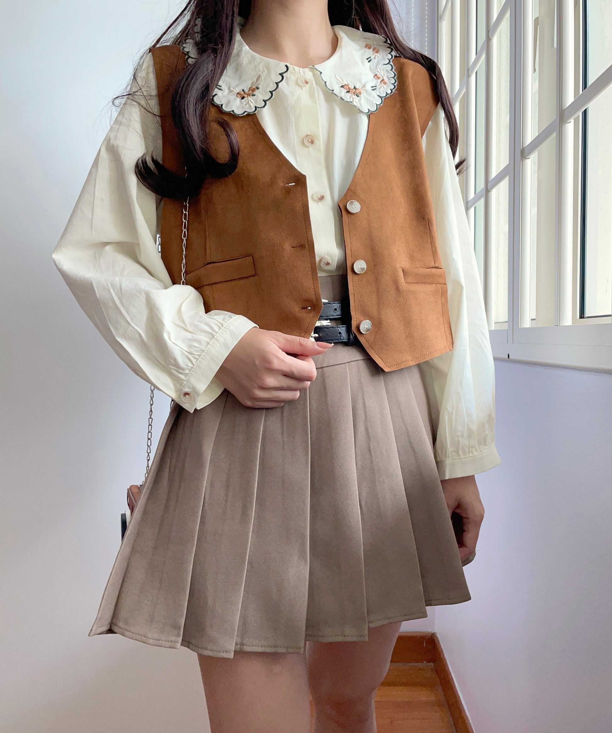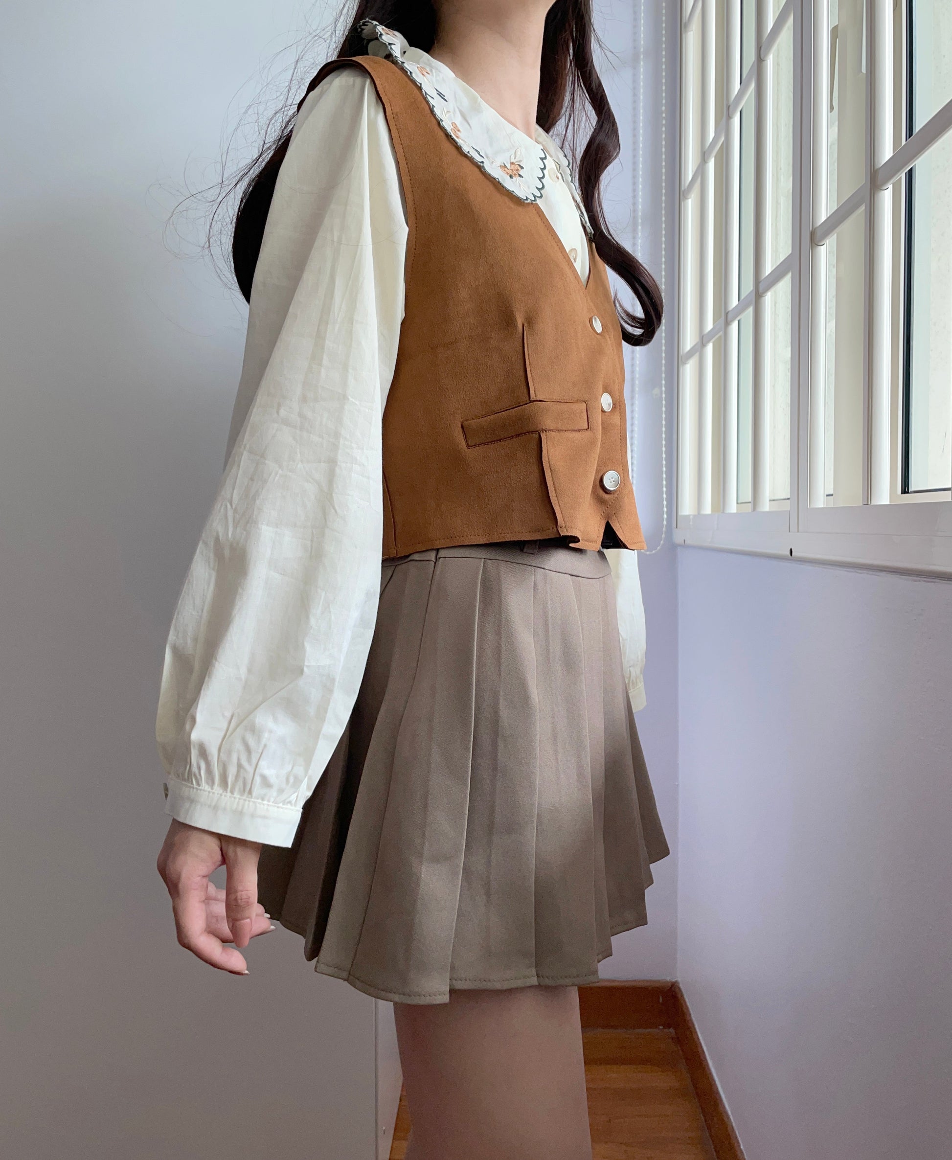Vintage 70s inspired faux suede vest with a v-neckline, button up front and faux pockets in a cropped construction.聽
