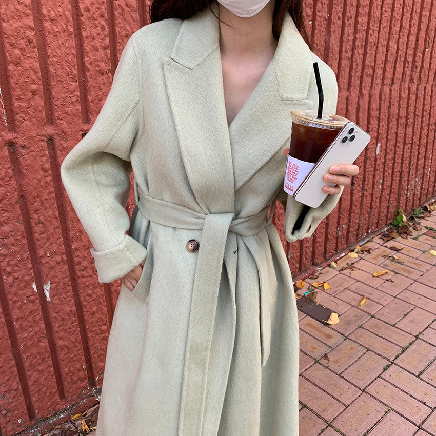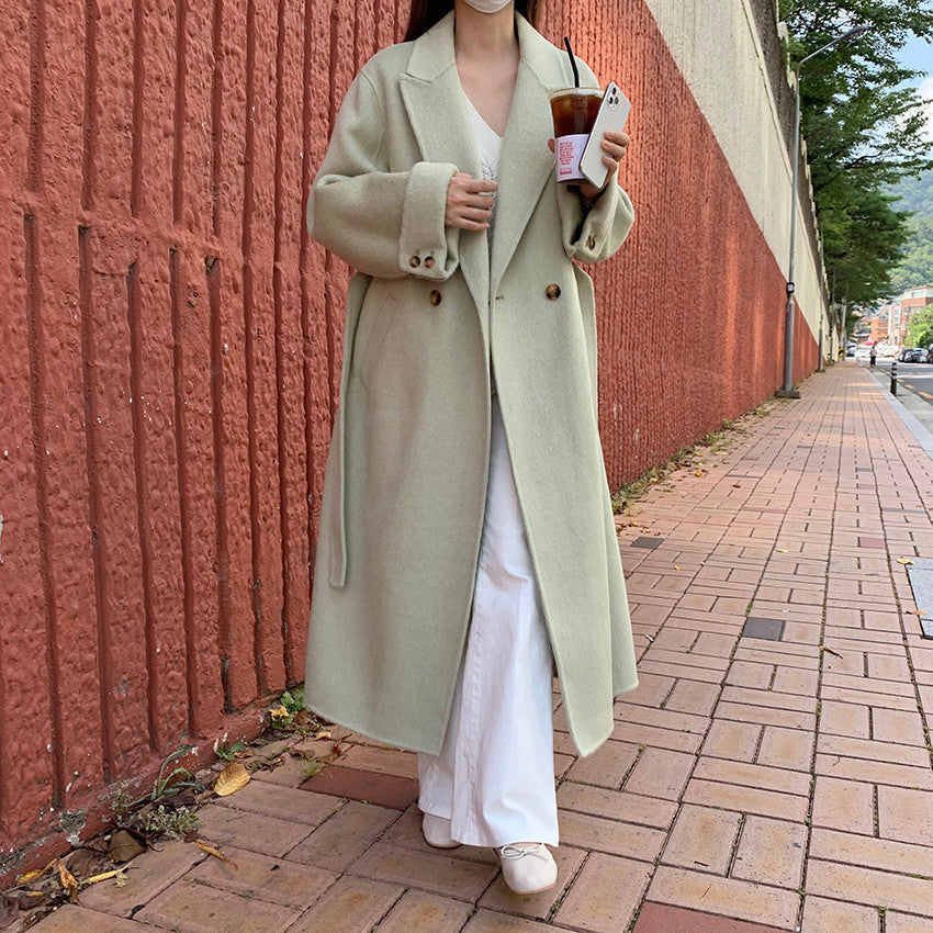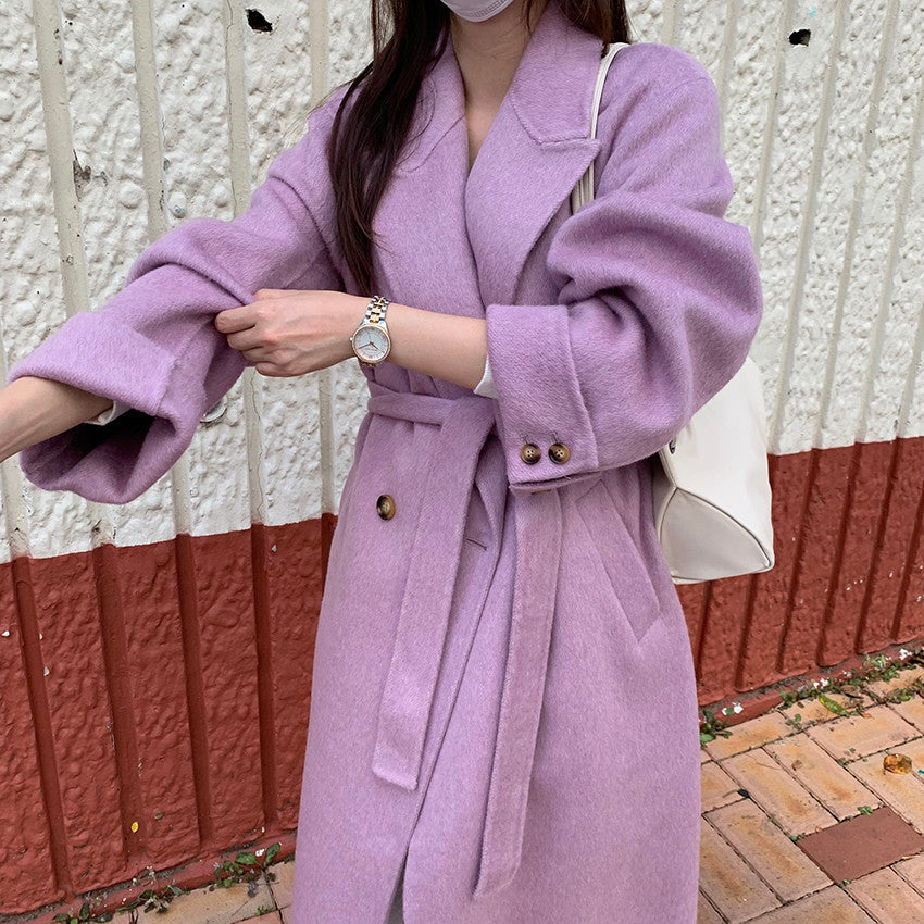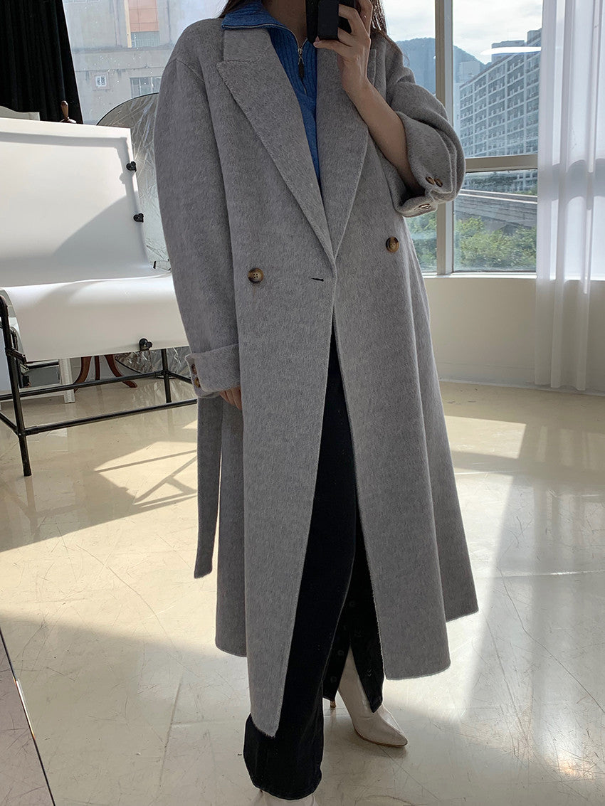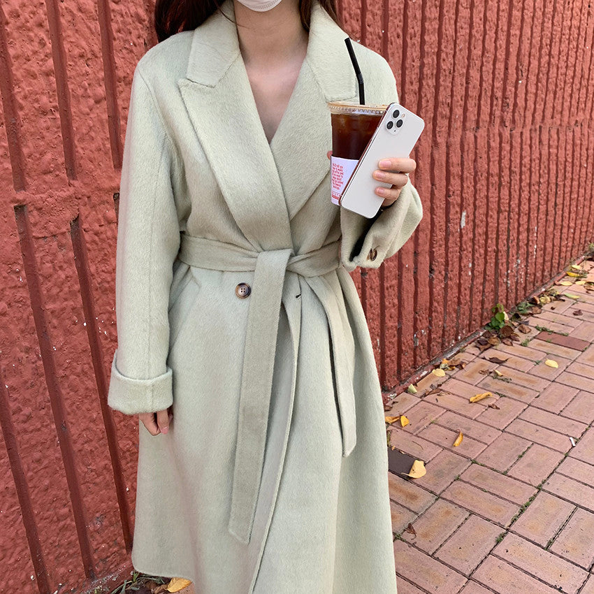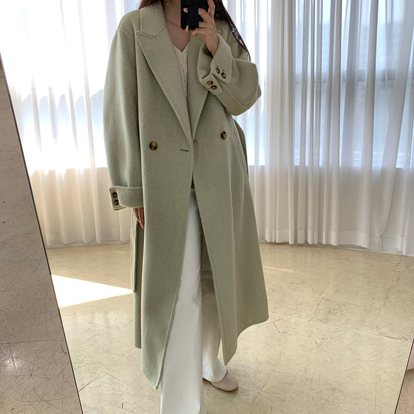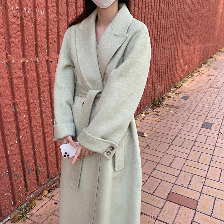 Faux聽wool coat with notched lapels and front button closure. Fold聽up button cuffs for added detail. Removable waist sash. Polyester satin lining.