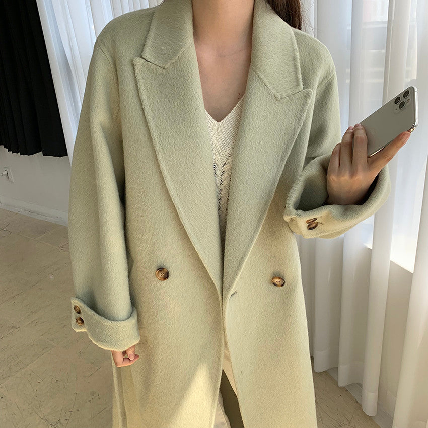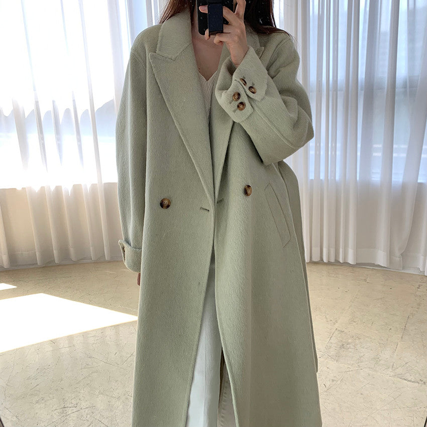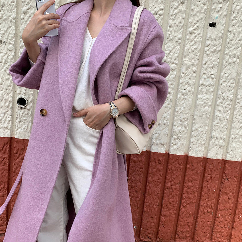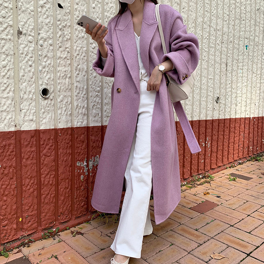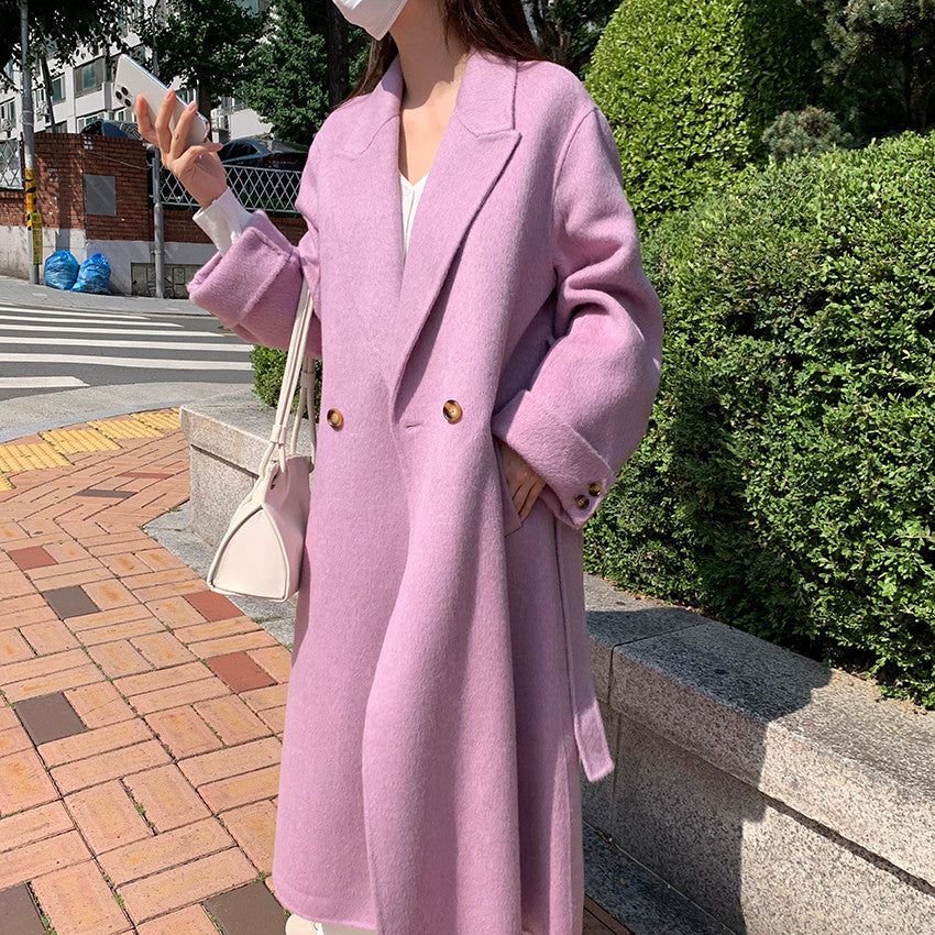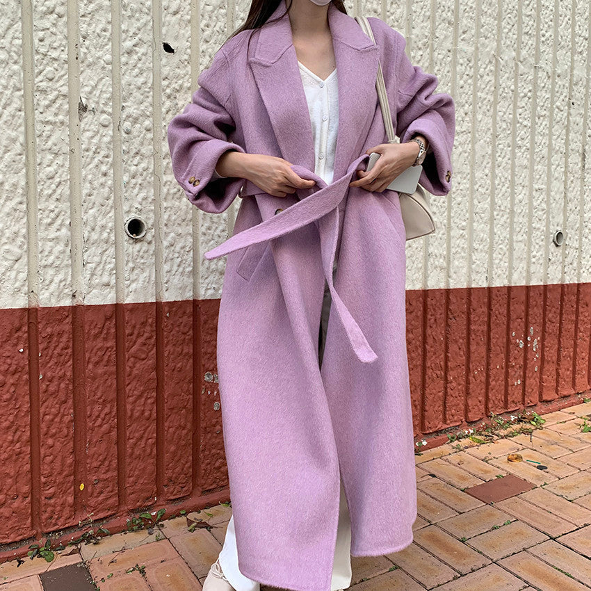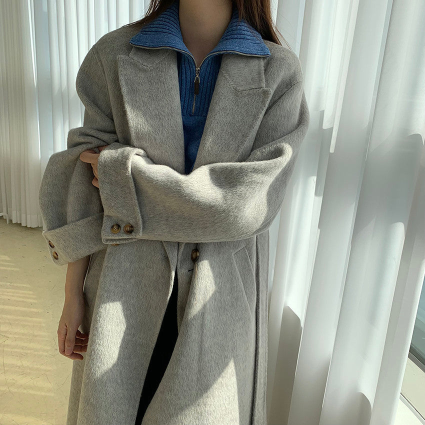 Faux聽wool coat with notched lapels and front button closure. Fold聽up button cuffs for added detail. Removable waist sash. Polyester satin lining.