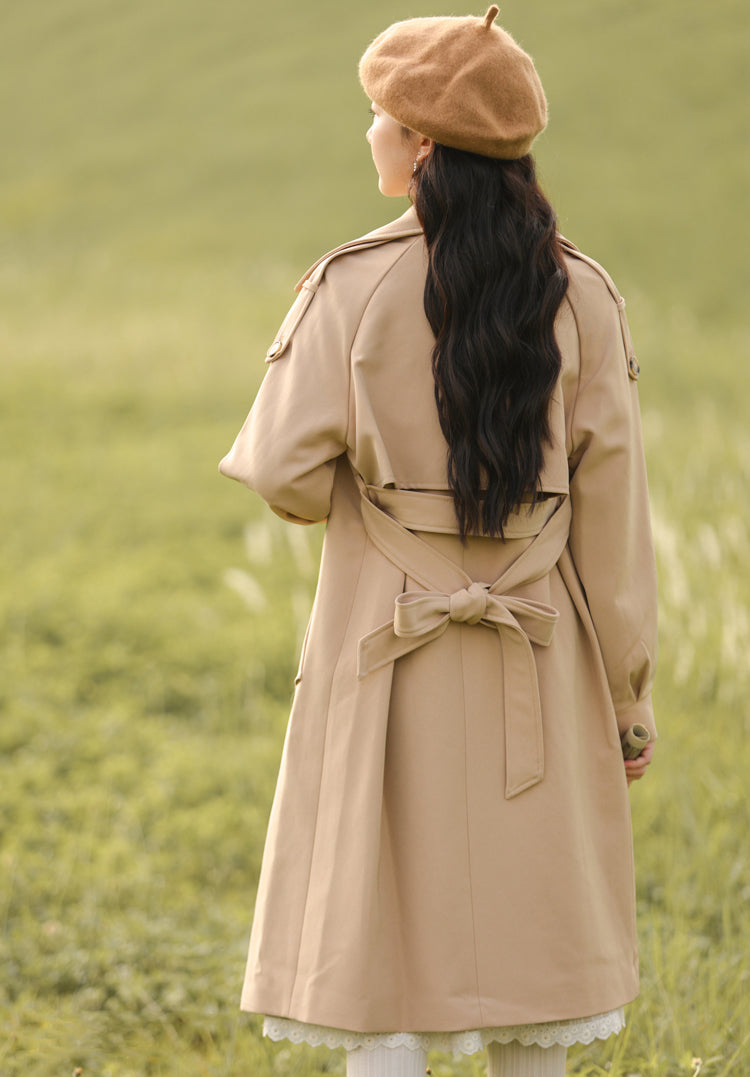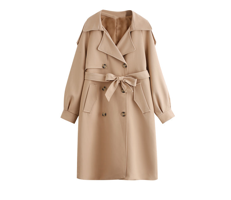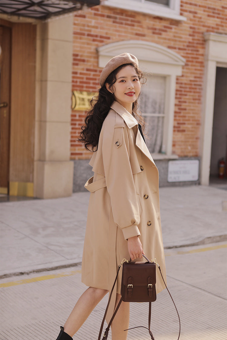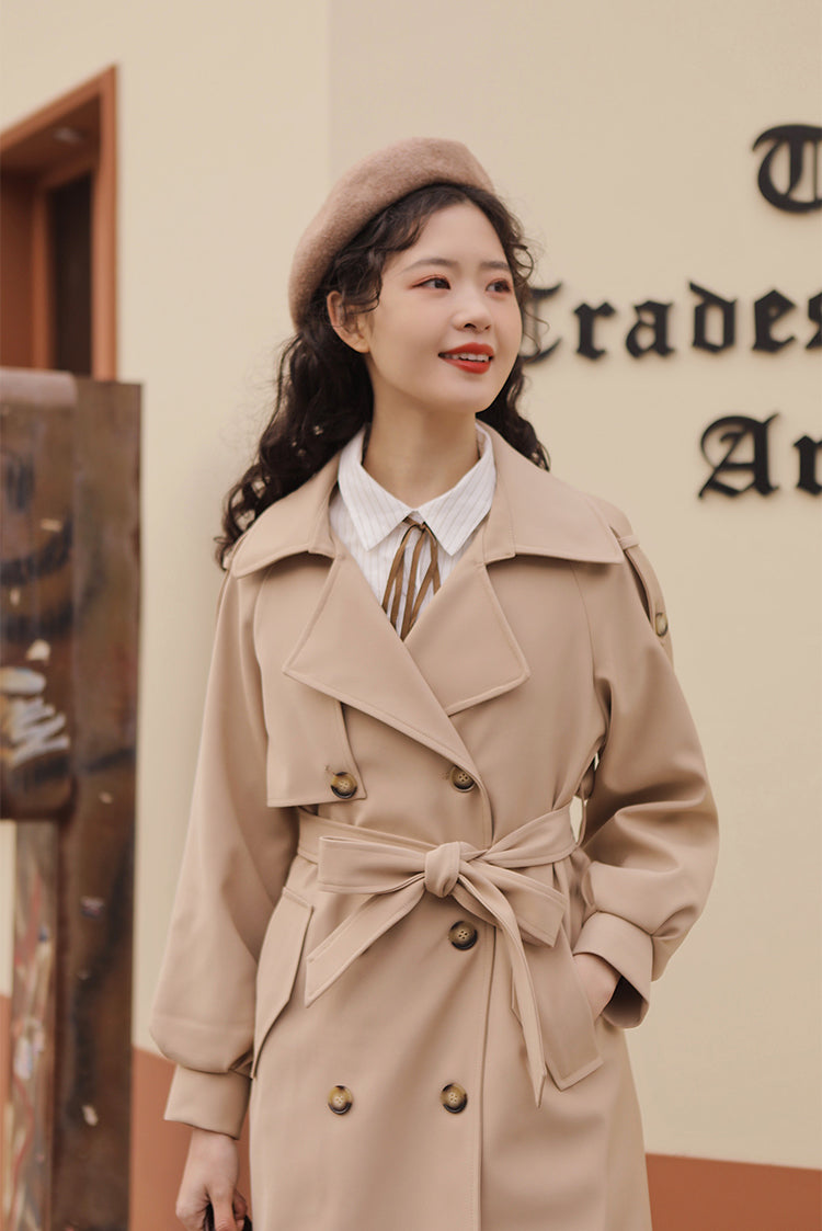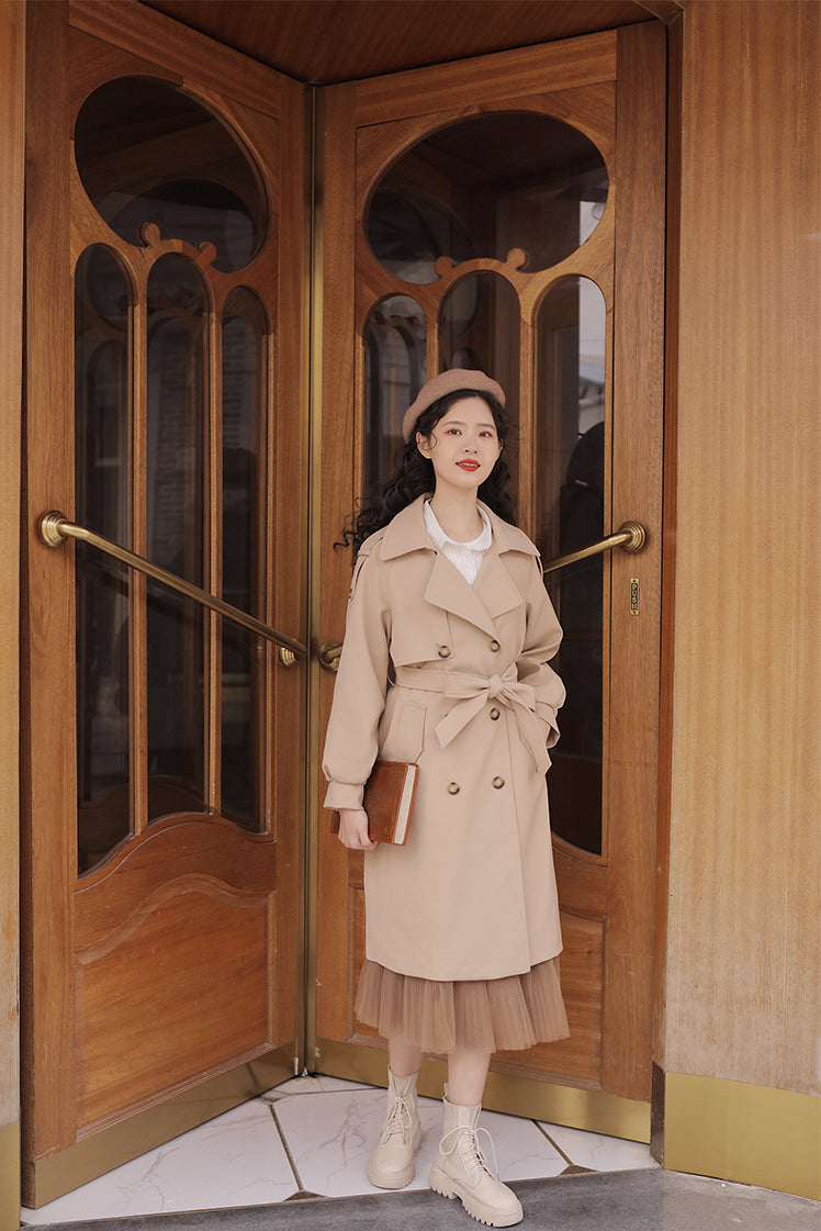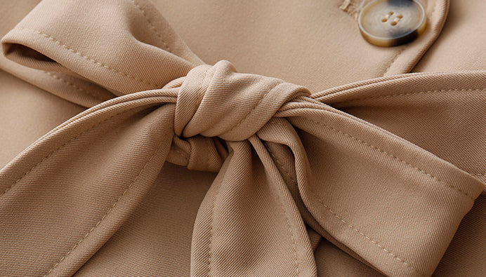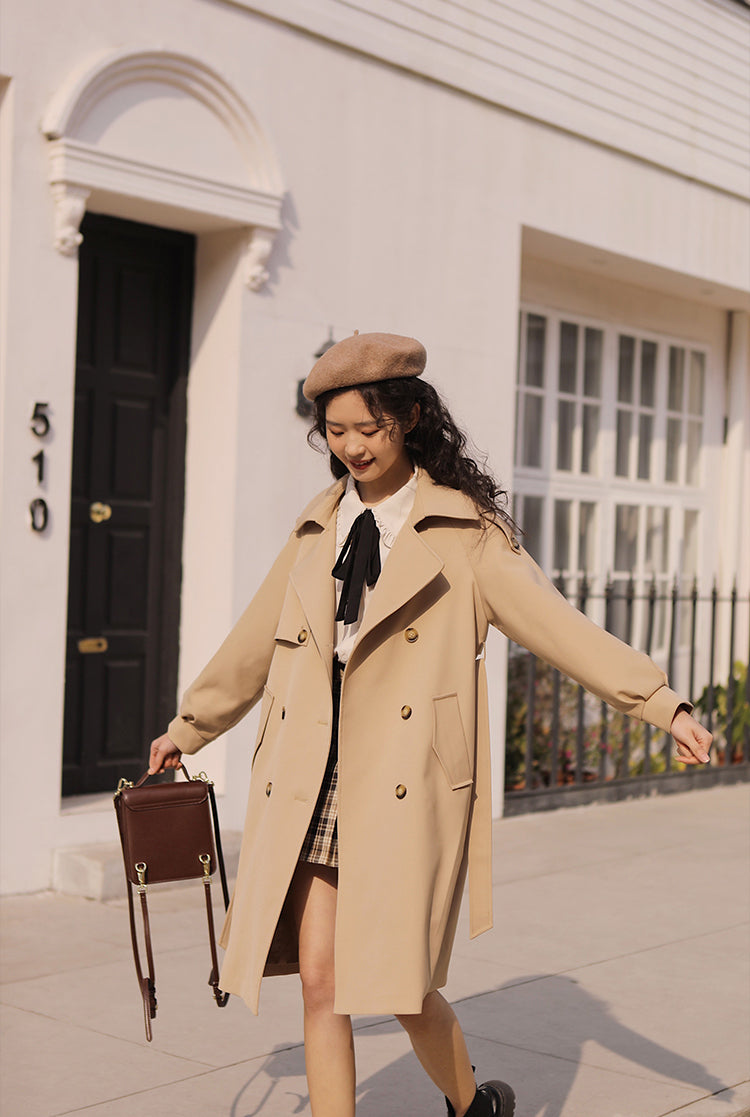 Essential trench coat in a classic and versatile color for easy matching. Features a relaxed silhouette, notched lapels, double breasted button closure, side pockets and waist sash.聽