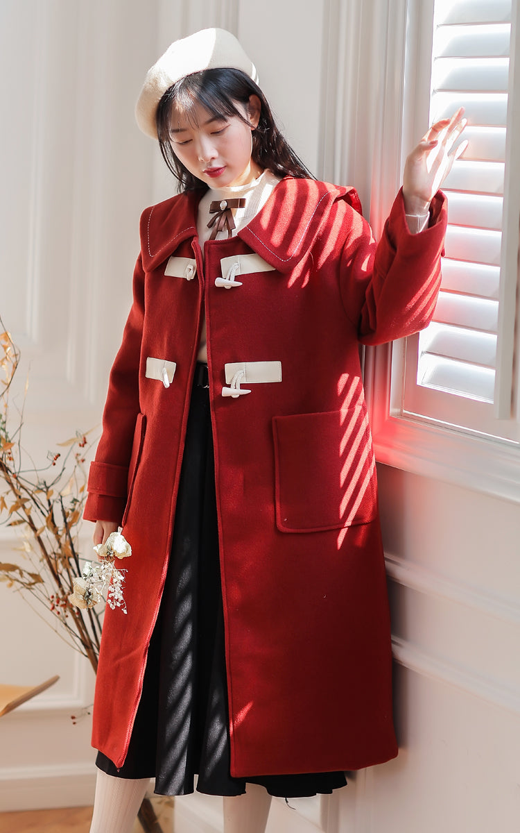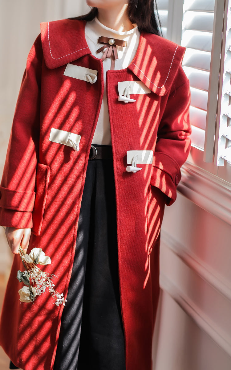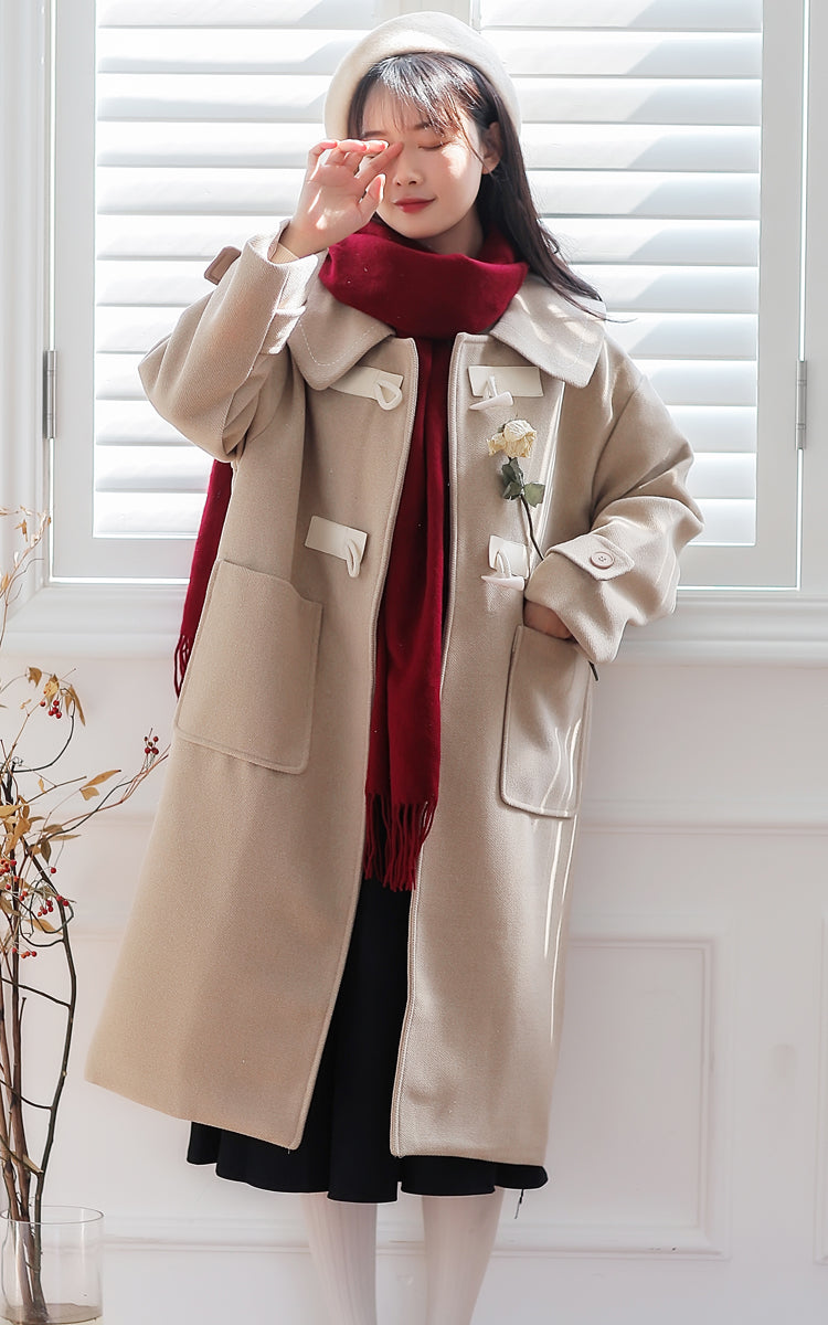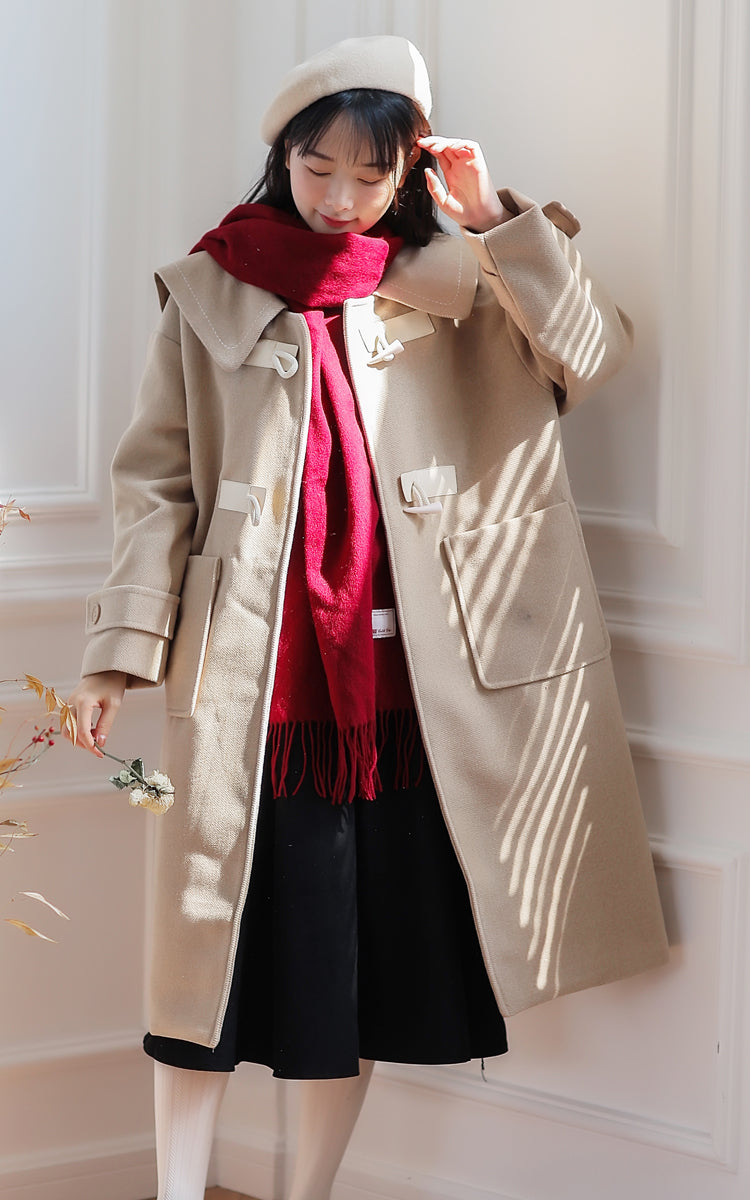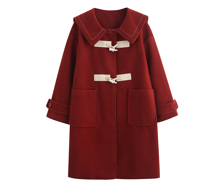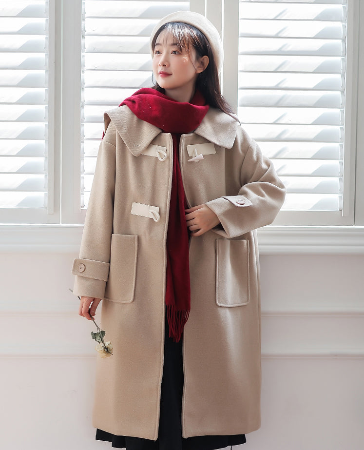 Oversized faux wool coat with an oversized peter pan collar, toggle buttons and large side pockets. Slightly padded lining for extra warmth.
