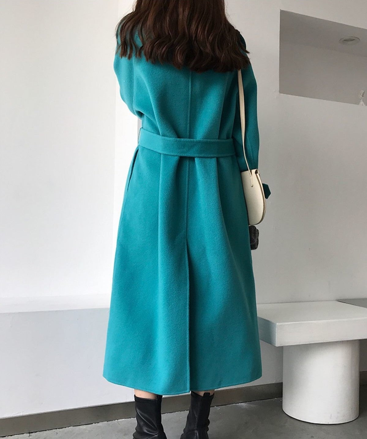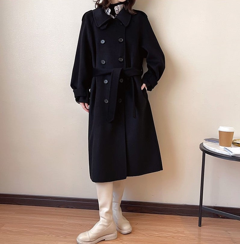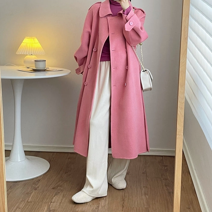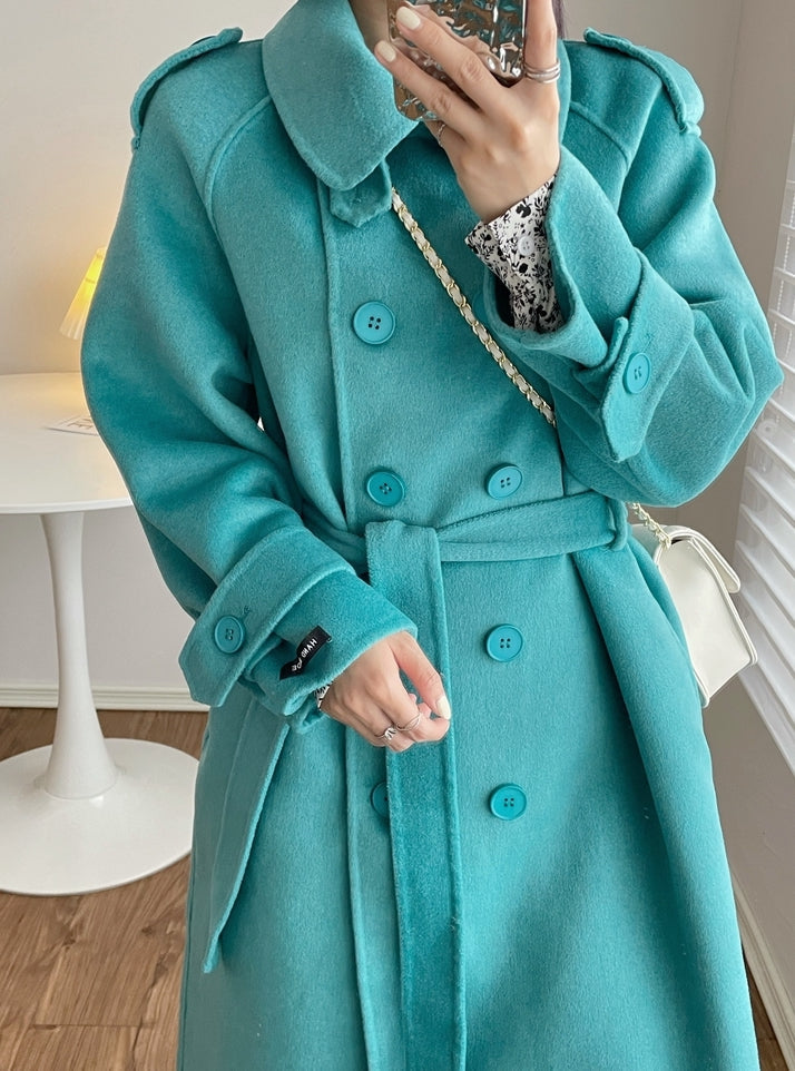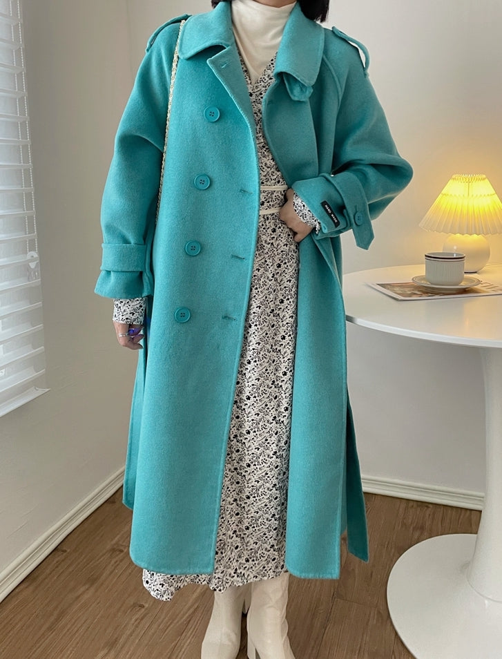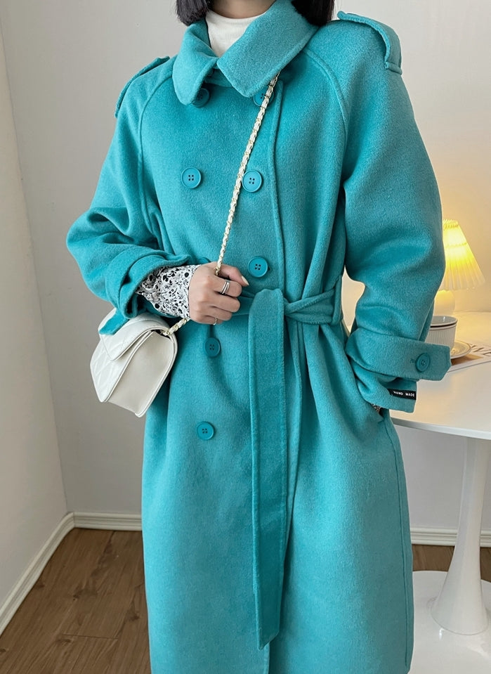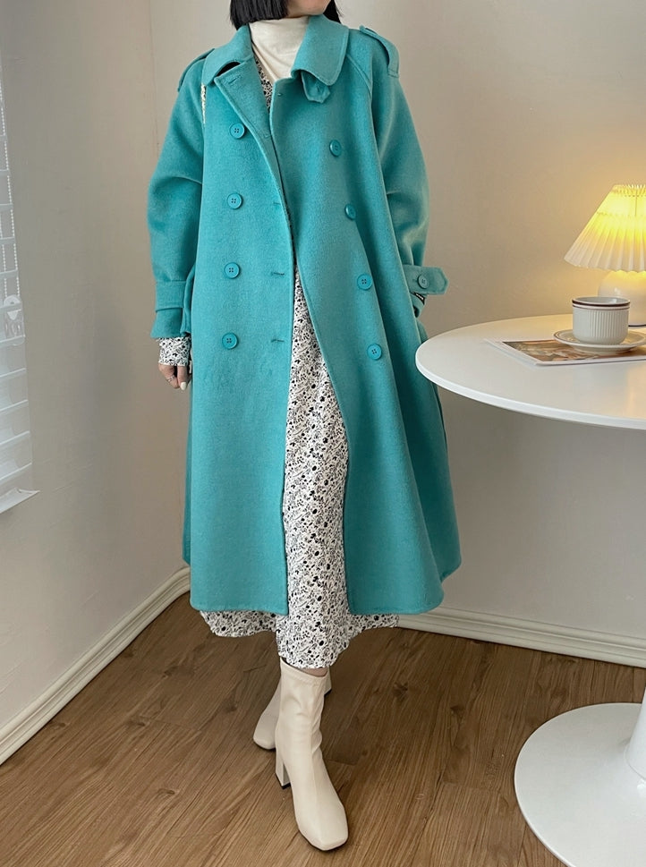 Pure wool double breasted coat in a midi length to keep you warm and toasty. Roomy fit all over, including shoulders and arms to accommodate thick sweaters and layering. Removable waist sash for added cinching definition.聽