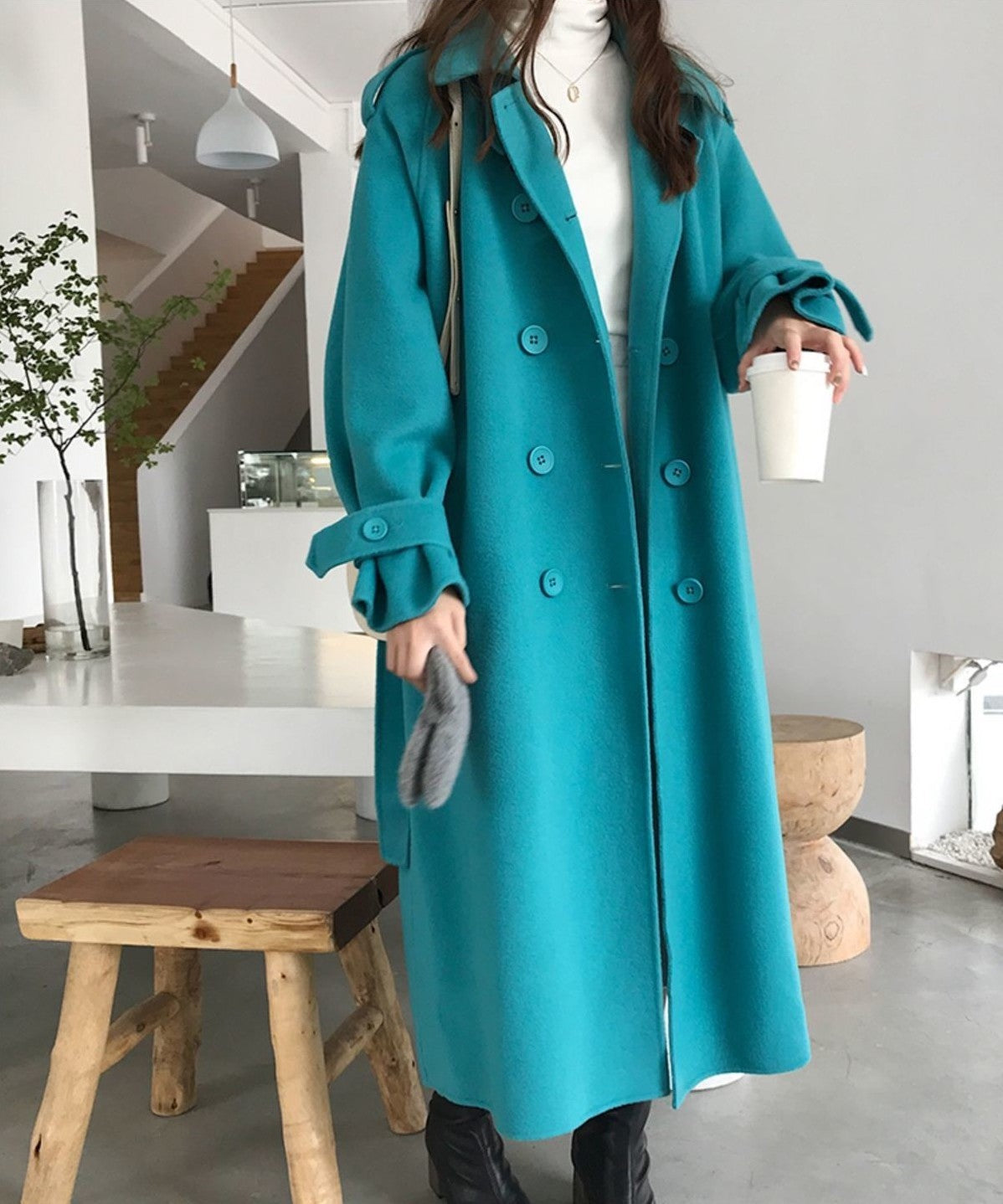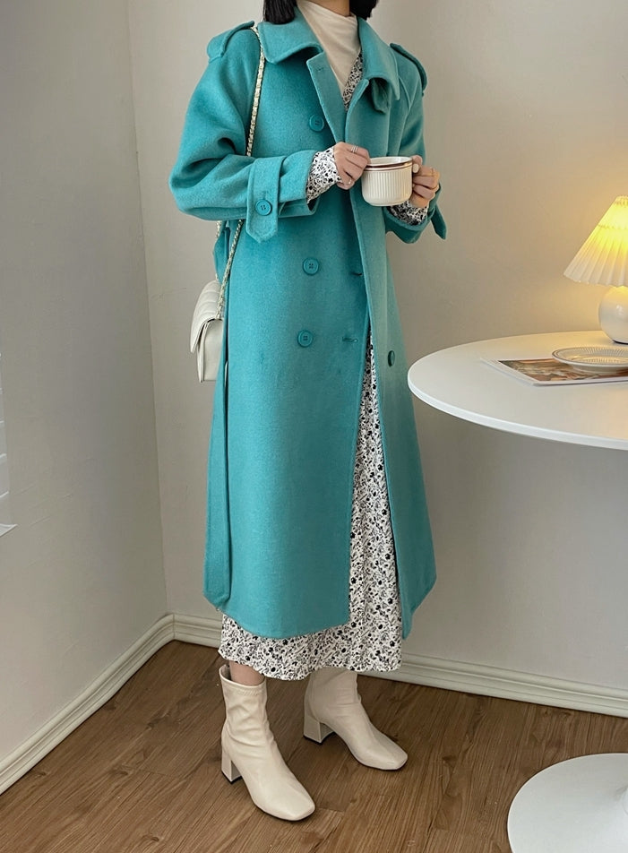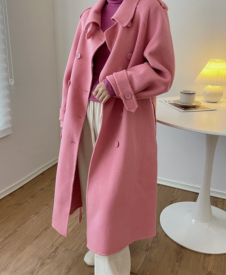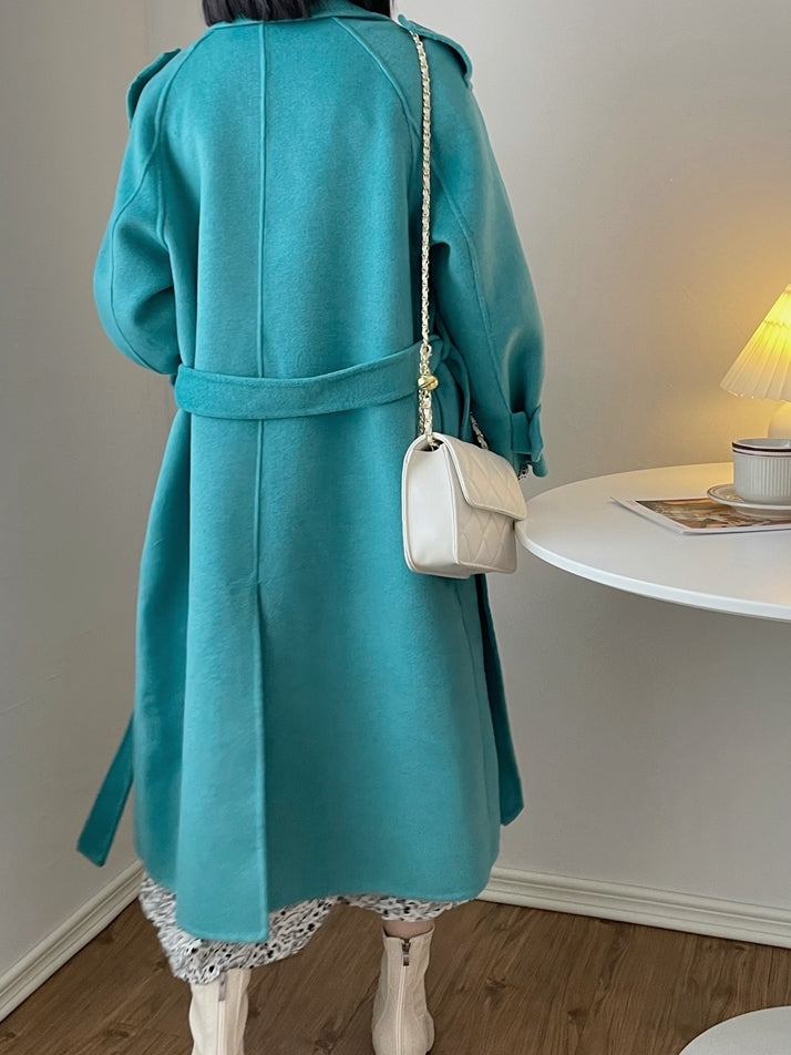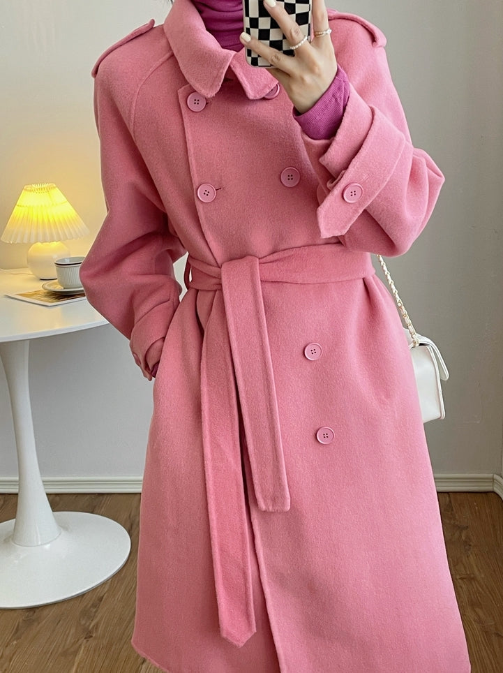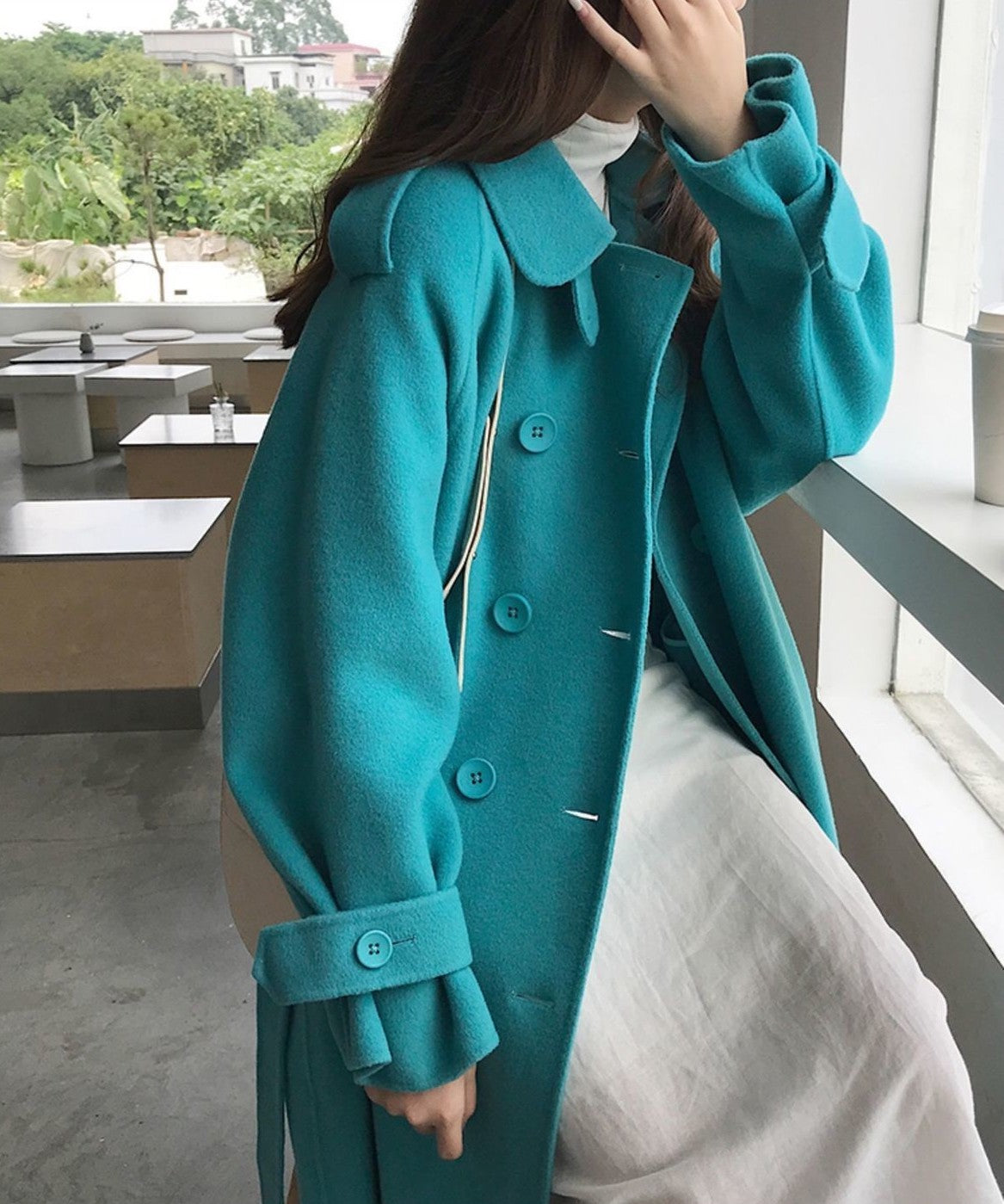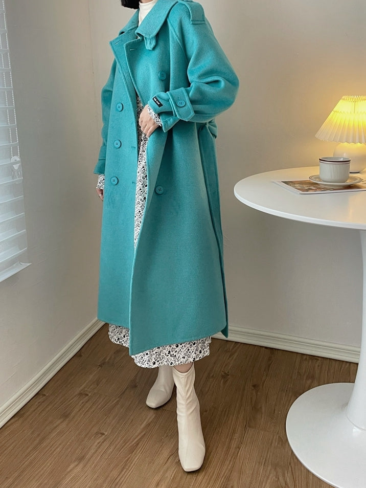 Pure wool double breasted coat in a midi length to keep you warm and toasty. Roomy fit all over, including shoulders and arms to accommodate thick sweaters and layering. Removable waist sash for added cinching definition.聽