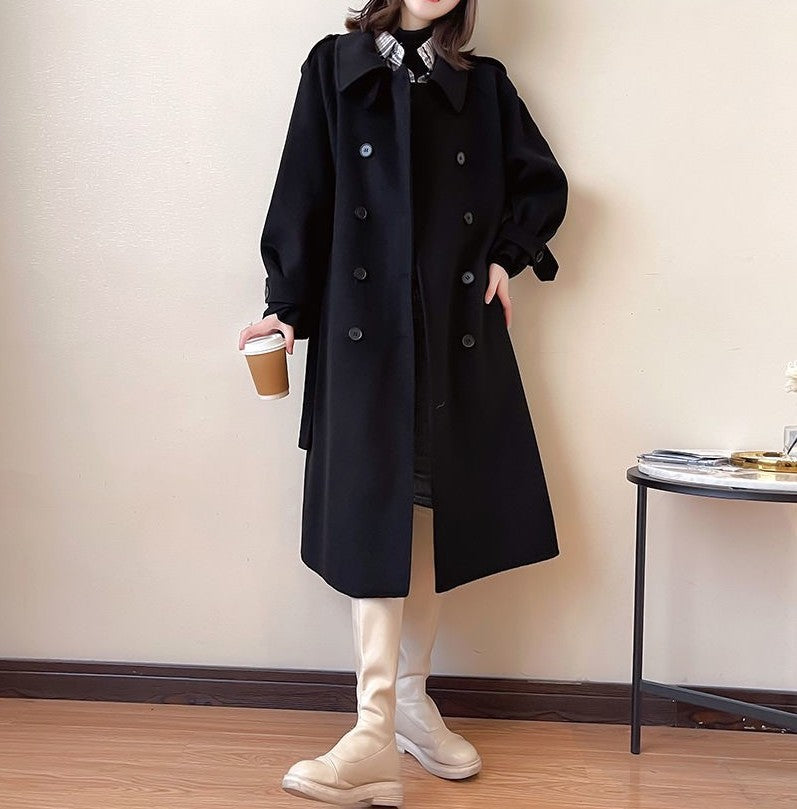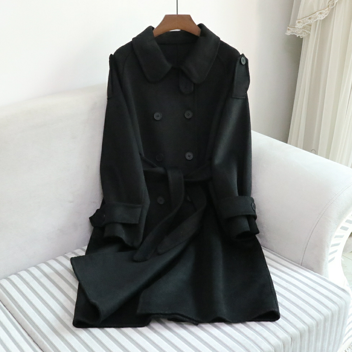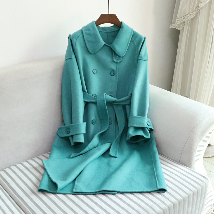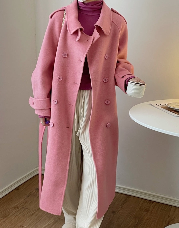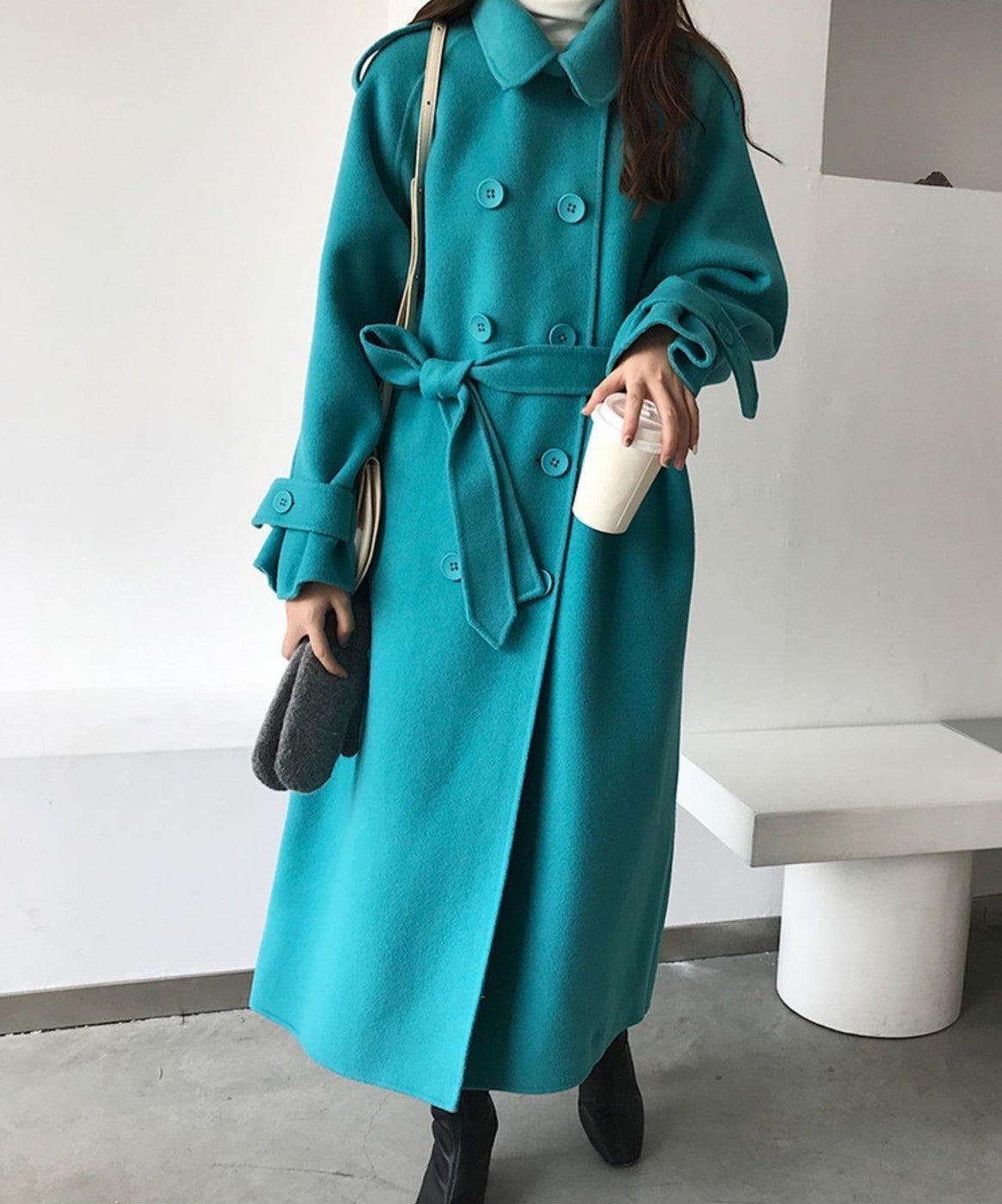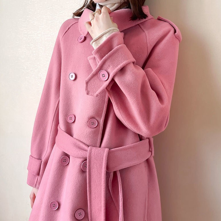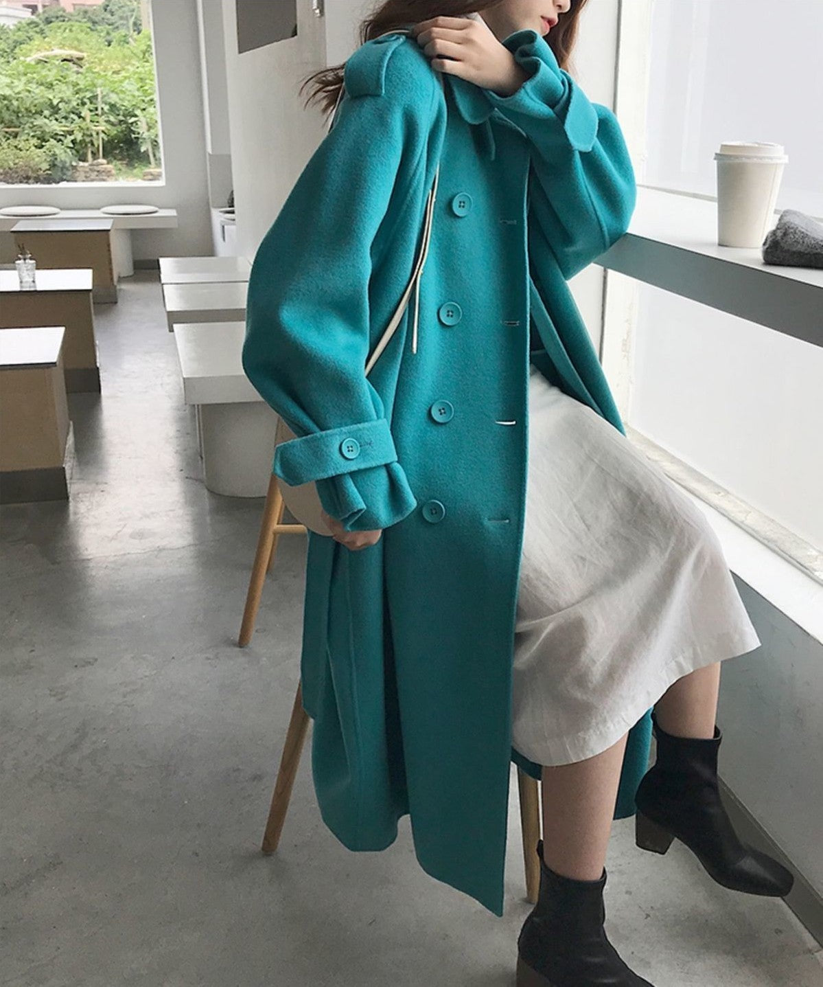 Pure wool double breasted coat in a midi length to keep you warm and toasty. Roomy fit all over, including shoulders and arms to accommodate thick sweaters and layering. Removable waist sash for added cinching definition.聽