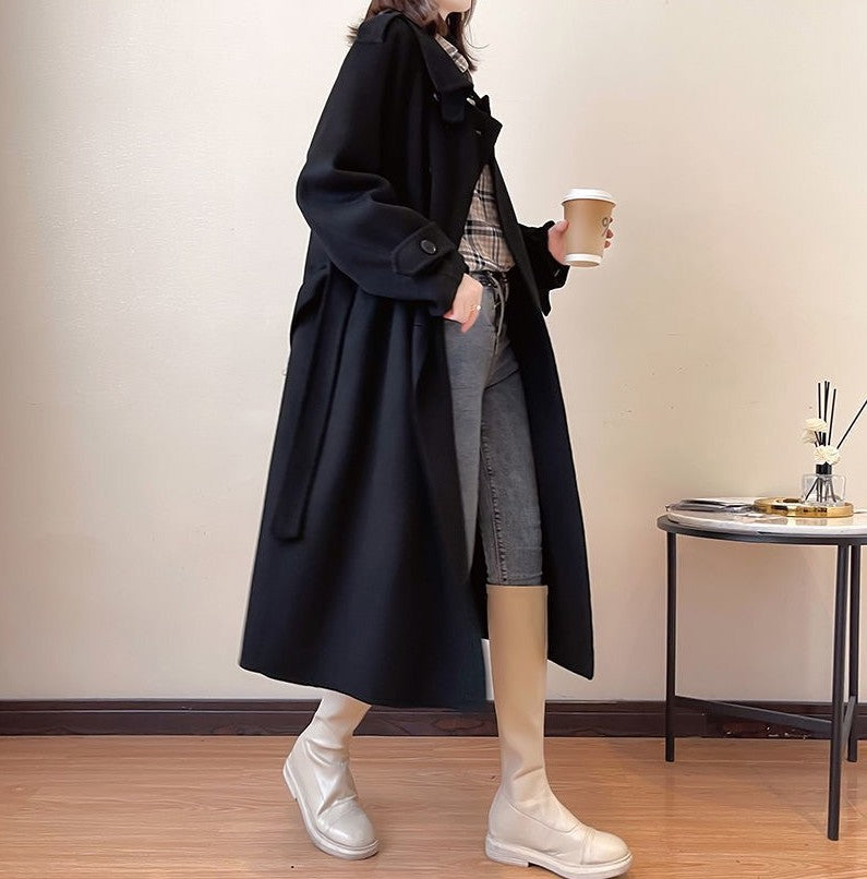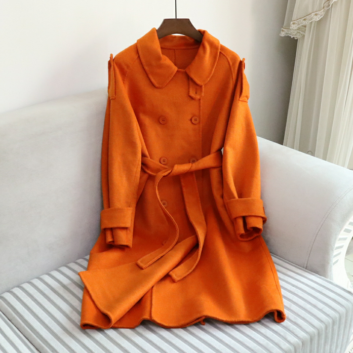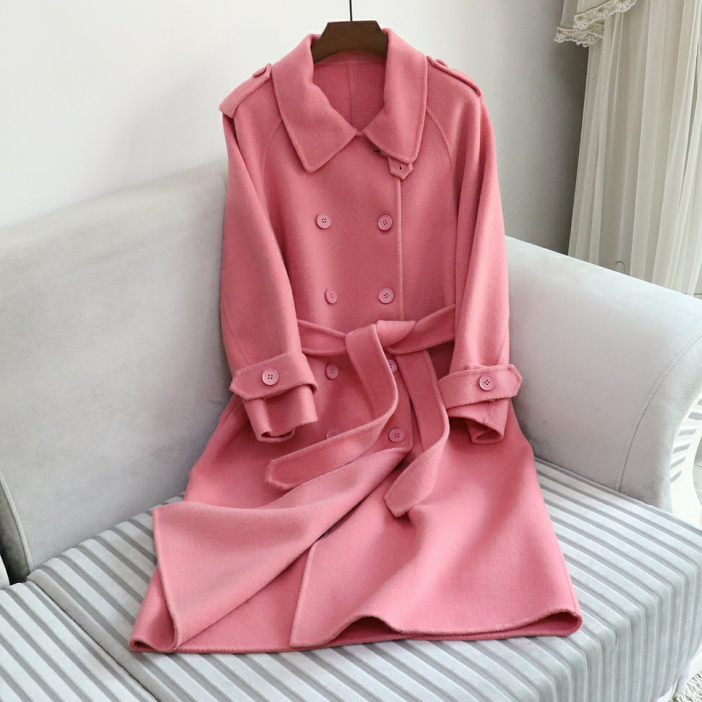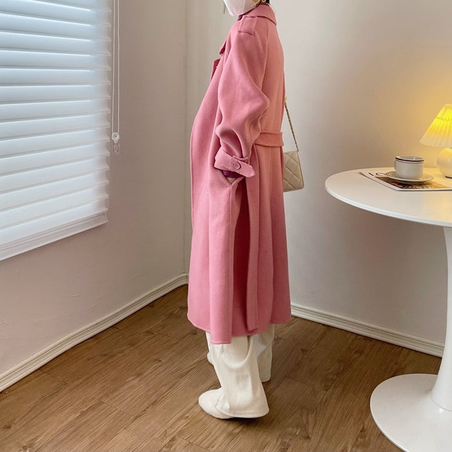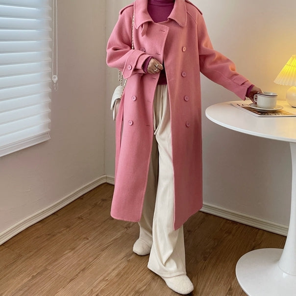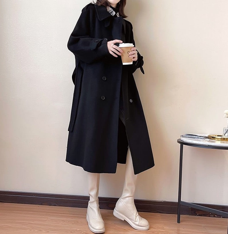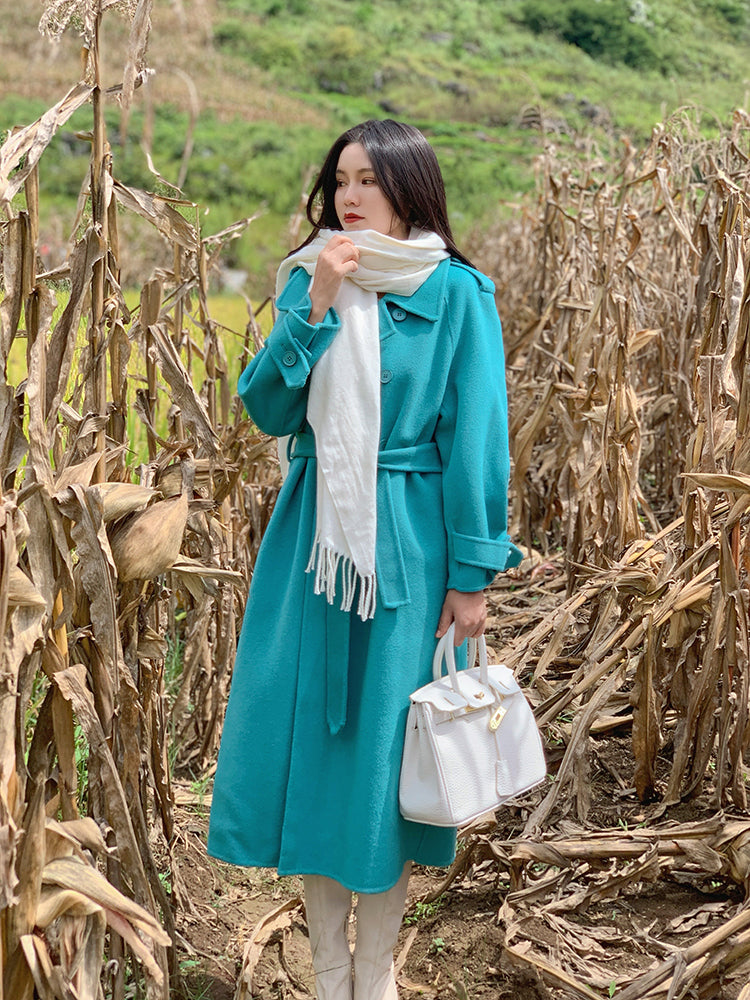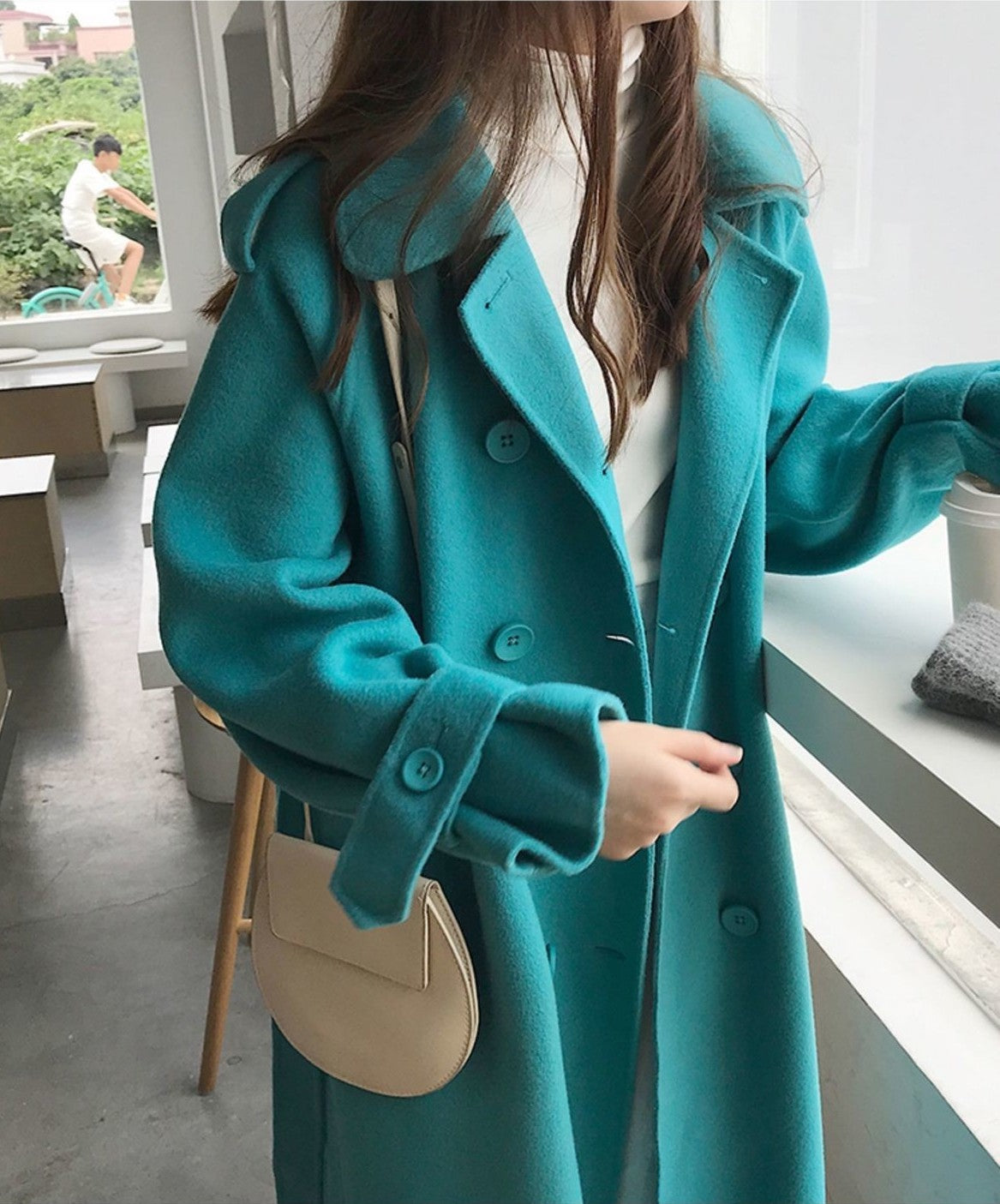 Pure wool double breasted coat in a midi length to keep you warm and toasty. Roomy fit all over, including shoulders and arms to accommodate thick sweaters and layering. Removable waist sash for added cinching definition.聽