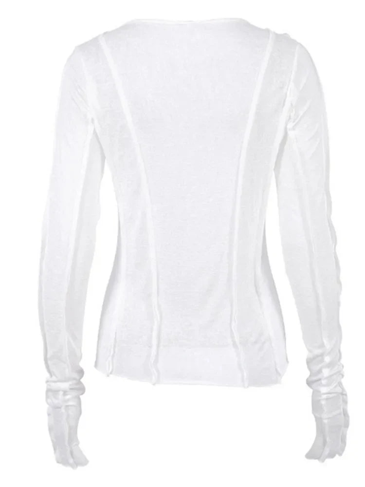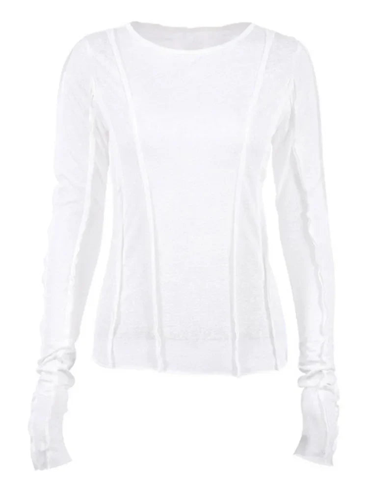 FashionSierra - White O-Neck Yellow Long Sleeve Fall Slim Elastic Solid Crop Tops