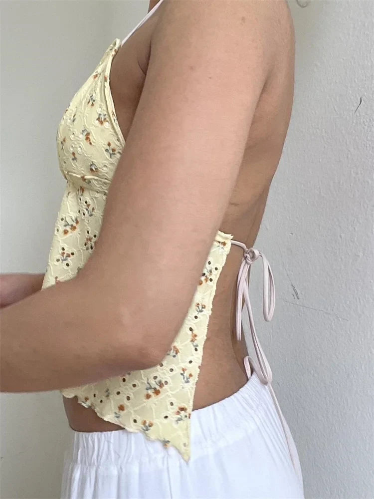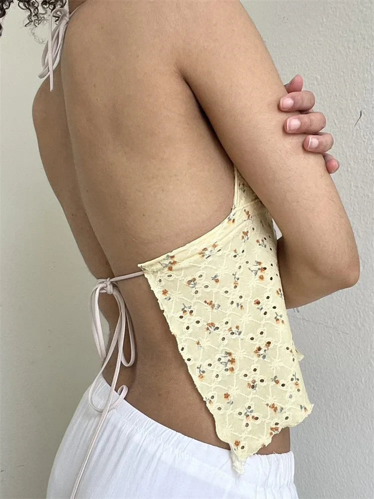 FashionSierra - 2025 Retro Lace Halter Camis Embroidery Floral Print Backless Tie-up Summer Mini Vest Crop Tops