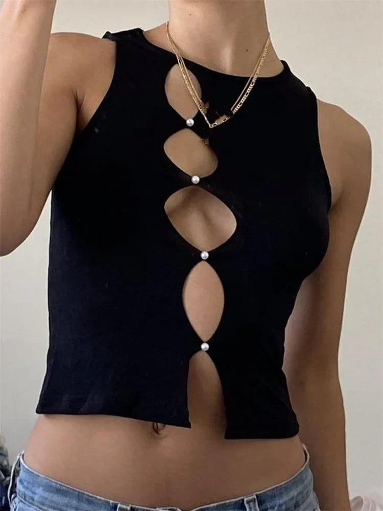 FashionSierra - 2025 Hollow Out Cropped Summer Sleeveless Irregular Buttons Up Black Solid Mini Vest Club Streetwear Crop Tops