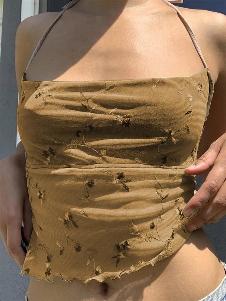 FashionSierra - 2025 Sleeveless Halter Lace-up Camis for Women Square Neck Floral Backless Tank Irregular Hem Mini Vest Crop Tops