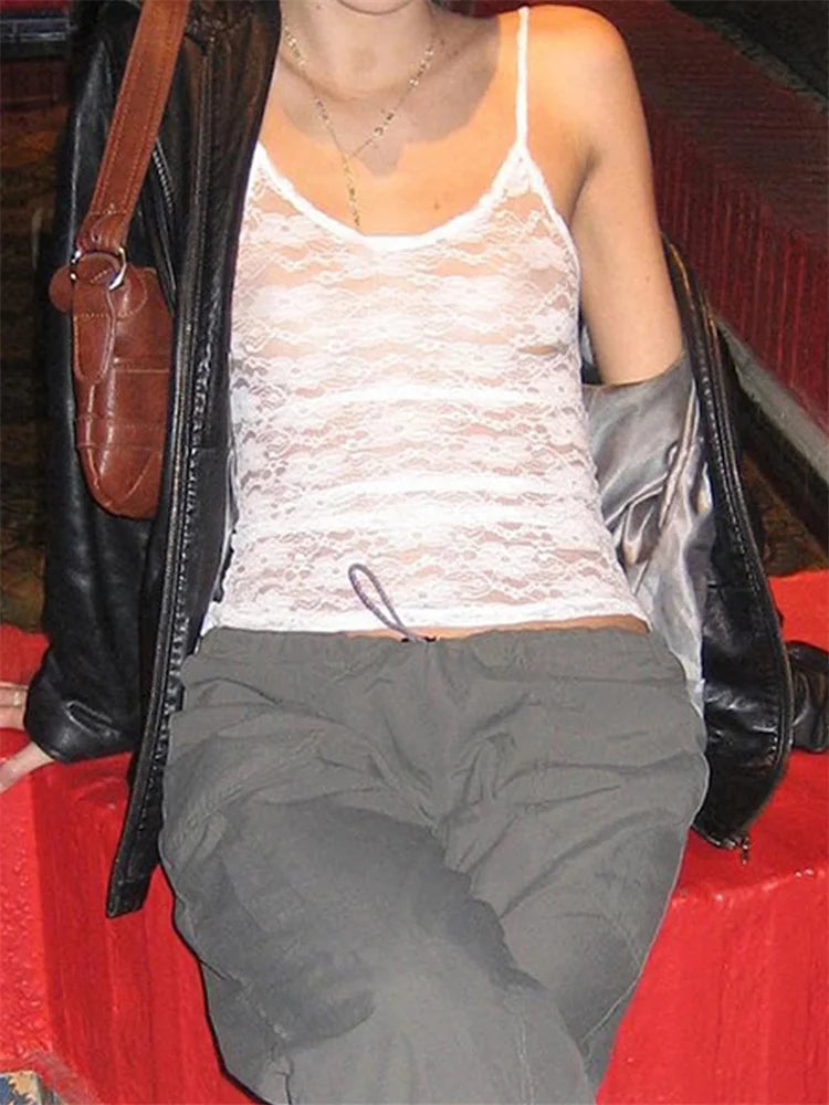 FashionSierra - 2025 Spaghetti Strap Beach Camis Lace See Through Sleeveless Tank Summer Slim Fit Exposed Navel Vests Tops Crop Tops
