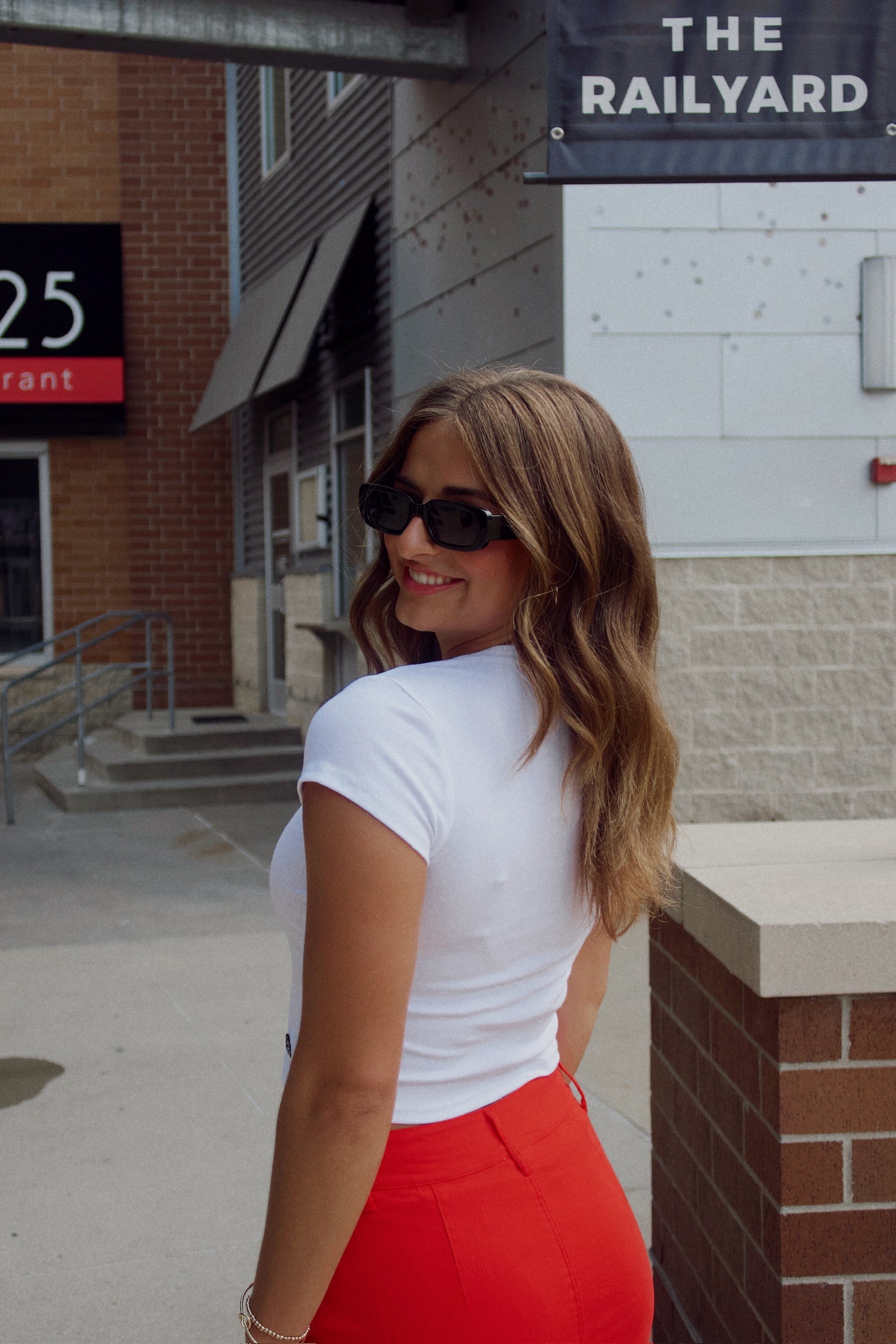 Go Big Red Baby Tee, white baby tee, round neckline, fitted tee, Nebraska huskers graphic in front, mid-length tee, game day style, Husker, college game day outfit, soft and stretchy material, FINAL SALE.
