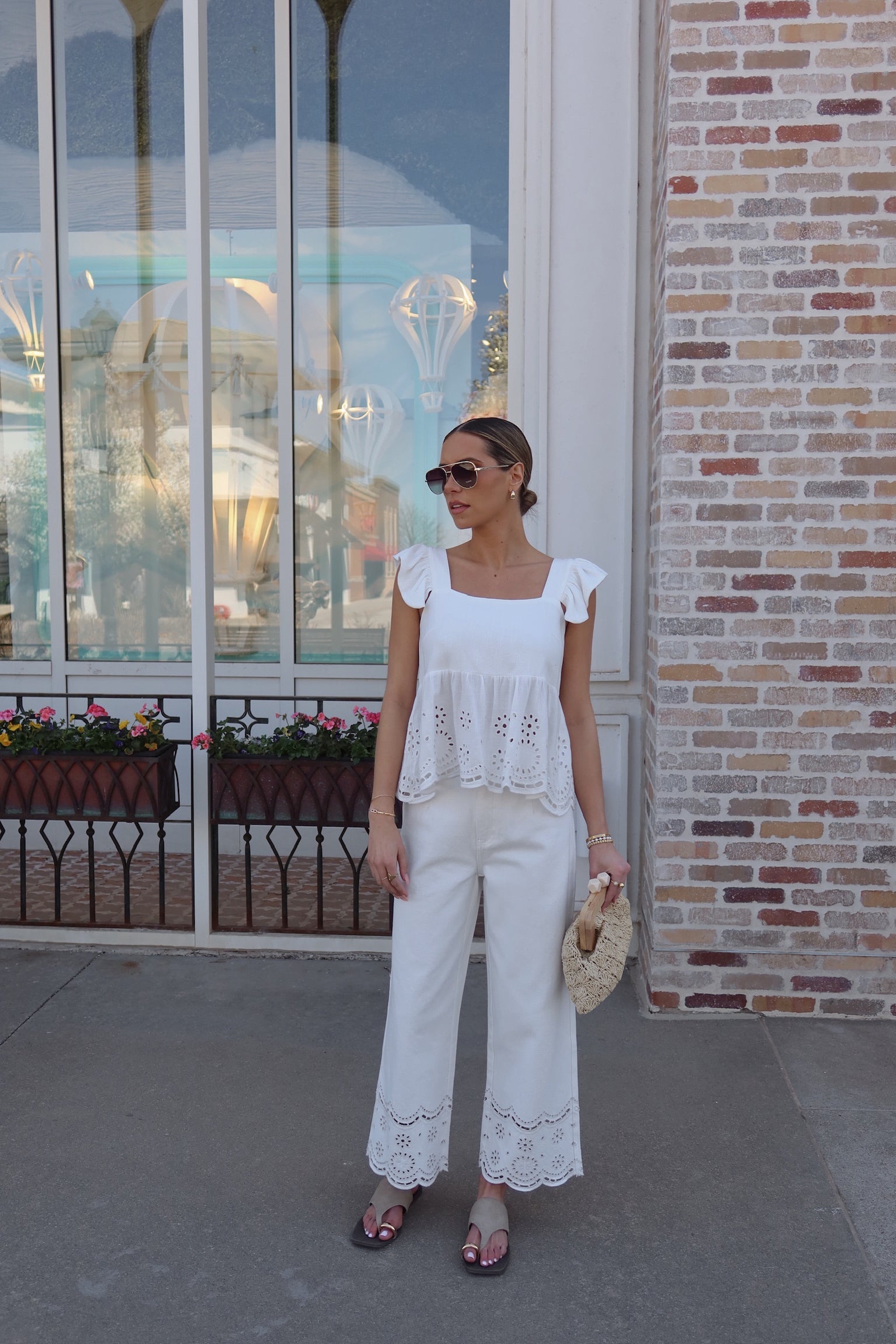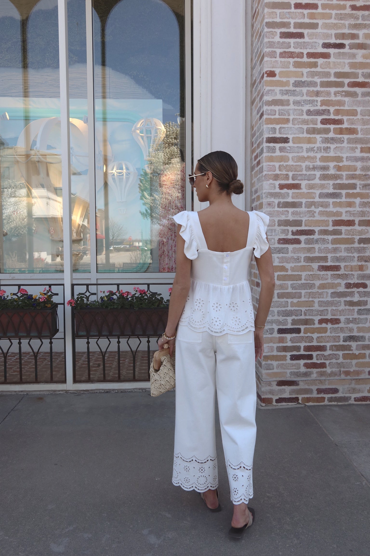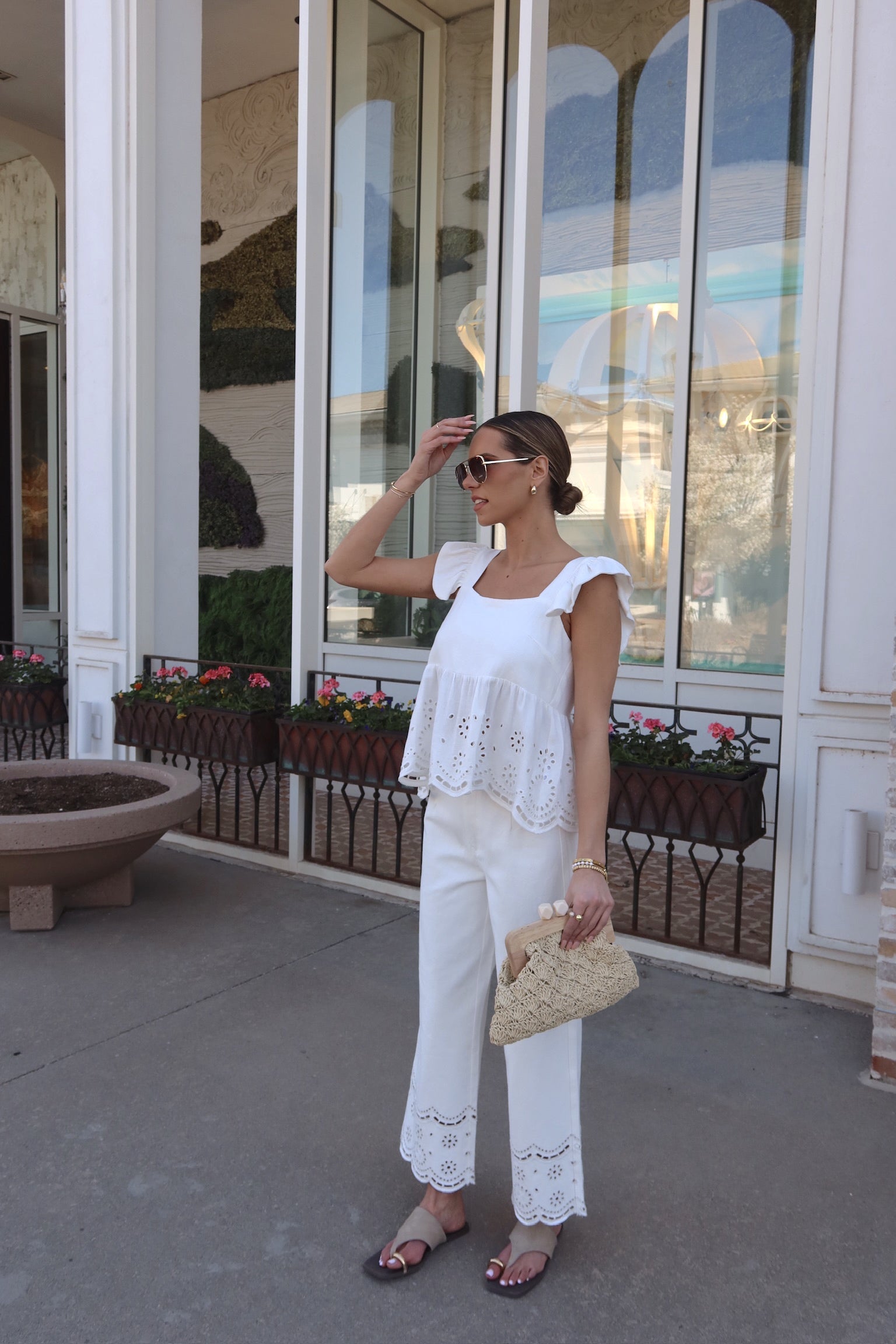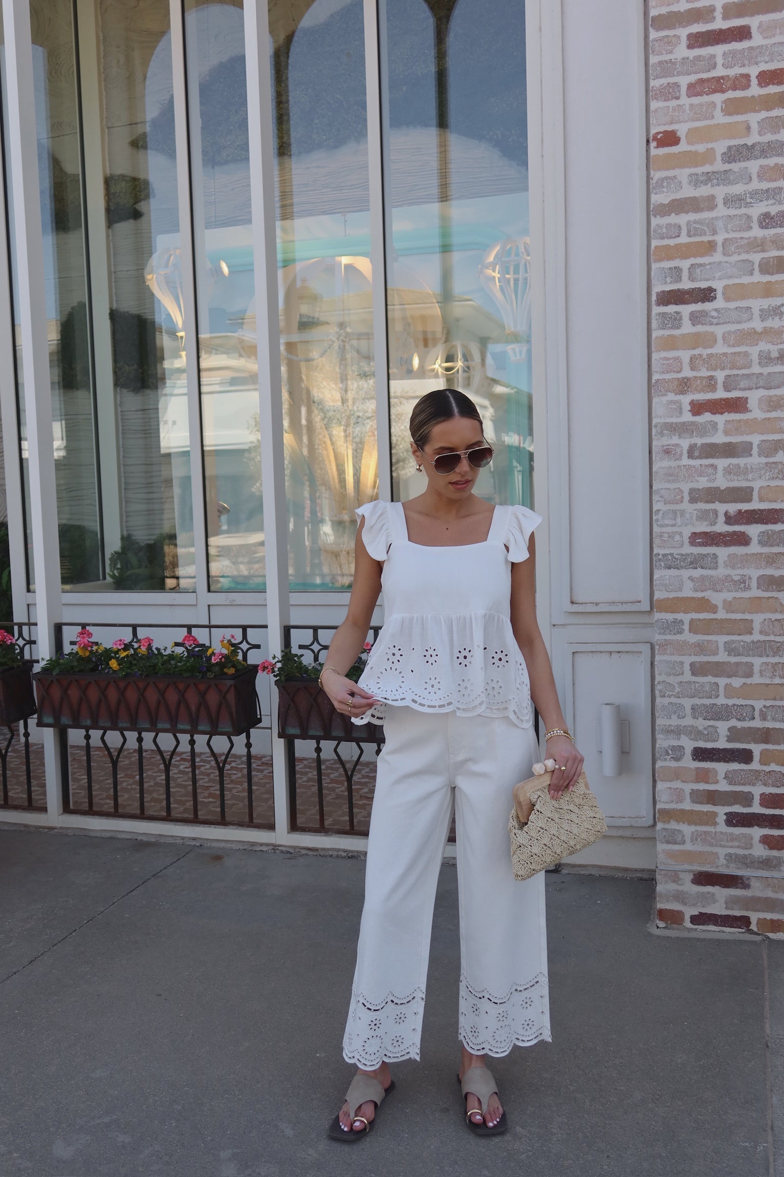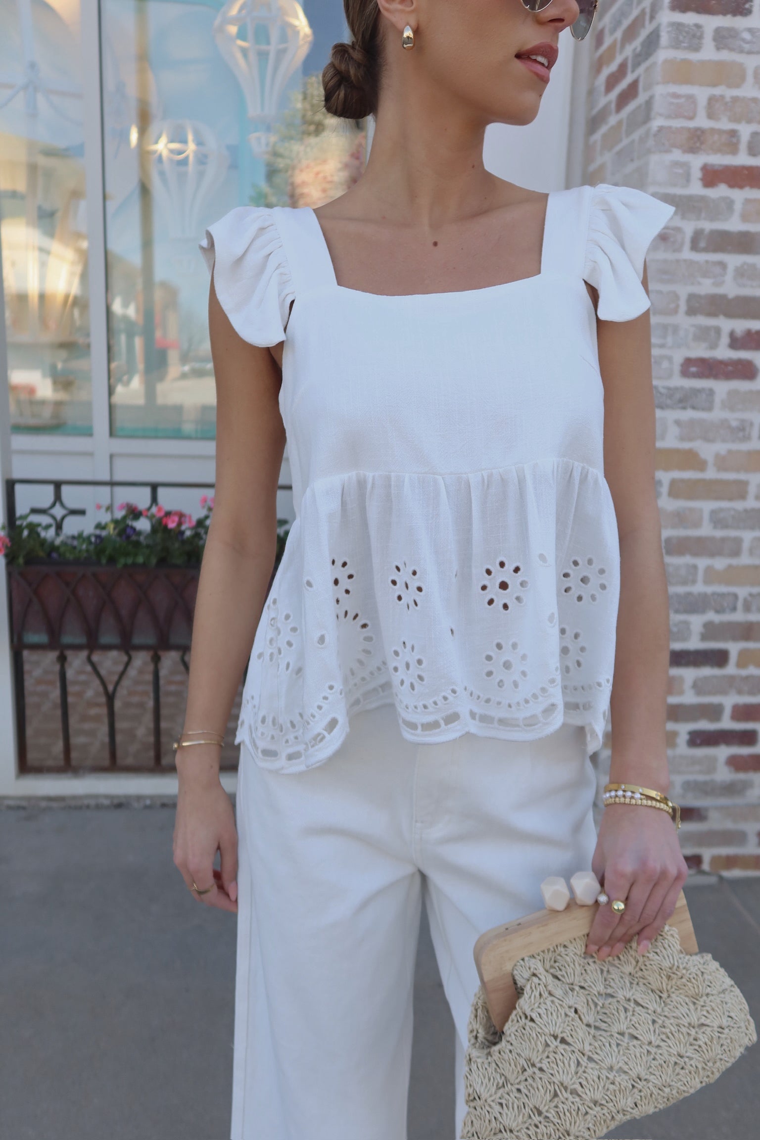 Taytum White Eyelet Cut Out Peplum Top, Ruffle Sleeves Top, Mid-length Top, White Top, Peplum Top, Fitted Bust Top, Lightweight and Breathable Material, Button Closure In Back, Monochromatic Buttons, Square Neckline, Eyelet Cut Out Detail, Timeless Top, Staple Fashion Piece, Summer and Spring Must Have, Matching Set, Top and Pant Set, Vacation, On The Weekend, Concerts.Â