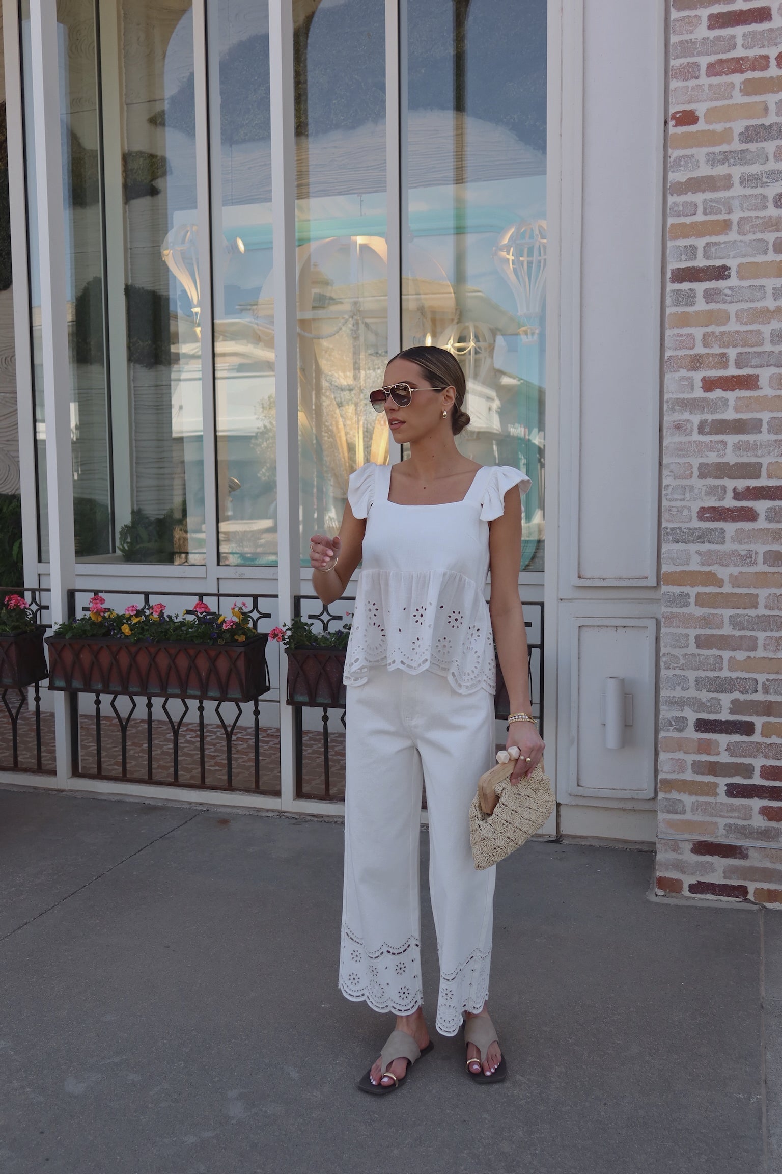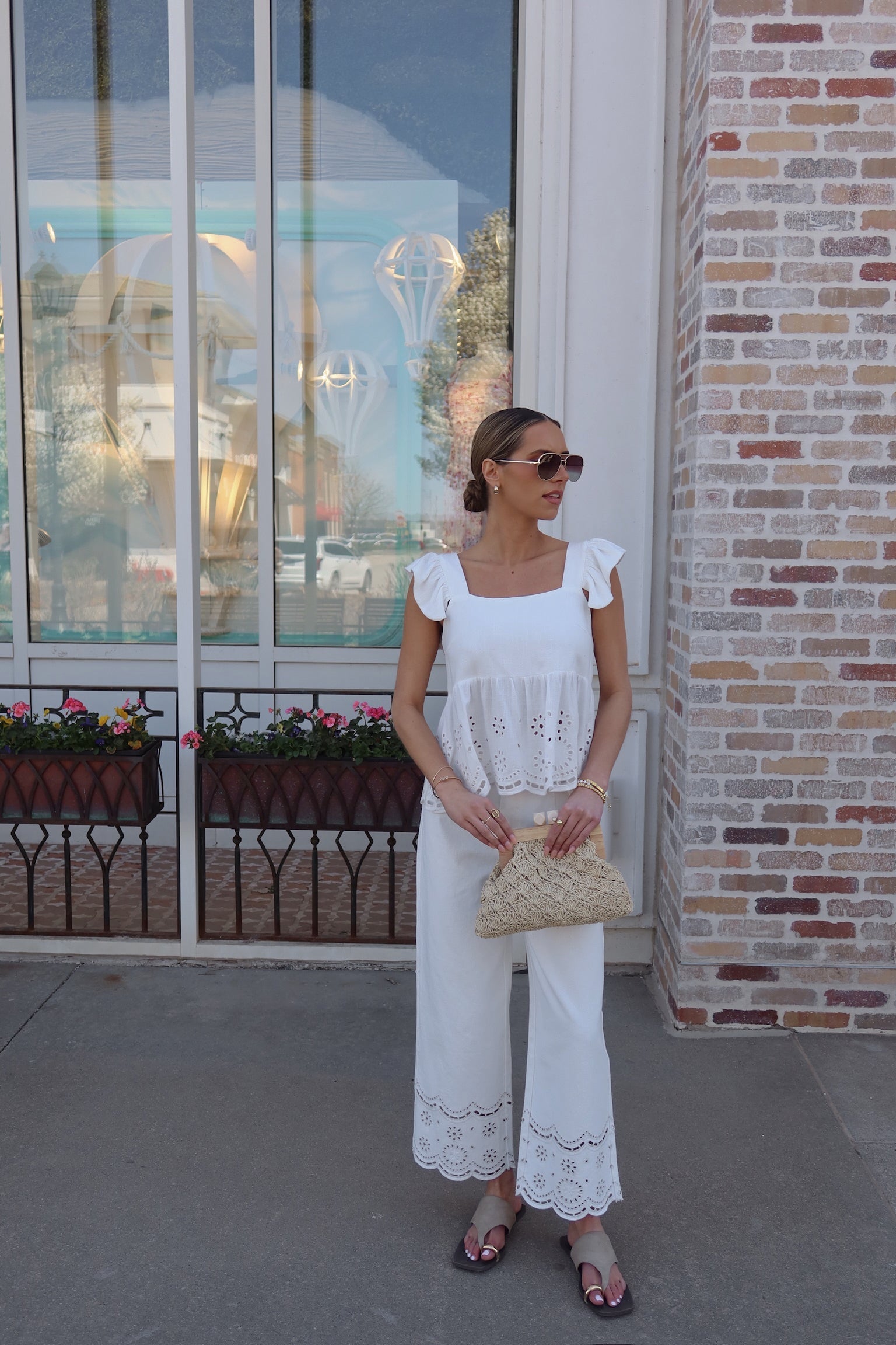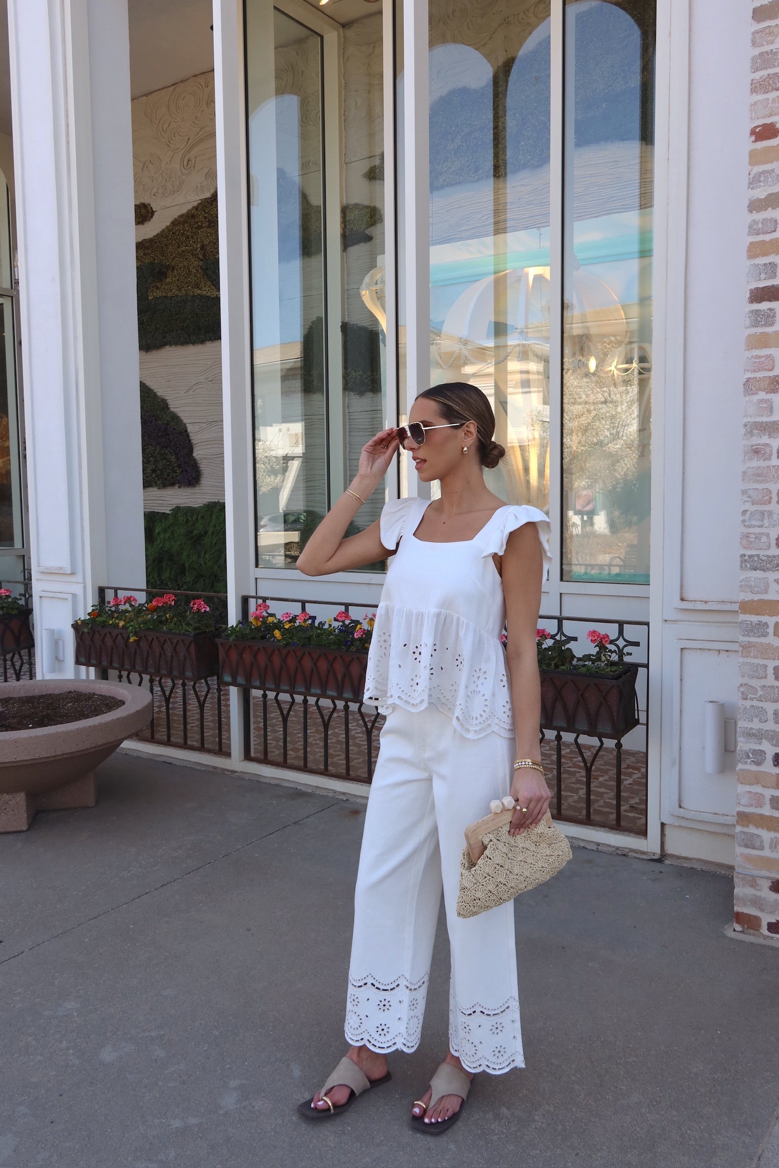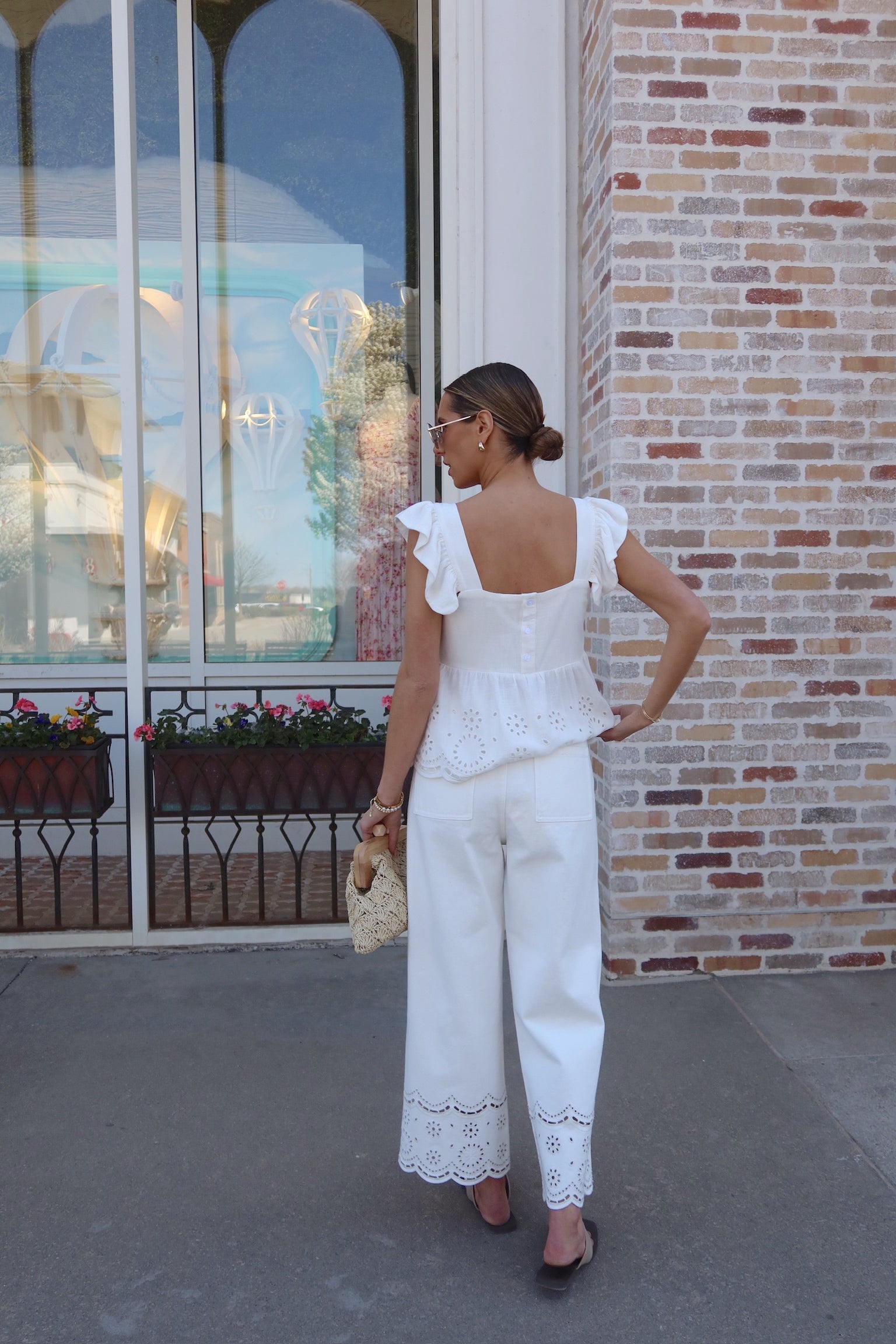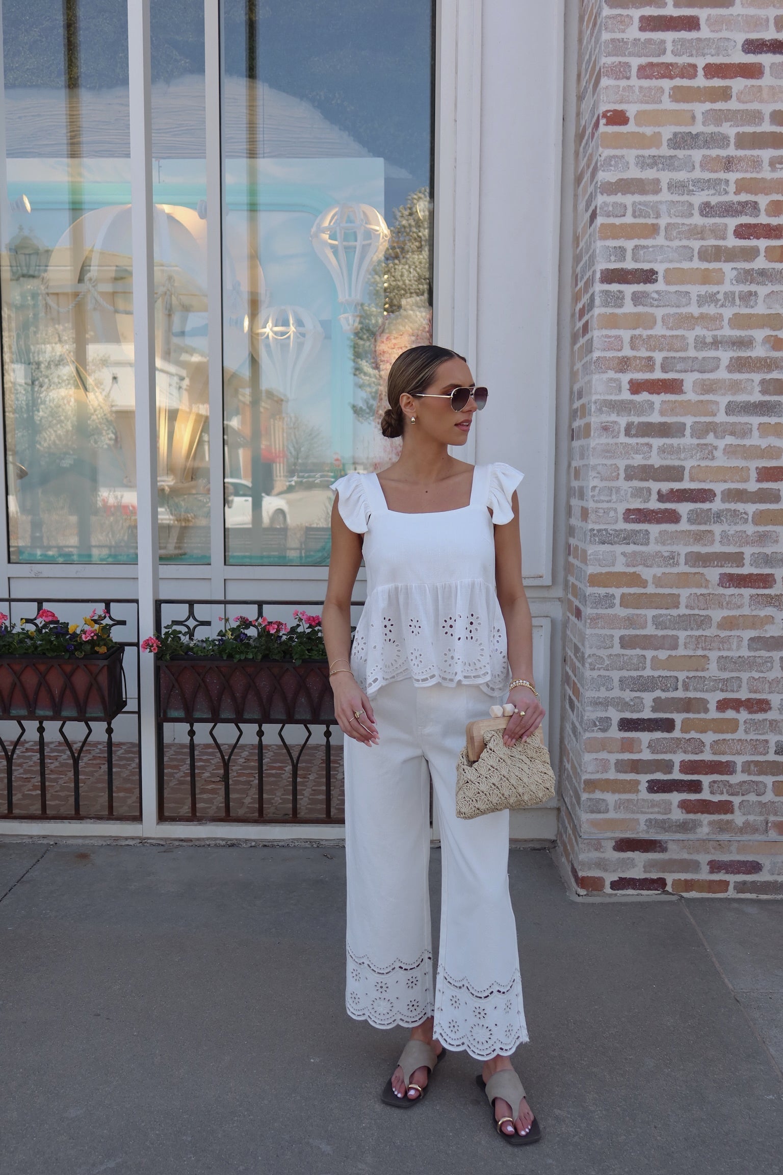 Taytum White Eyelet Cut Out Peplum Top, Ruffle Sleeves Top, Mid-length Top, White Top, Peplum Top, Fitted Bust Top, Lightweight and Breathable Material, Button Closure In Back, Monochromatic Buttons, Square Neckline, Eyelet Cut Out Detail, Timeless Top, Staple Fashion Piece, Summer and Spring Must Have, Matching Set, Top and Pant Set, Vacation, On The Weekend, Concerts.Â
