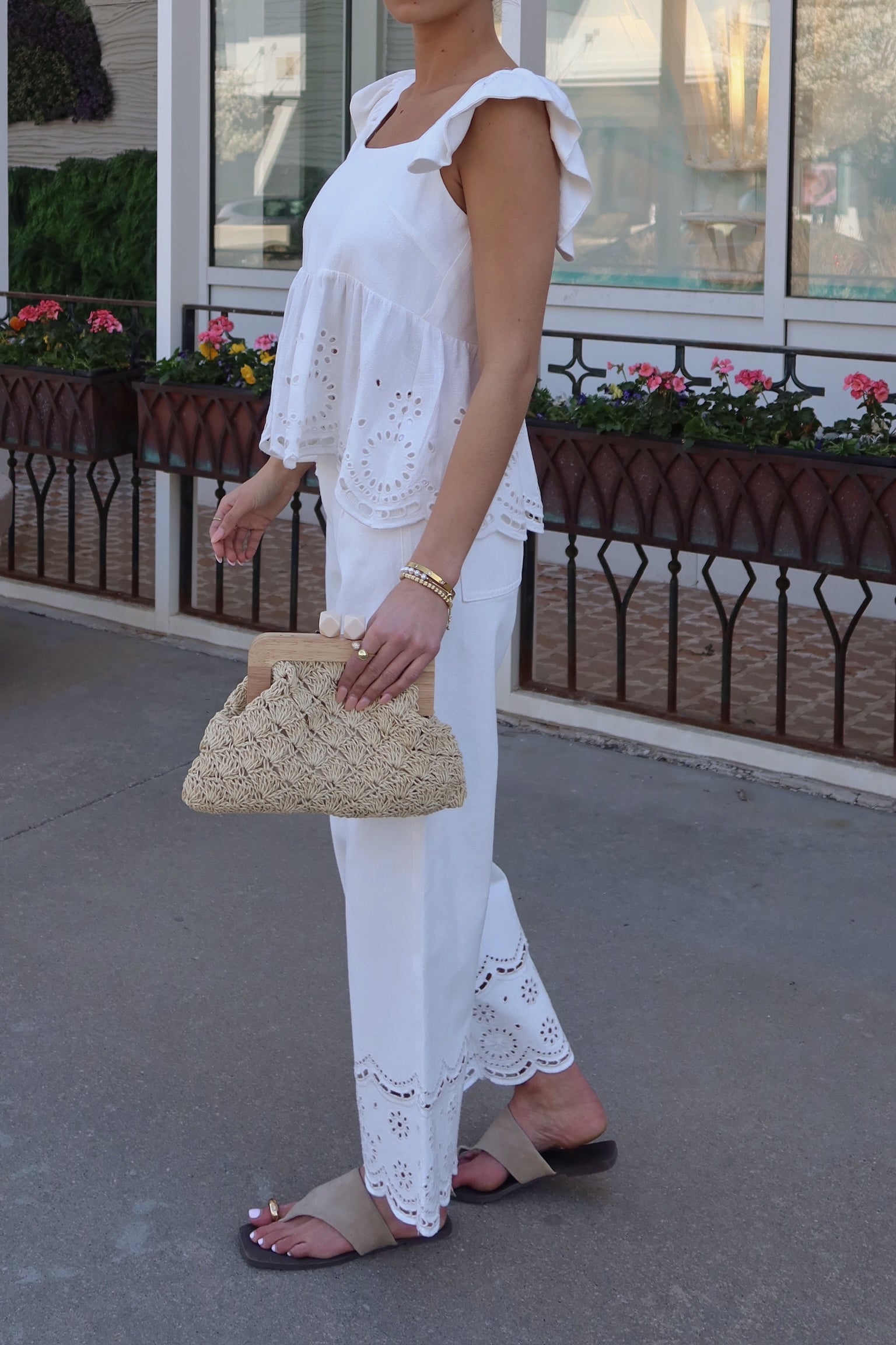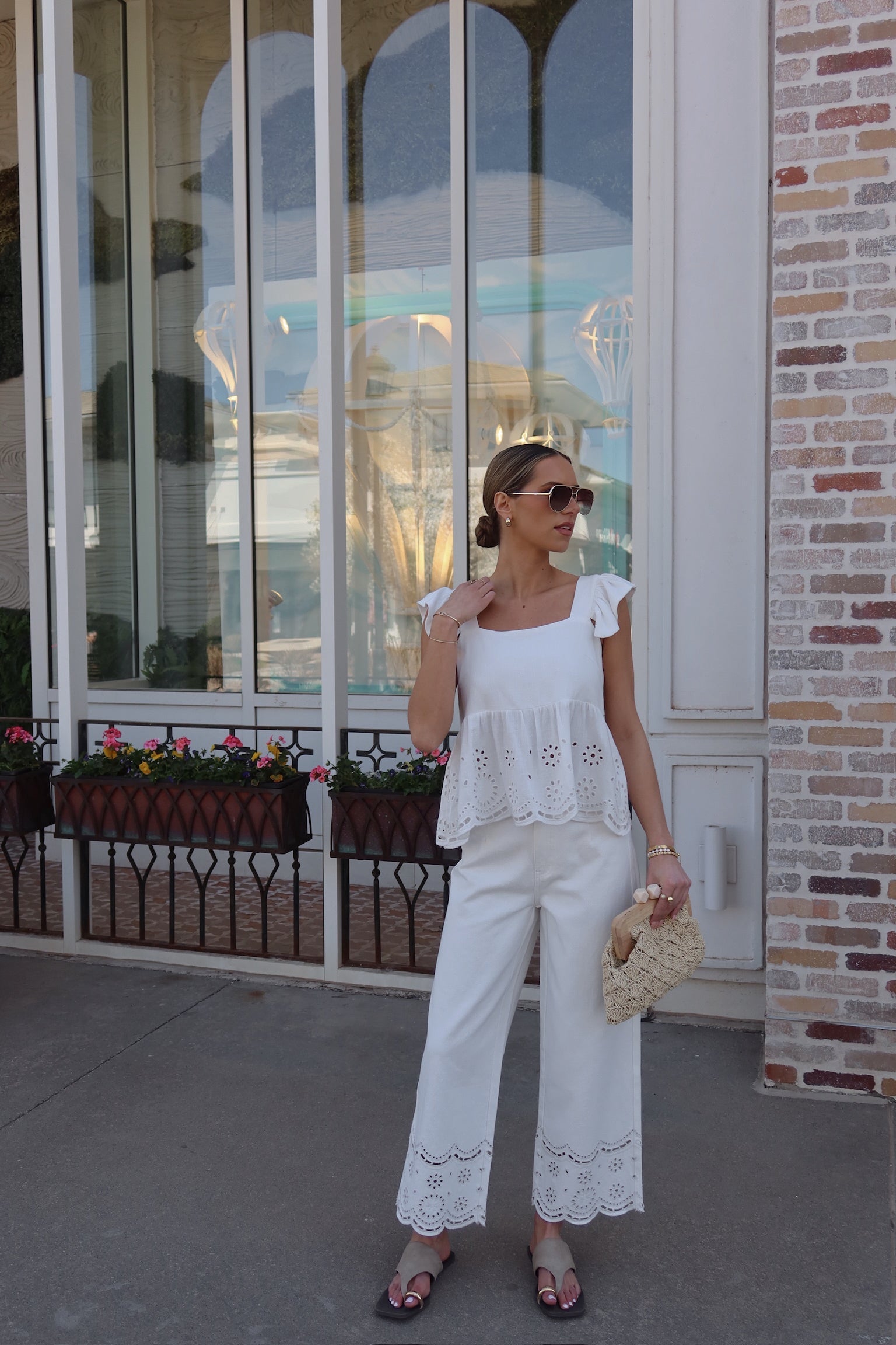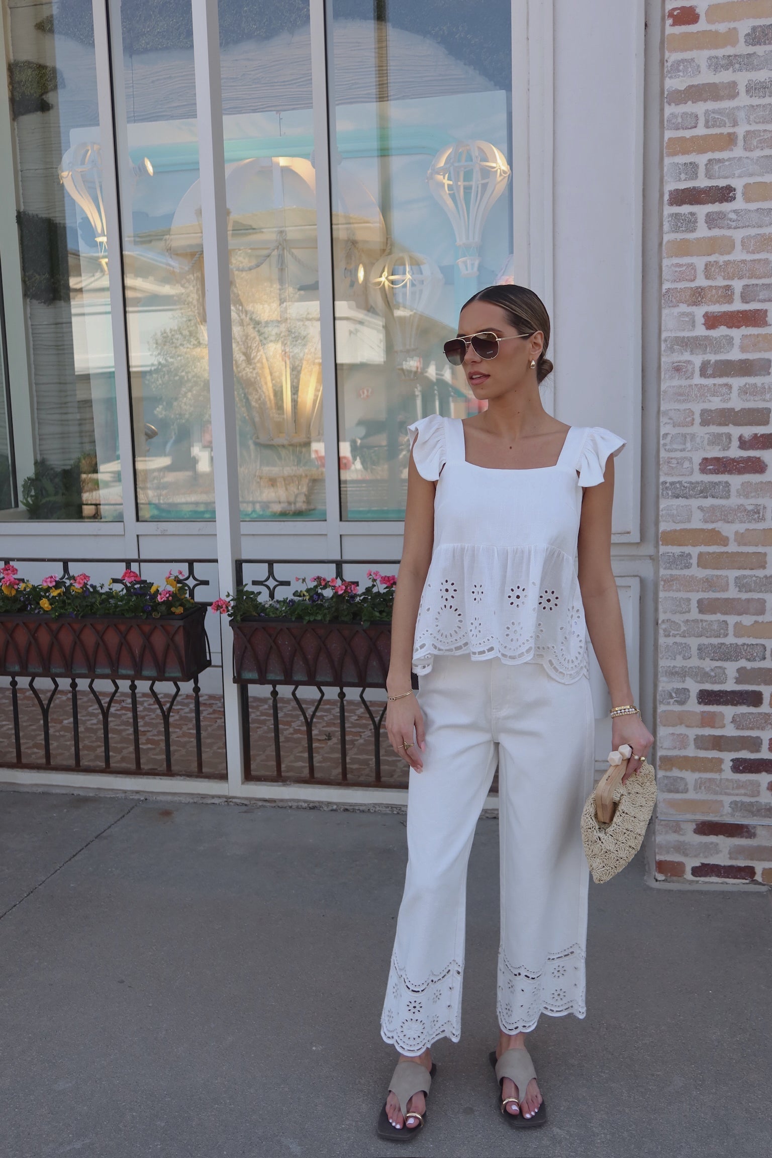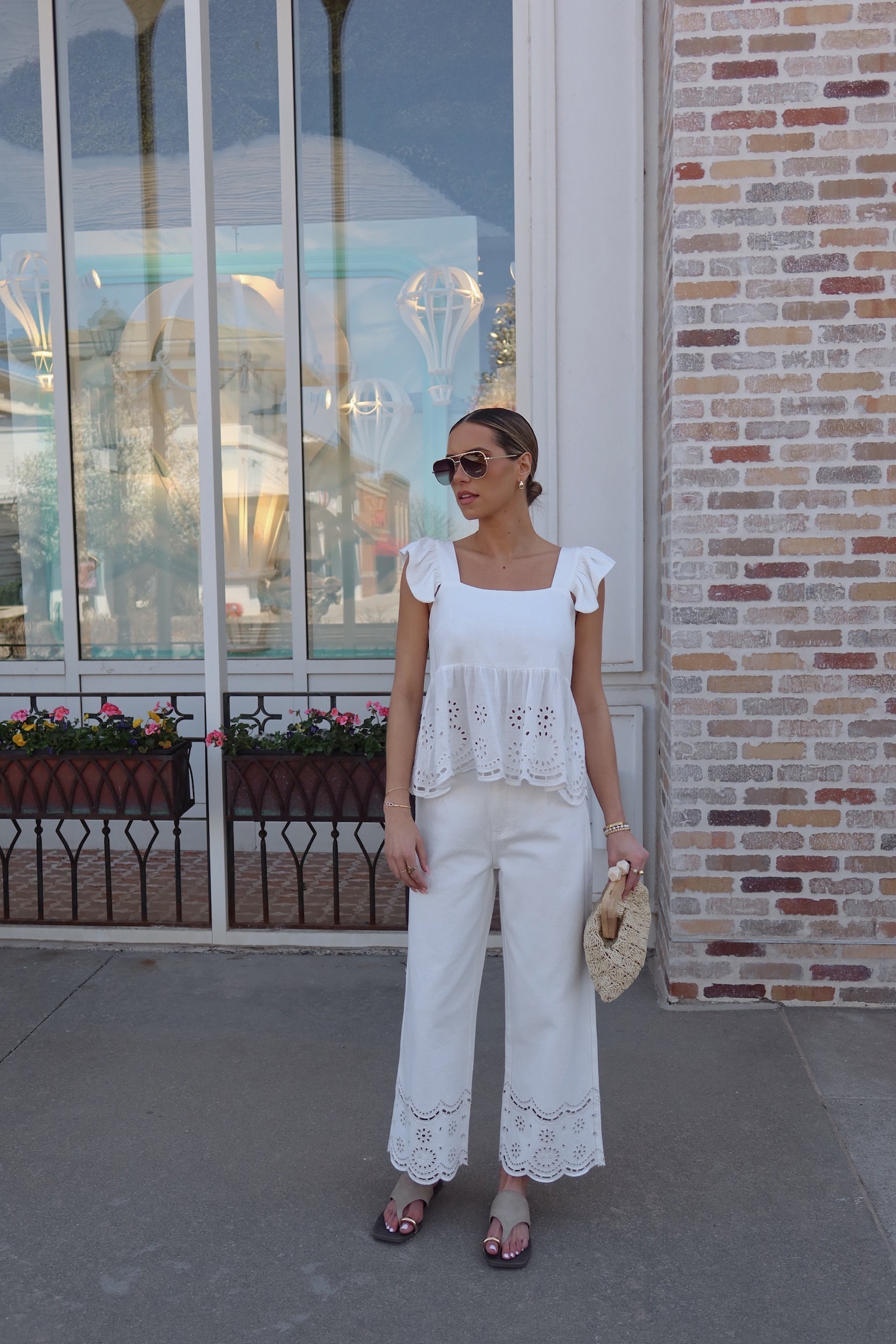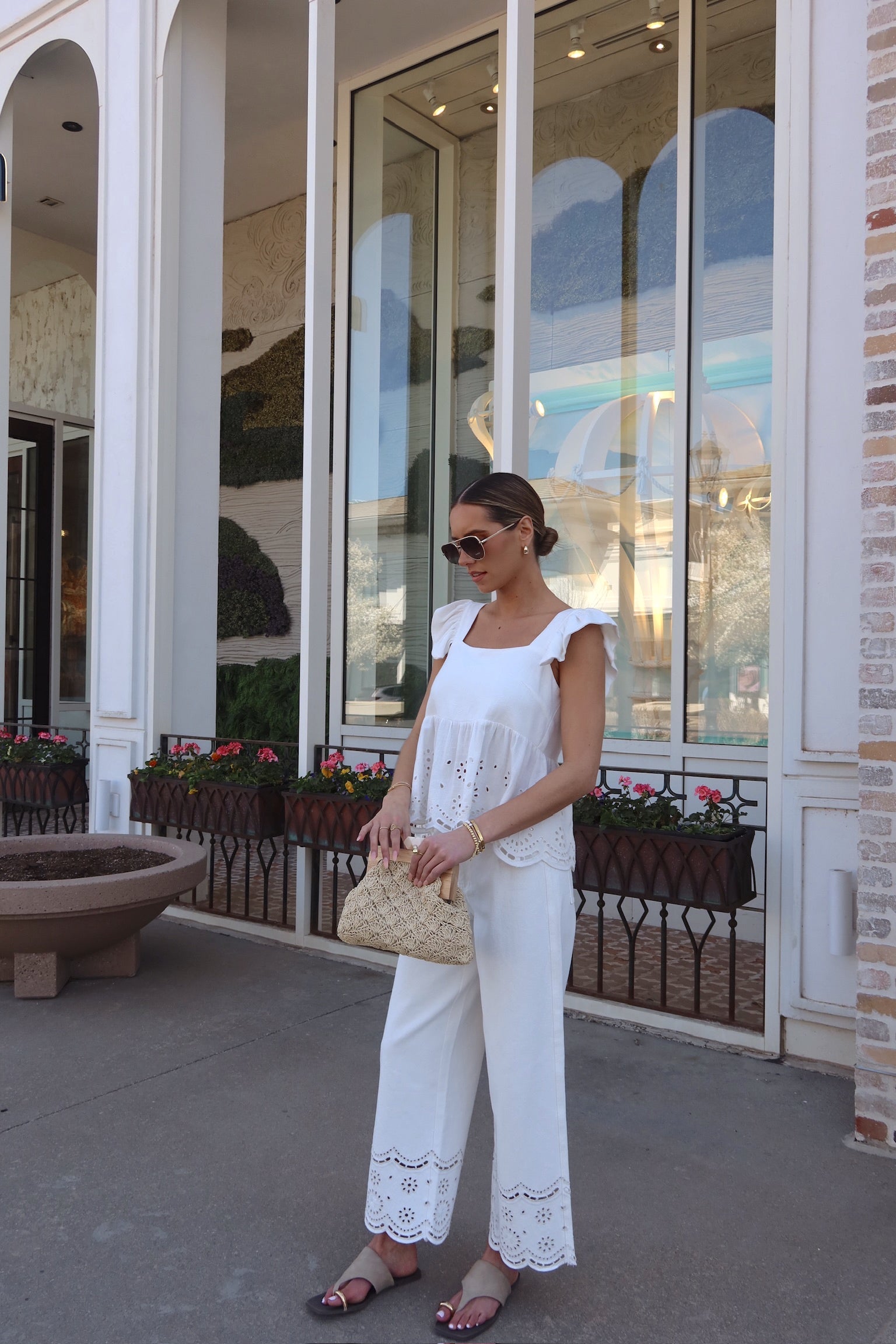Taytum White Eyelet Cut Out Peplum Top, Ruffle Sleeves Top, Mid-length Top, White Top, Peplum Top, Fitted Bust Top, Lightweight and Breathable Material, Button Closure In Back, Monochromatic Buttons, Square Neckline, Eyelet Cut Out Detail, Timeless Top, Staple Fashion Piece, Summer and Spring Must Have, Matching Set, Top and Pant Set, Vacation, On The Weekend, Concerts.Â