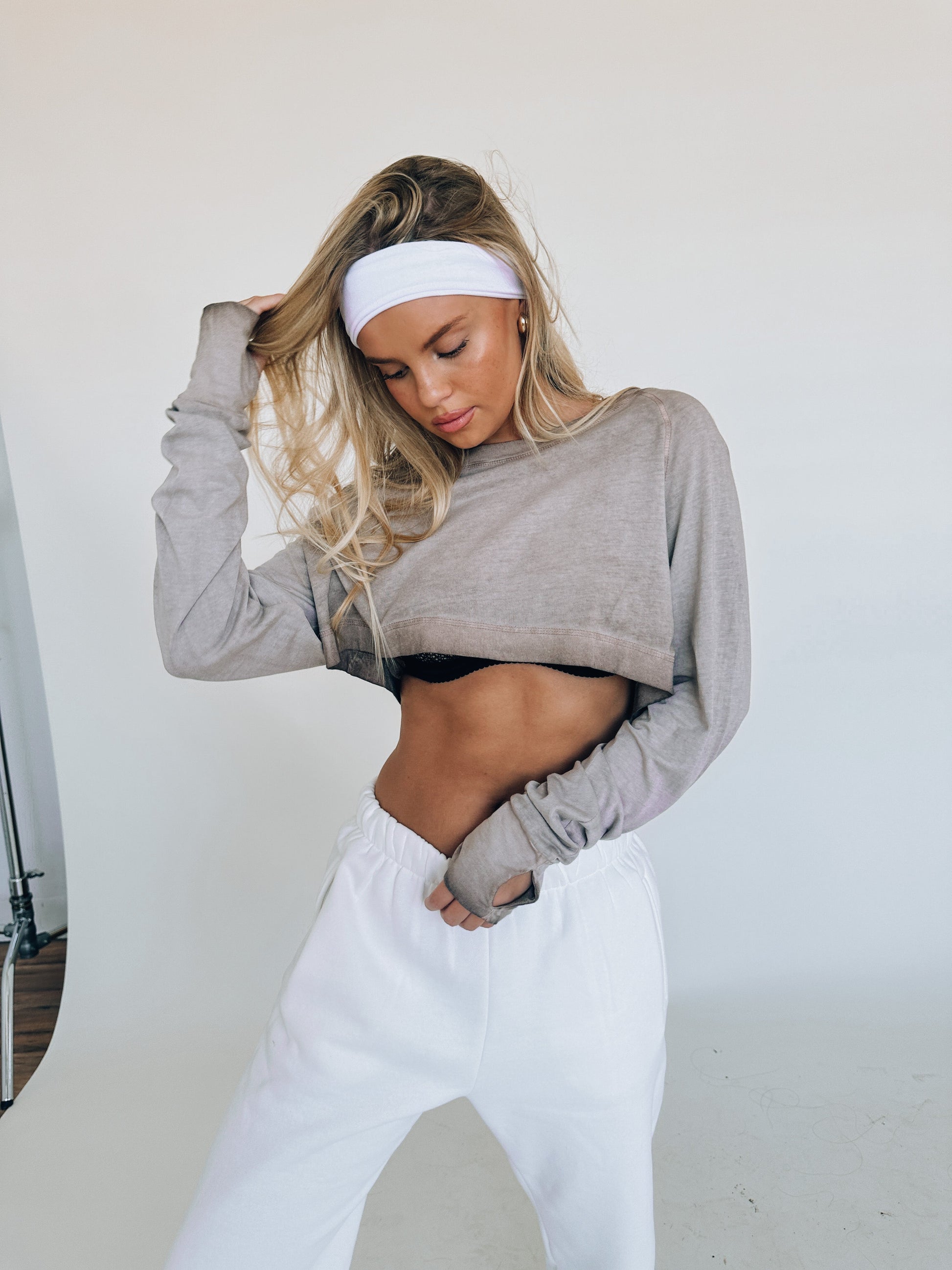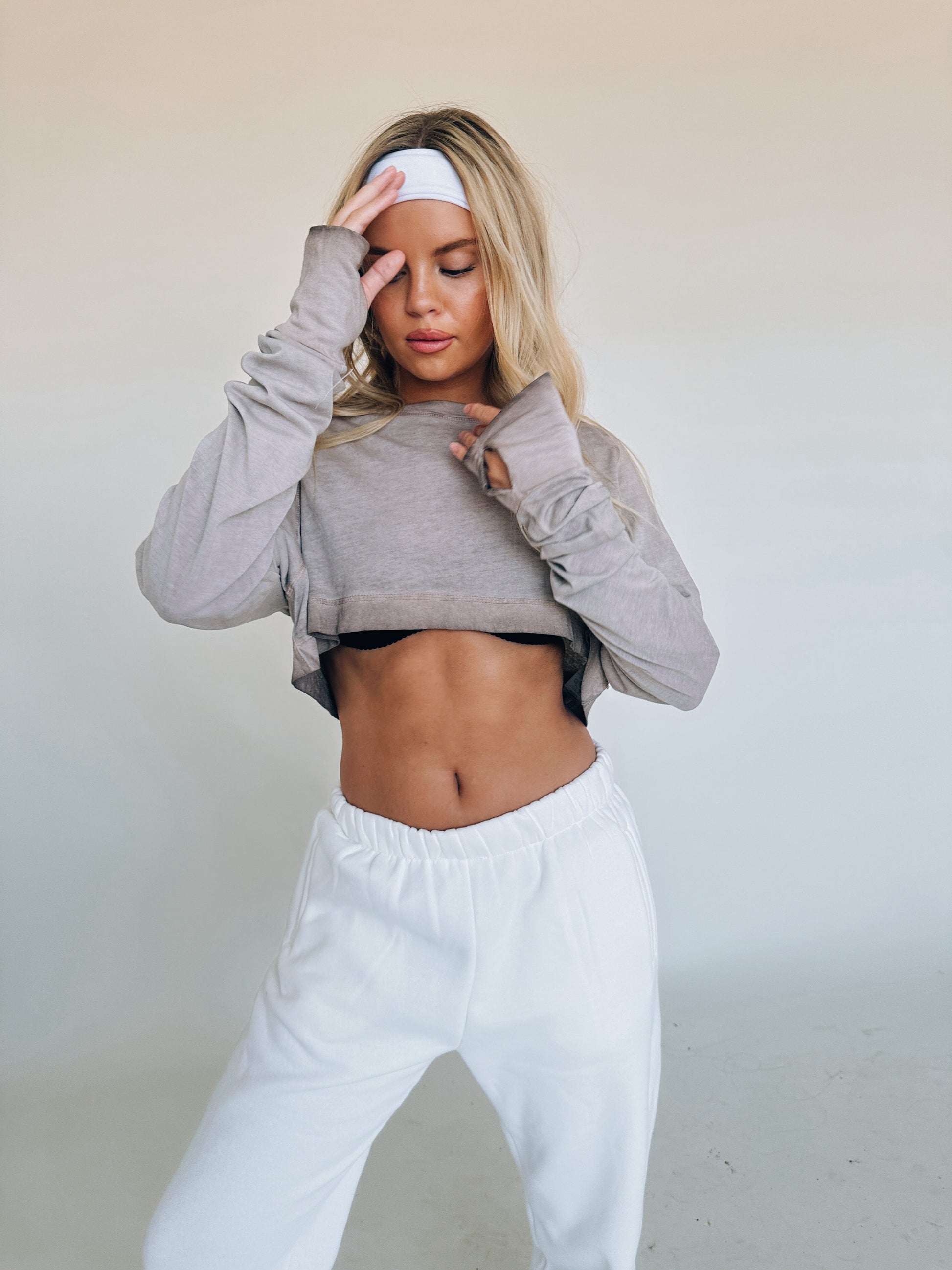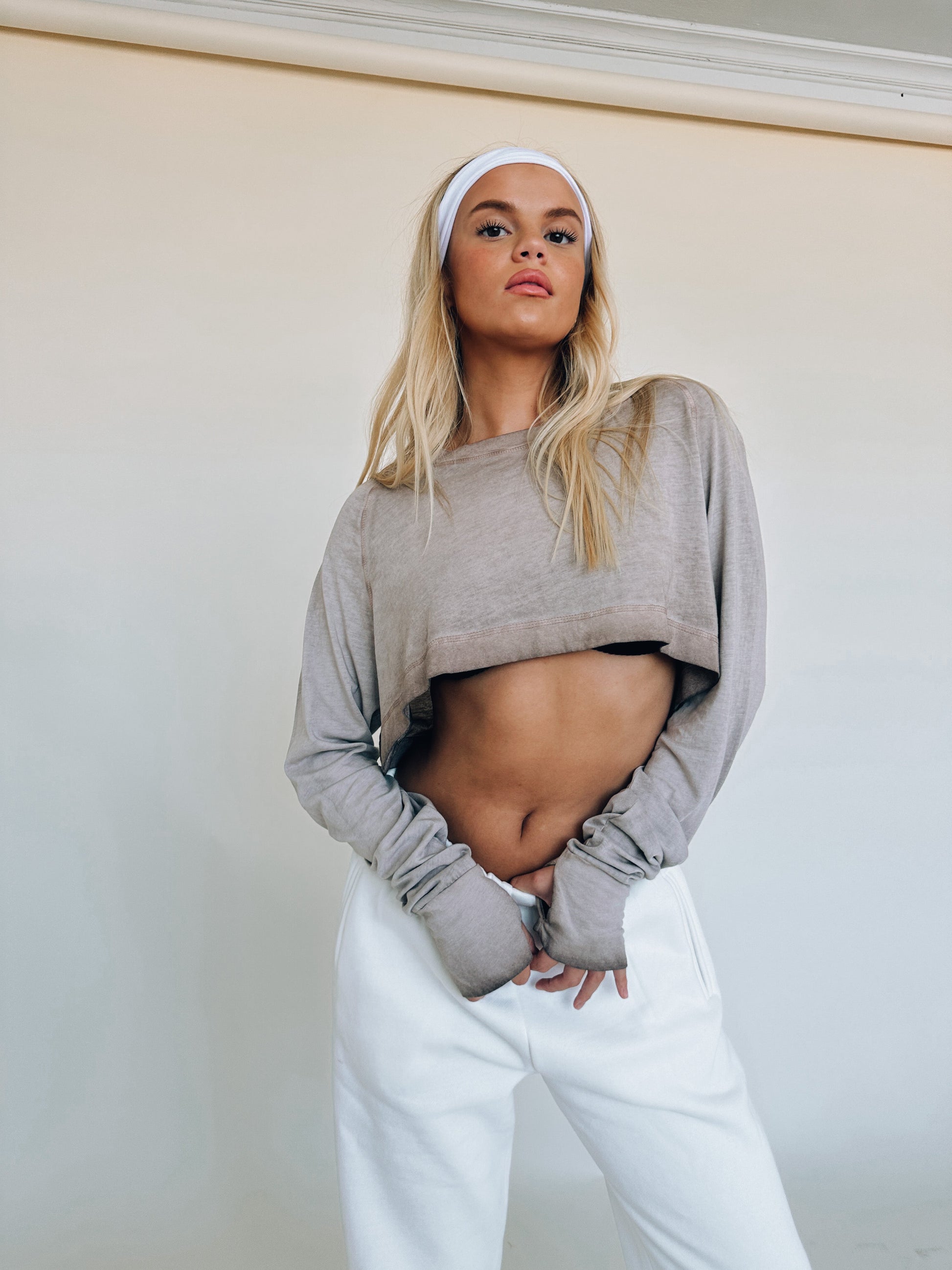 Our Aurora Long Sleeve Crop Top is a faded brown colored crop top. This top features a round neckline, a boxy cropped silhouette, and has long sleeves with thumbholes. This top is the perfect top to wear in between seasons!