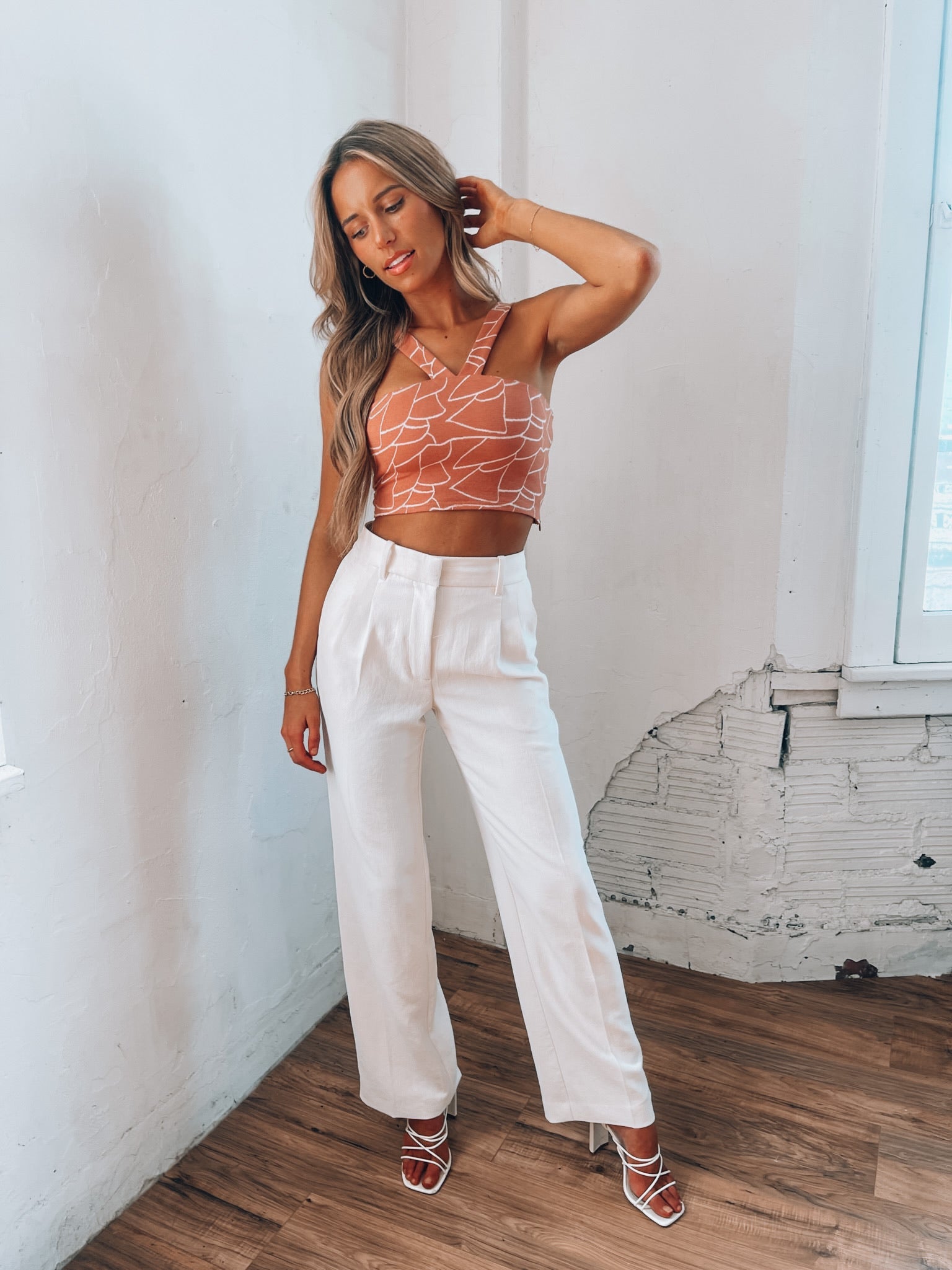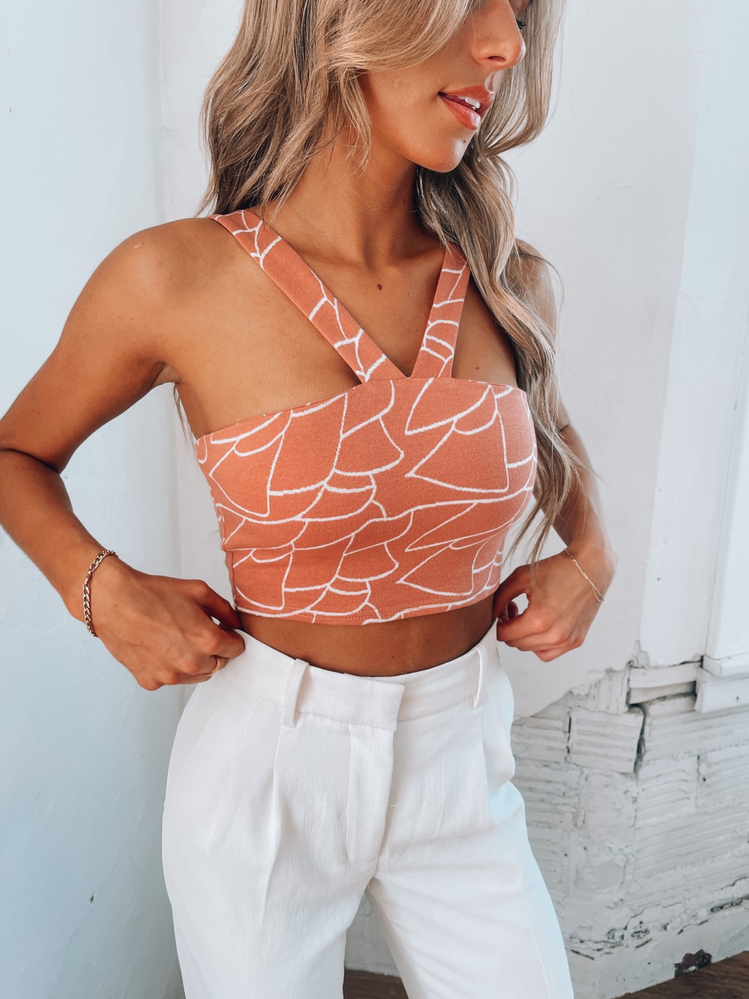 Our Avery V Strap Crop Top has a soft to the touch stretchy fabric. This Crop top is LINED on the inside and has a geometric design throughout. This would look so cute paired with jeans or jean shorts.