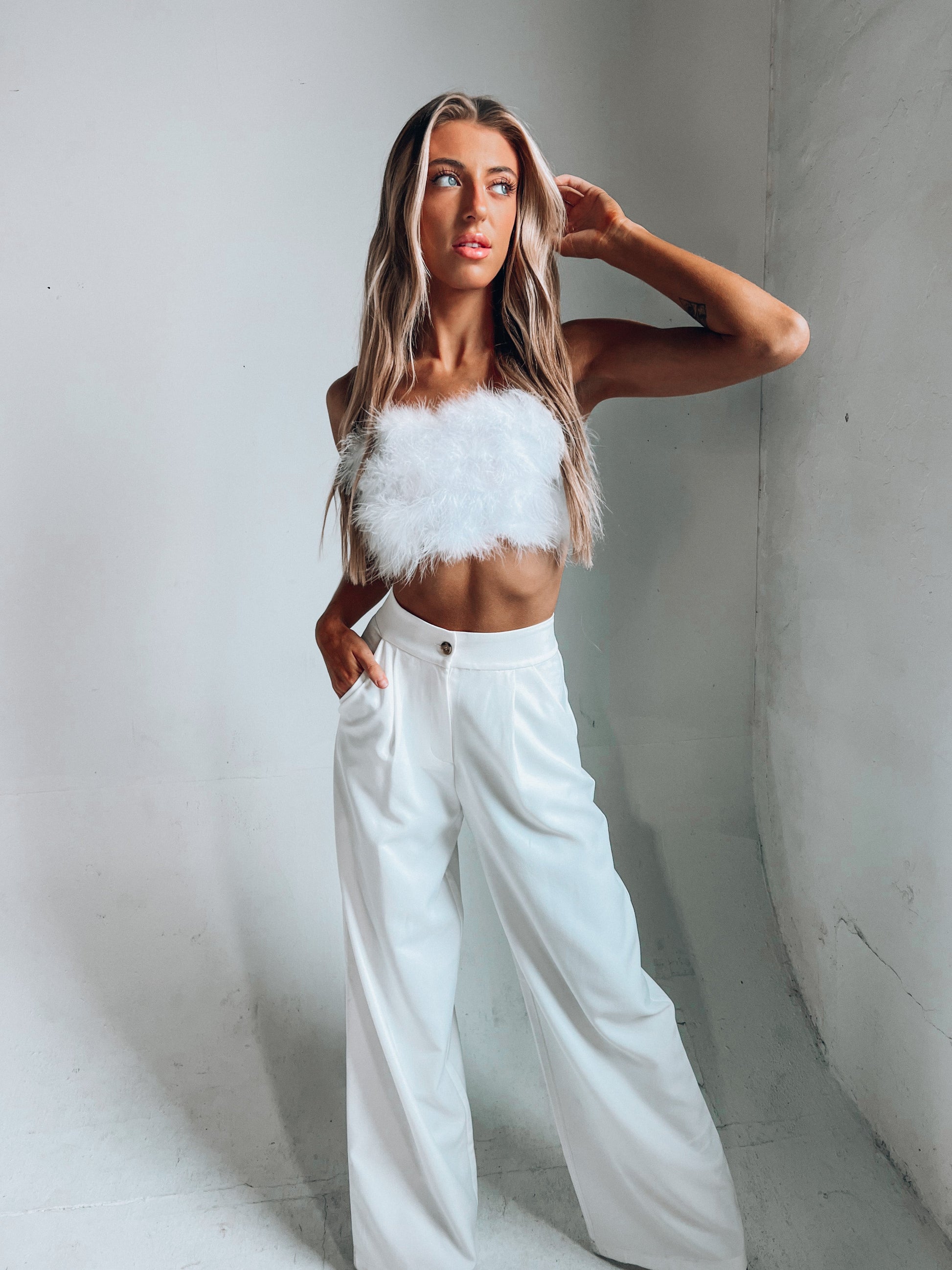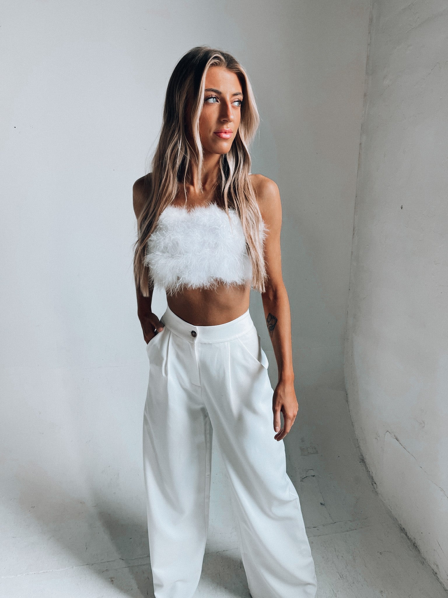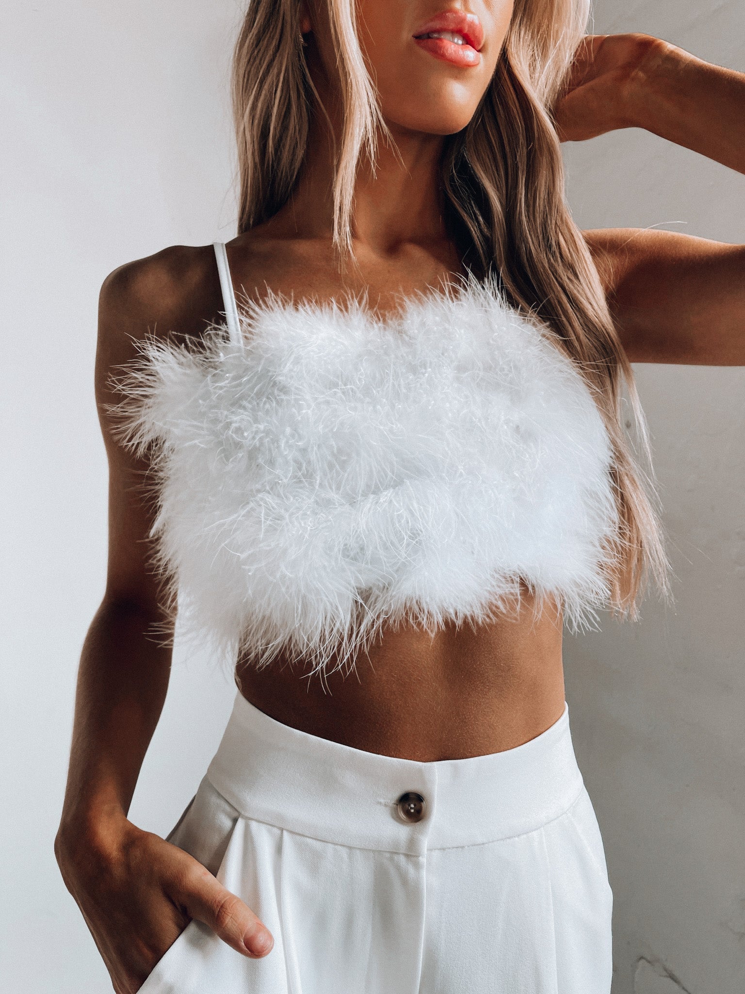 Our Feather Crop Top in Crisp is an ultra cropped top that features full feather embellishment on the  front andthin spaghetti straps.