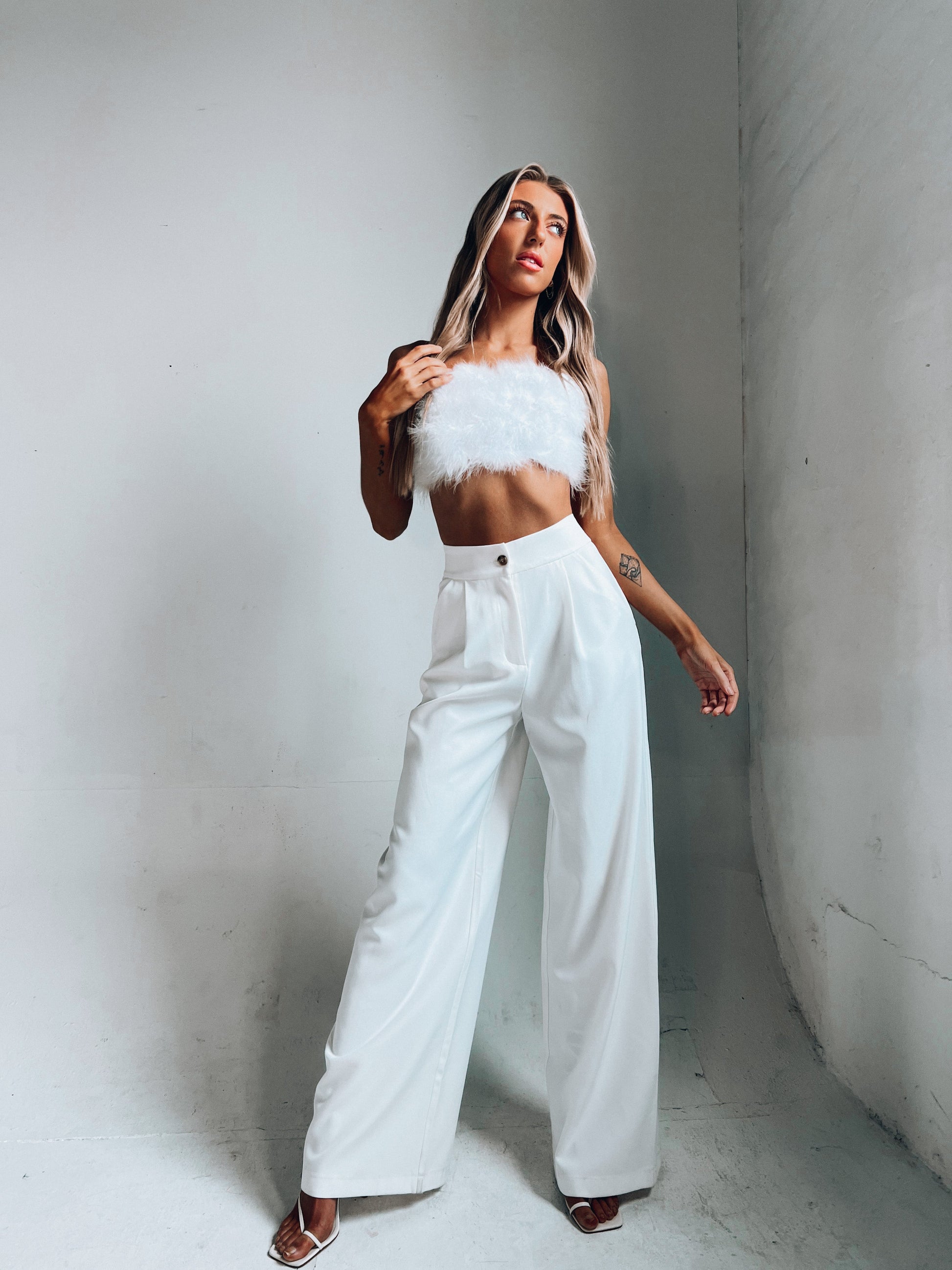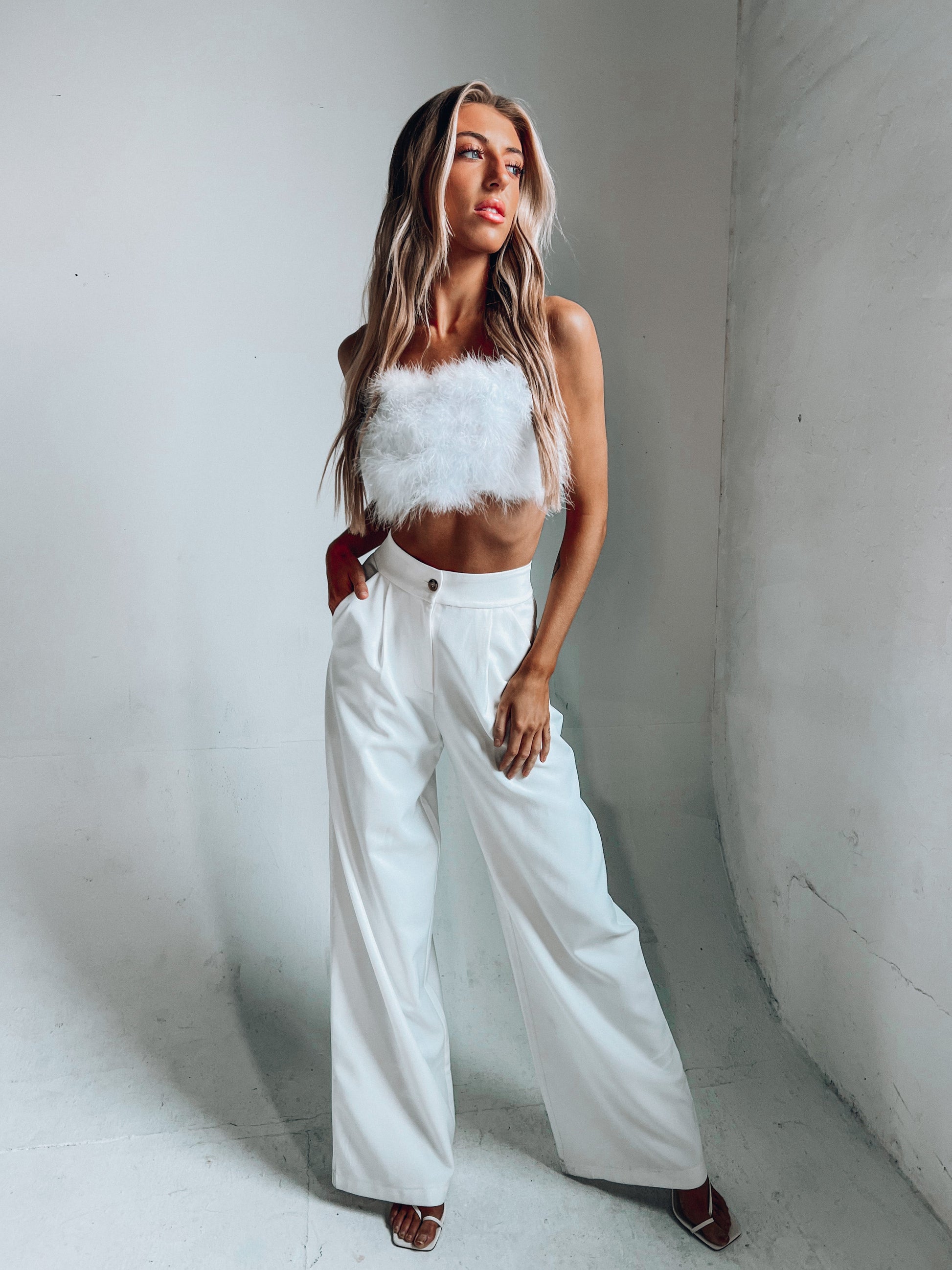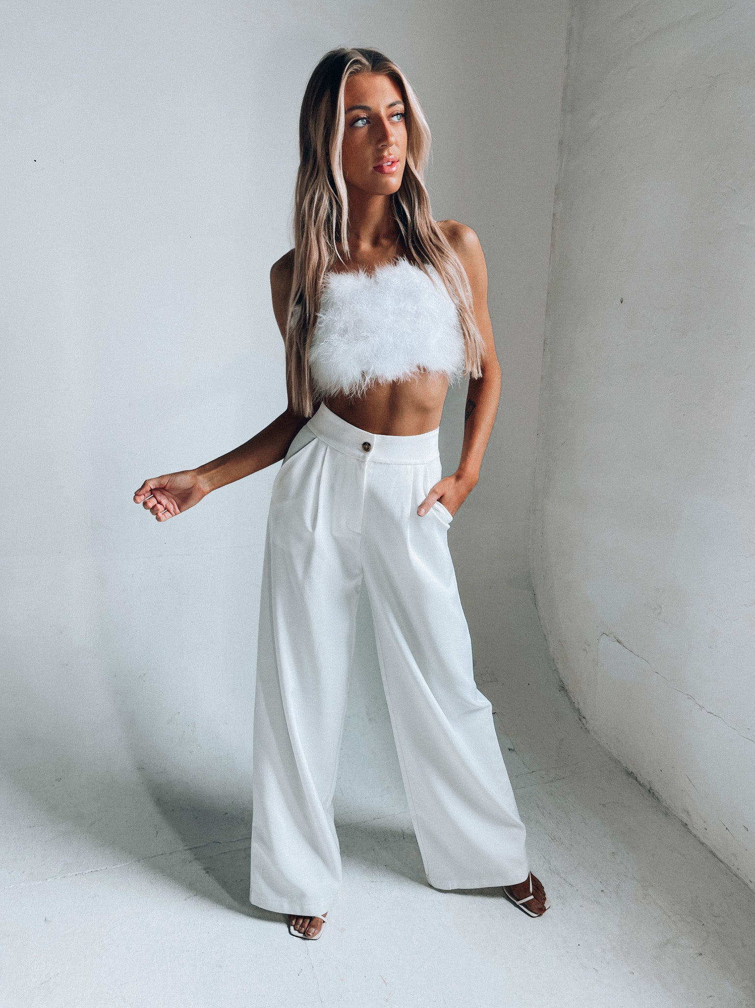 Our Feather Crop Top in Crisp is an ultra cropped top that features full feather embellishment on the  front andthin spaghetti straps.